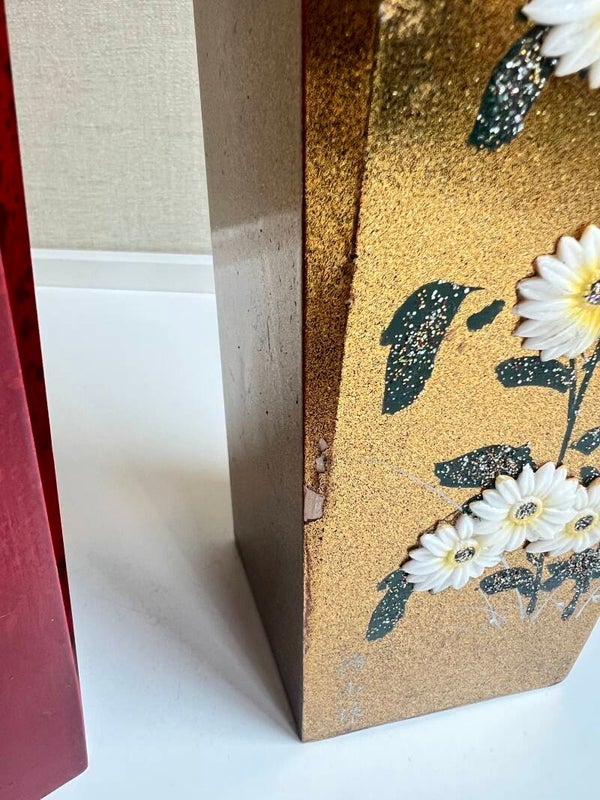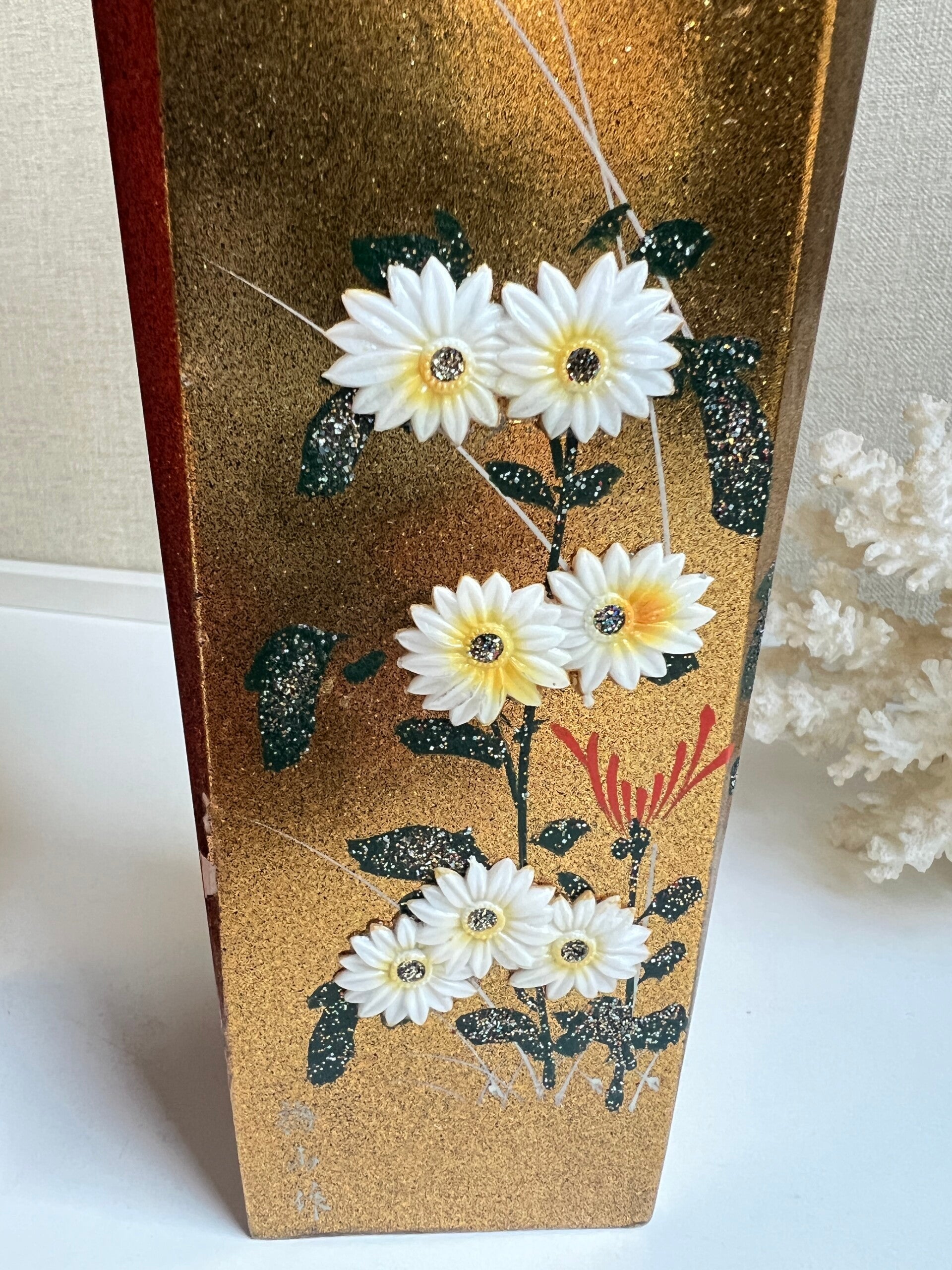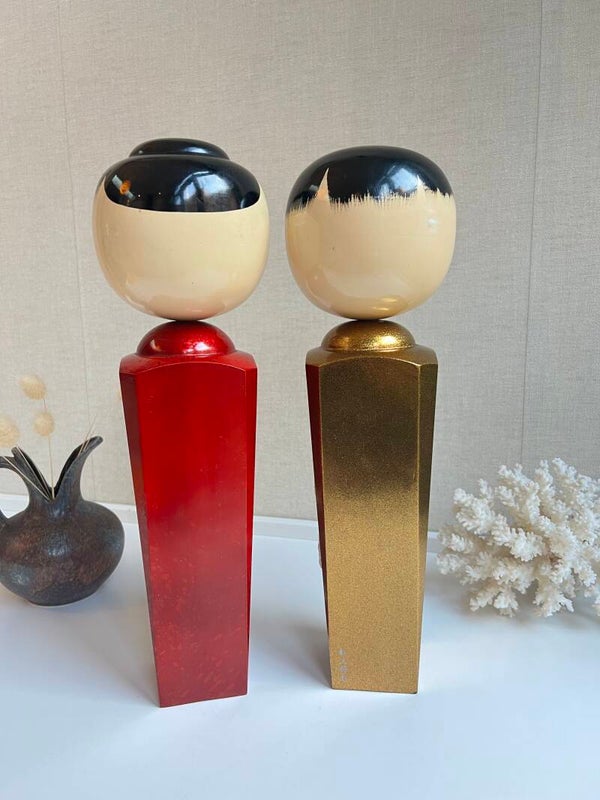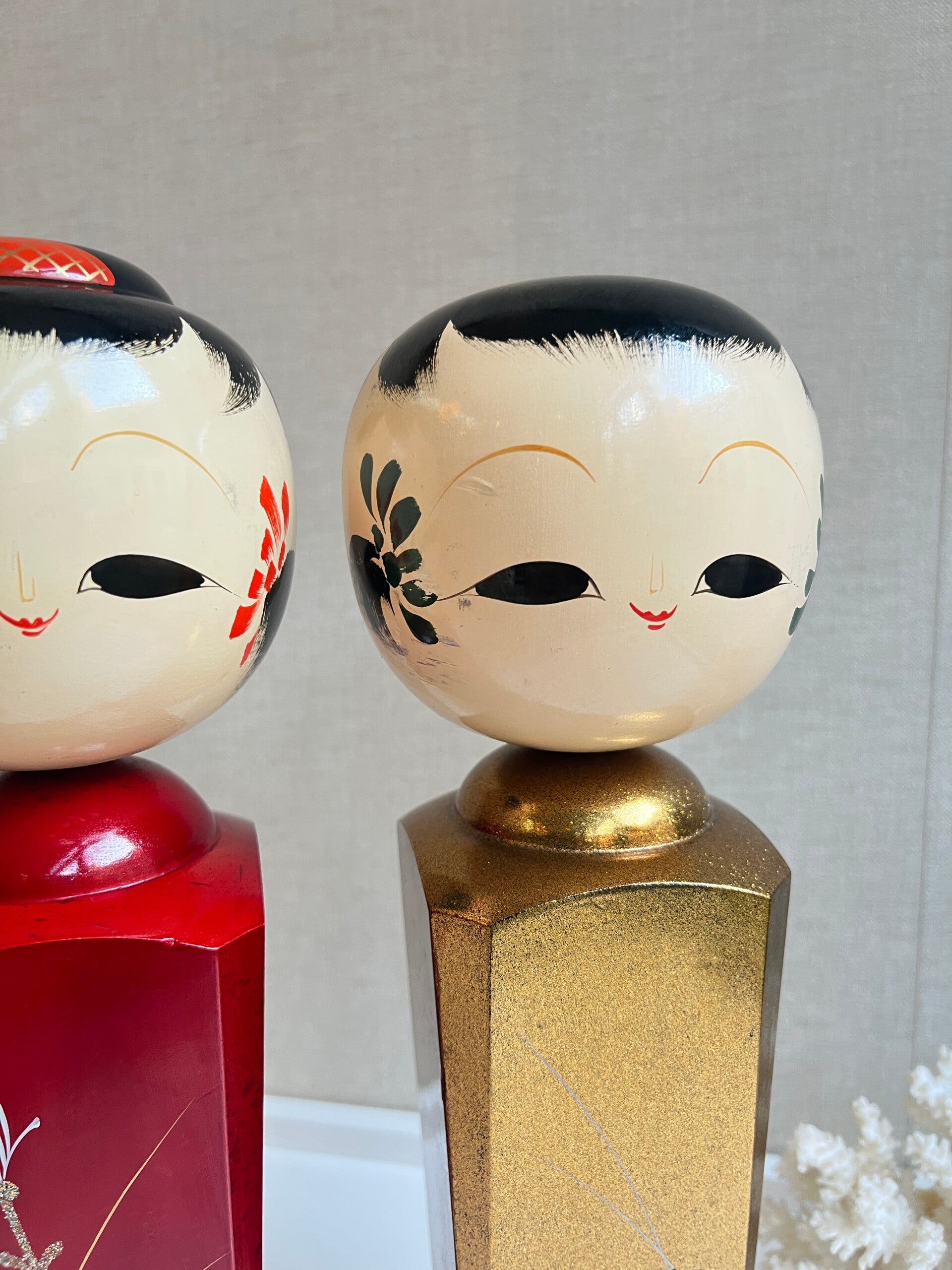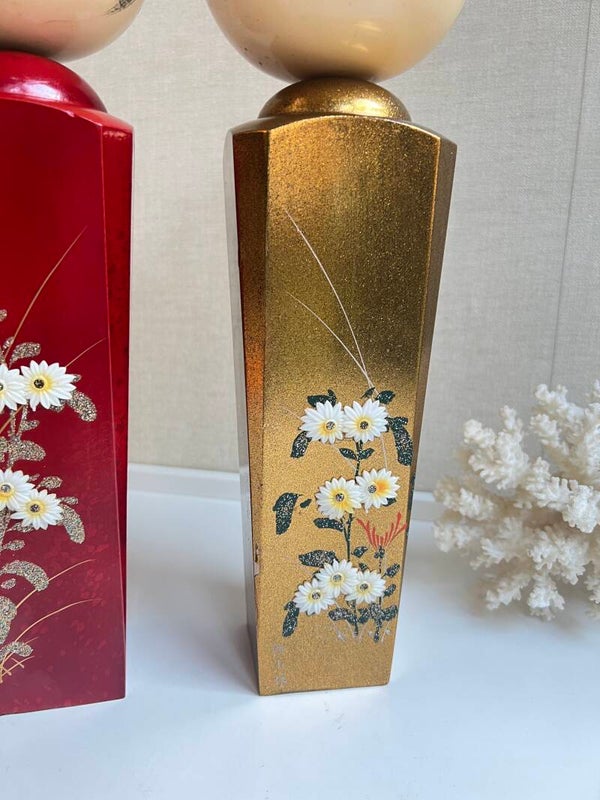 Geweldige grote houten Kokeshi poppen, afkomstig uit Japan. Dit model is heel speciaal omdat het versierd is met kunstoffen bloemen.
