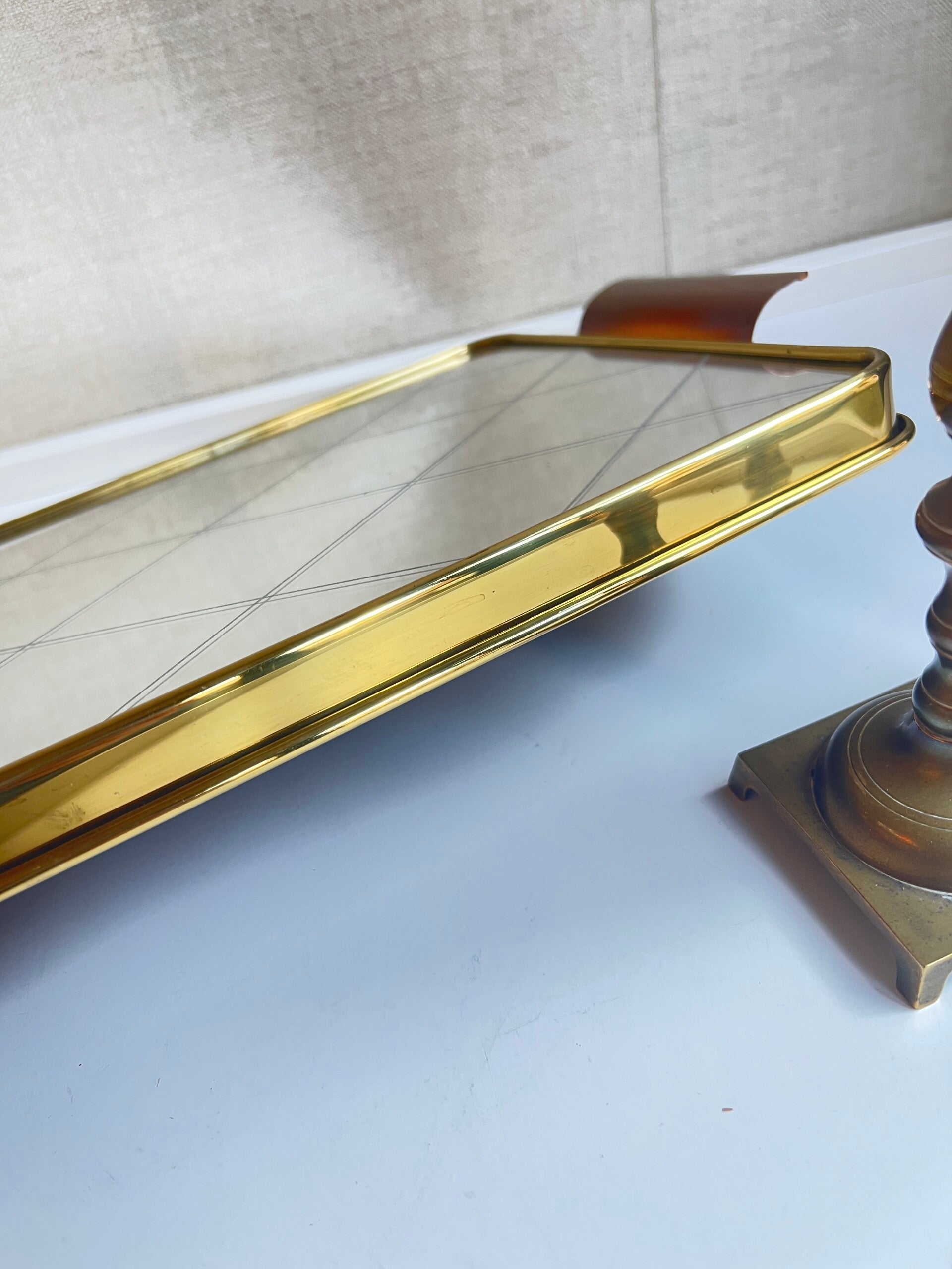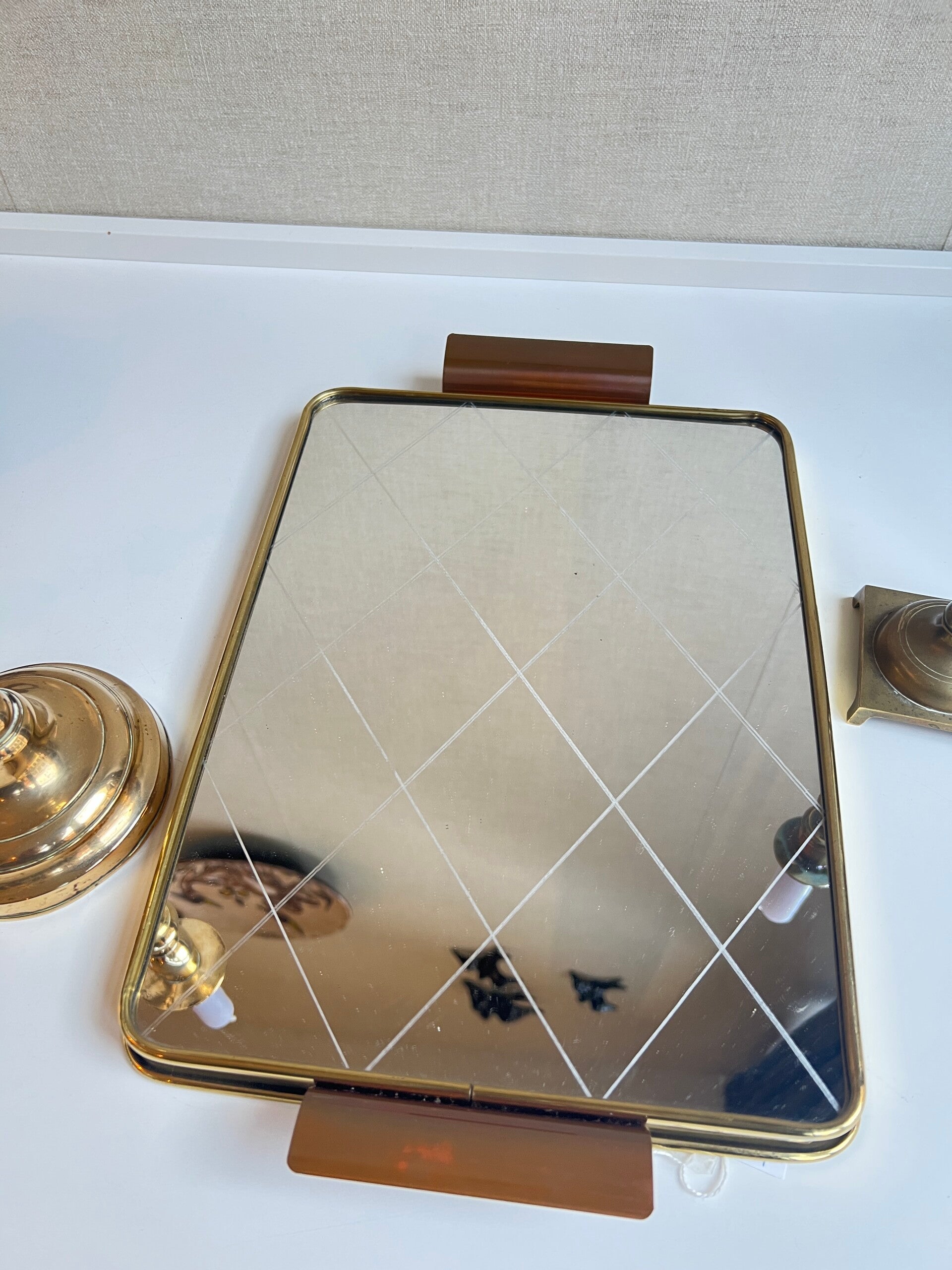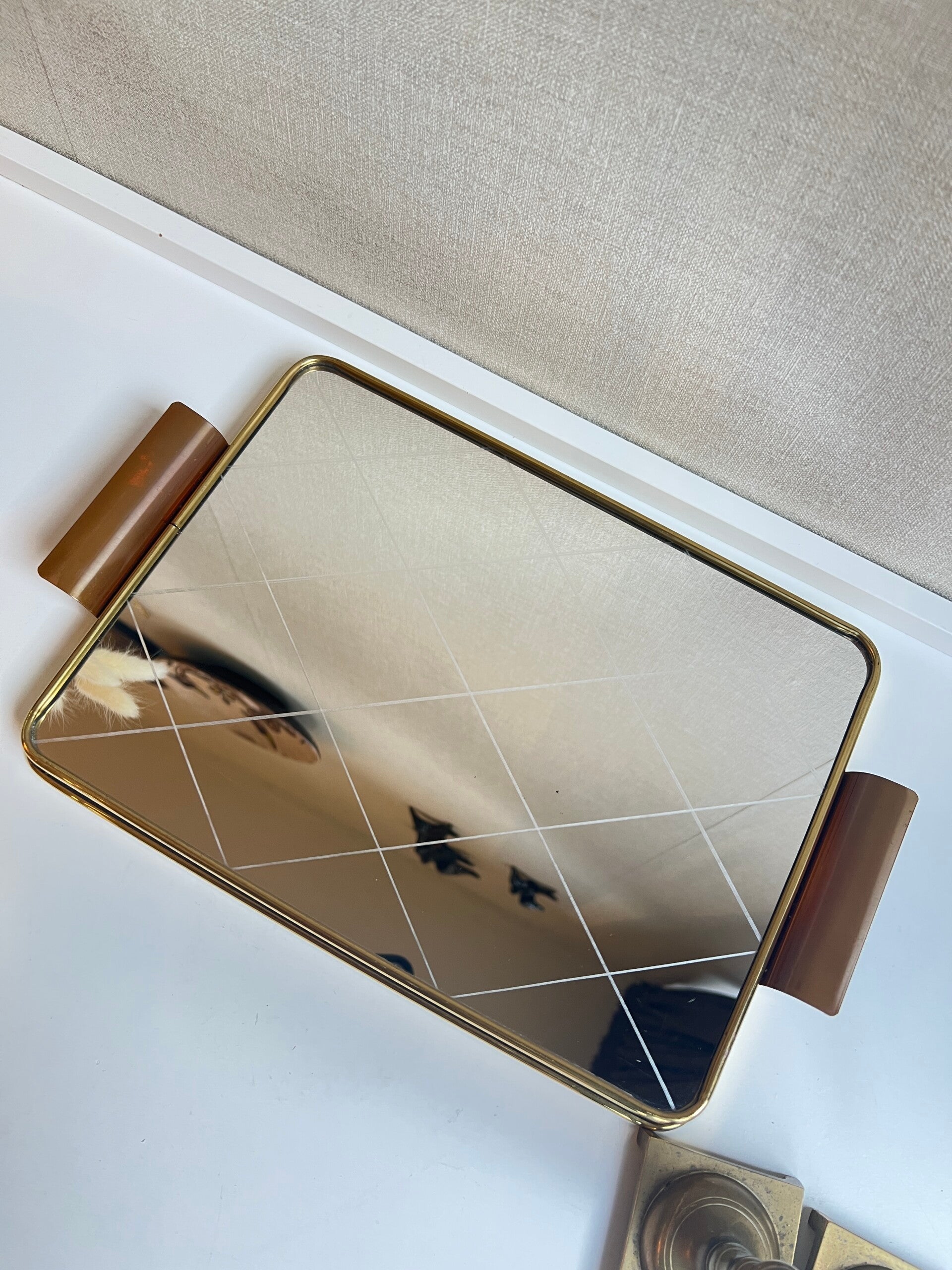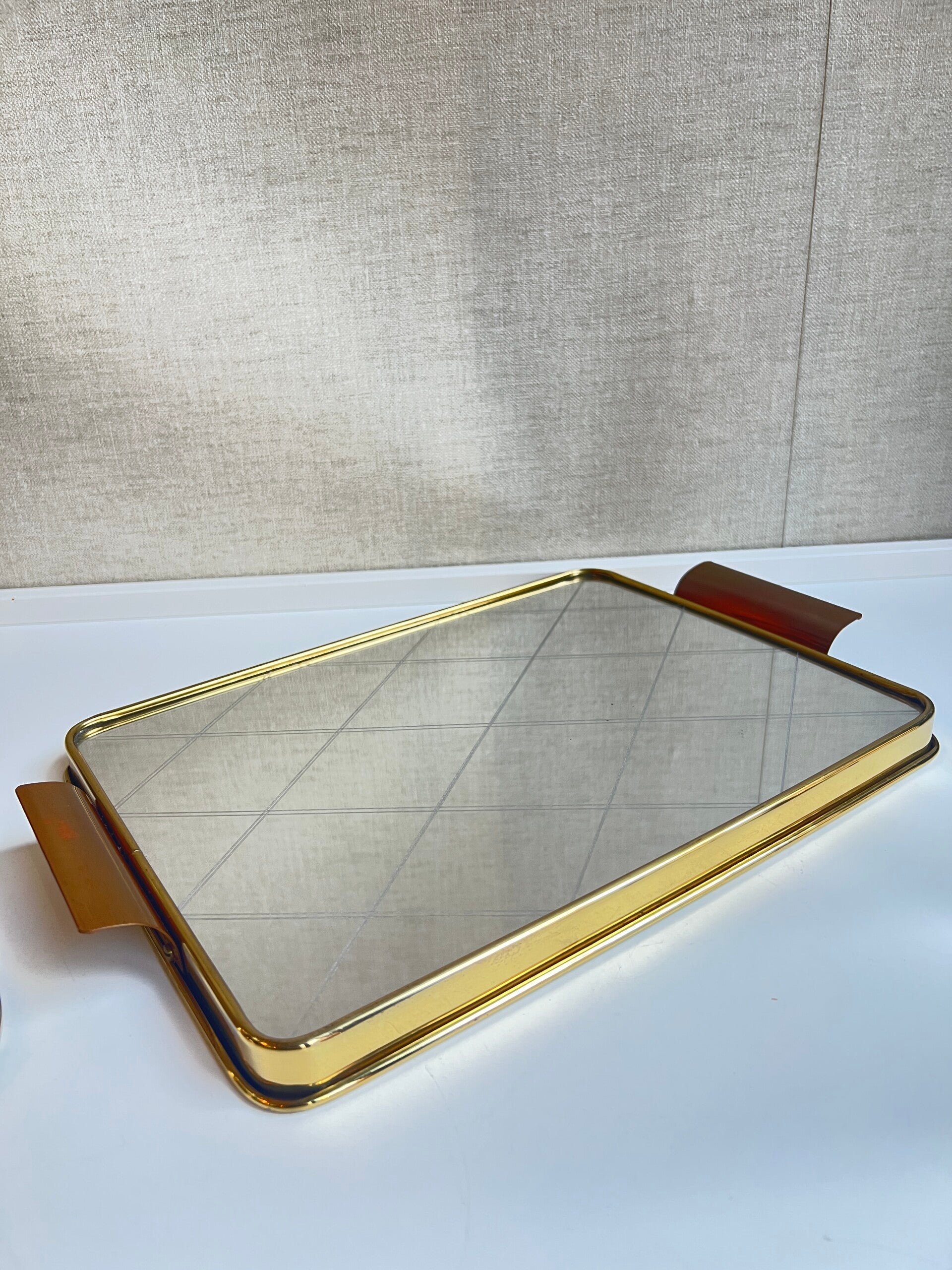 Heel gaaf vintage spiegel dienblad uit de jaren 60. Mooie goudkleurige rand en hndvaten die het geheel een een mooie afwerking geven.