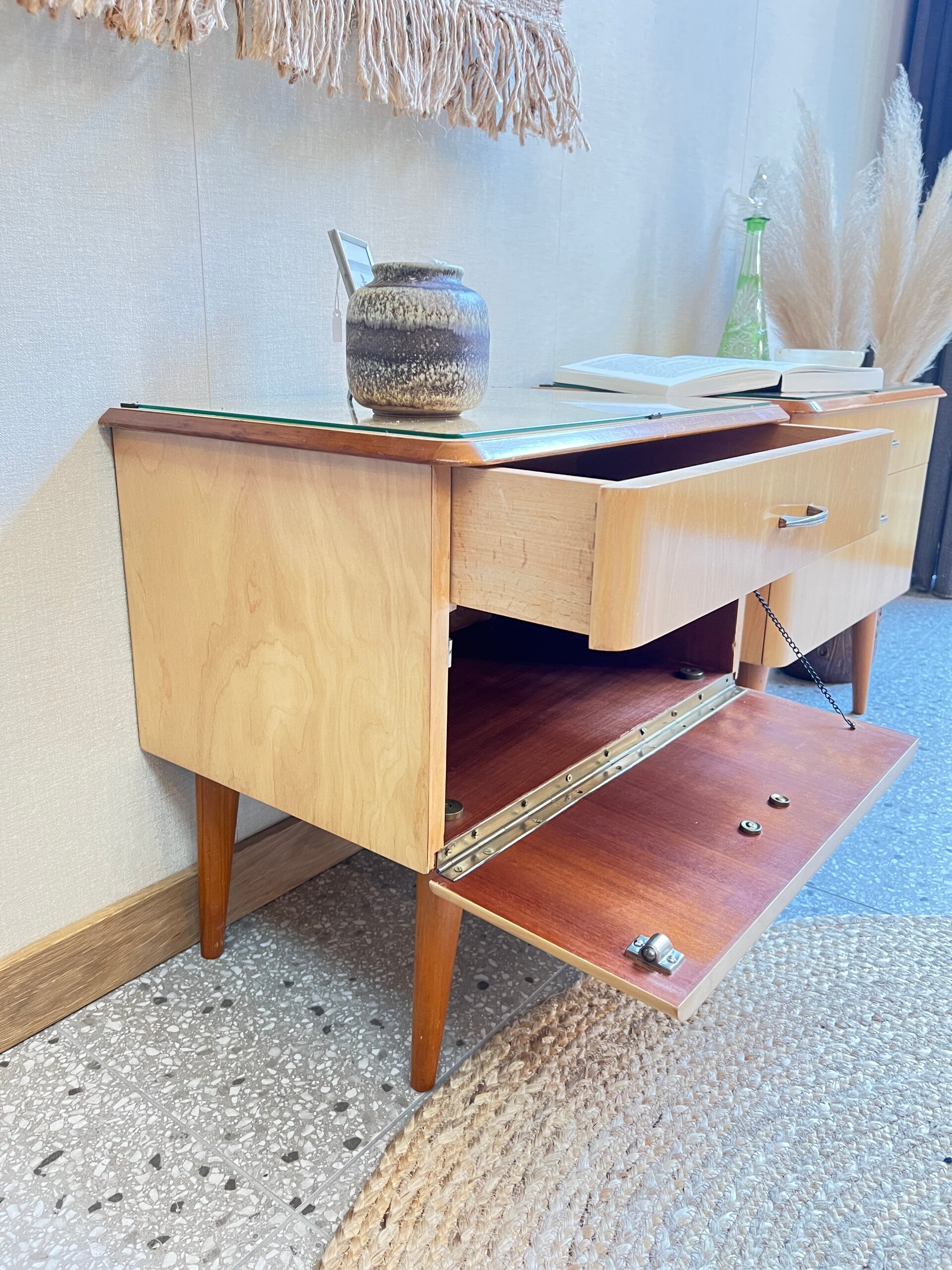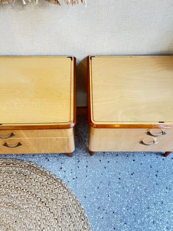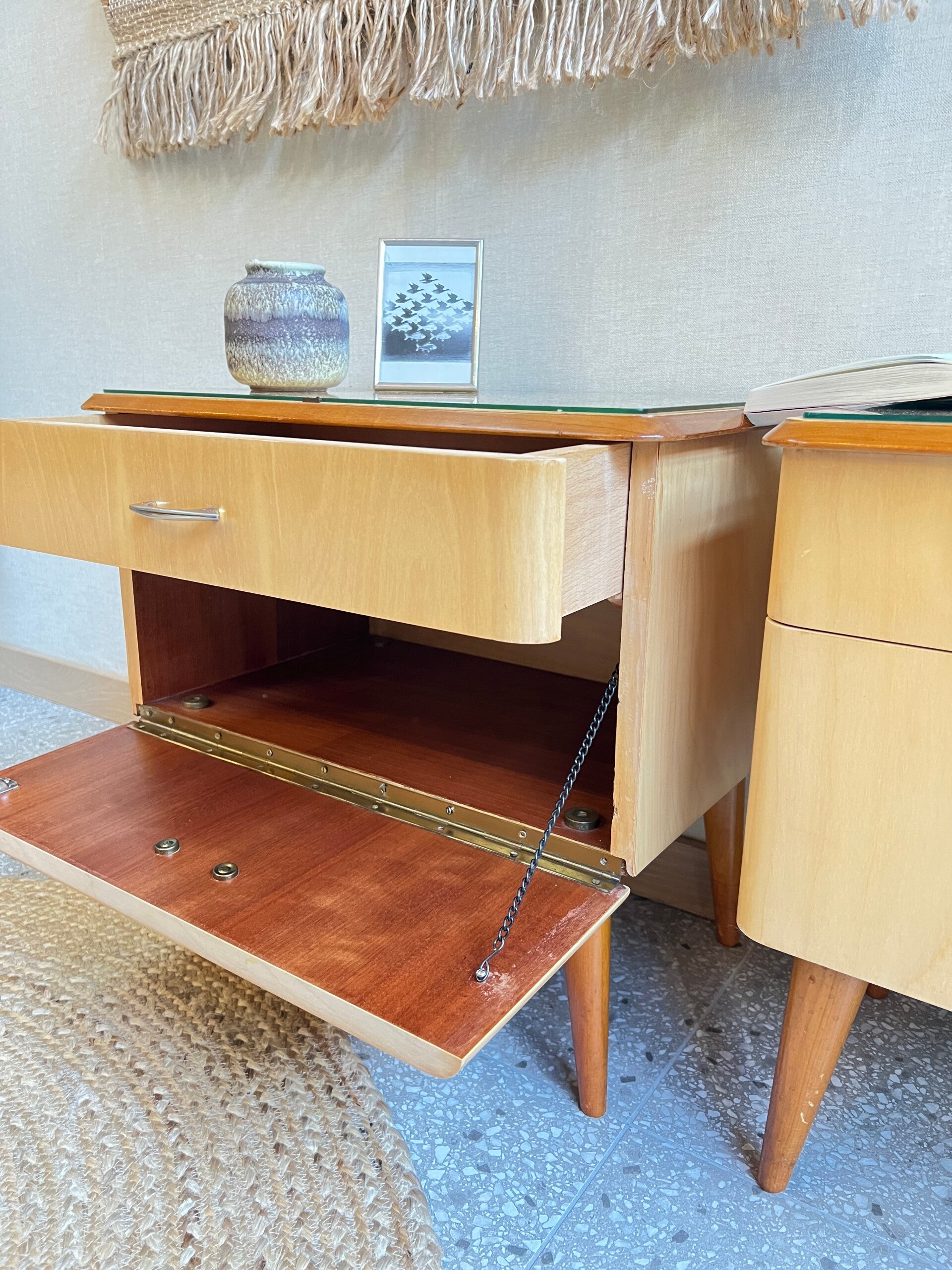 Twee gave vintage jaren 60 nachtkastjes, voorzien van een lade en een klepdeurtje. Dus genoeg opberg mogelijkheden. Mooie pareltjes voor naast je bed✨