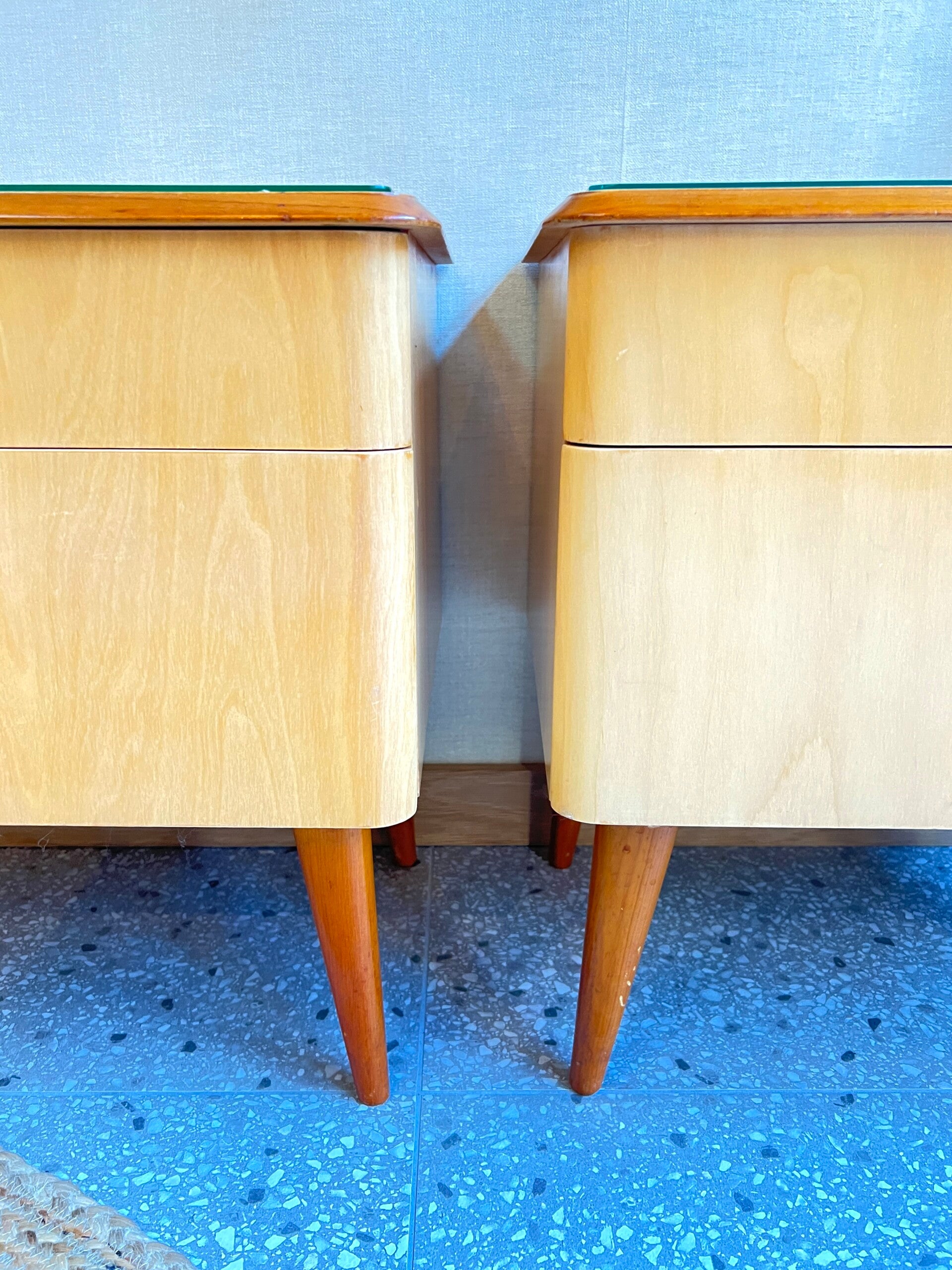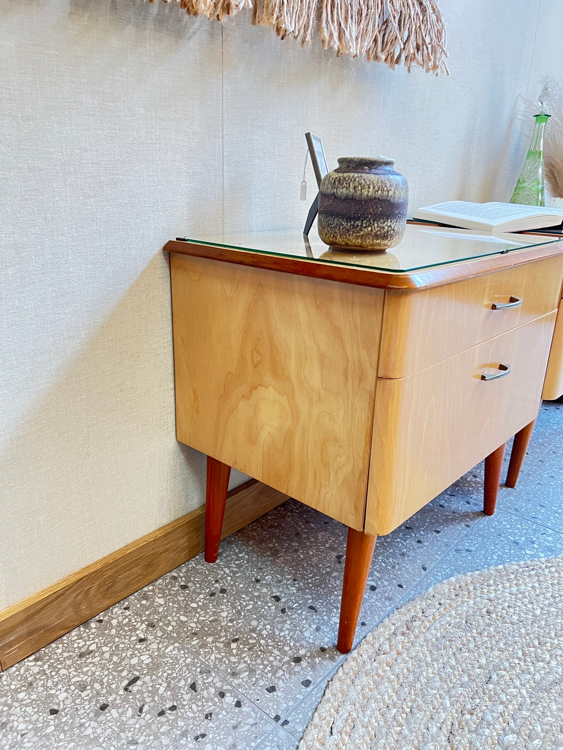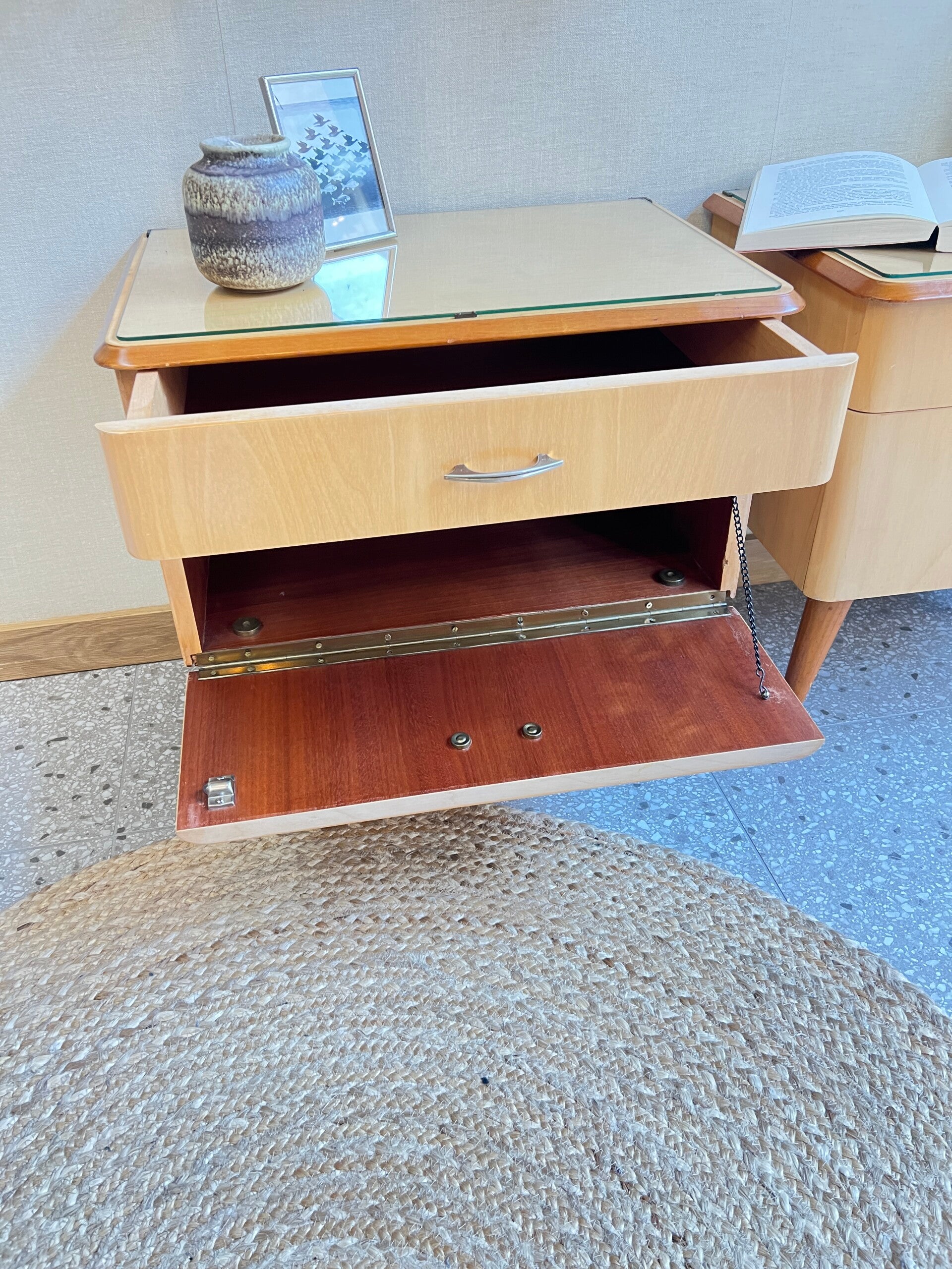 Twee gave vintage jaren 60 nachtkastjes, voorzien van een lade en een klepdeurtje. Dus genoeg opberg mogelijkheden. Mooie pareltjes voor naast je bed✨