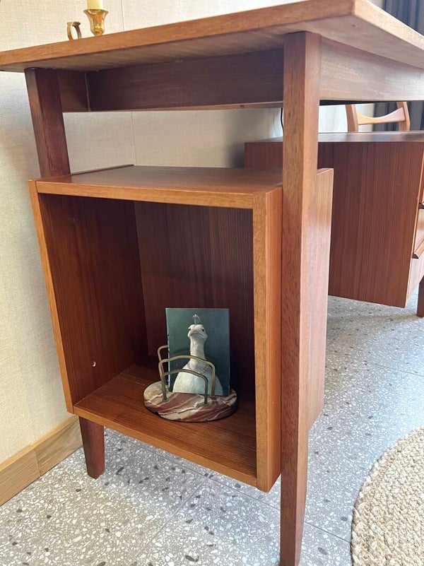 Mooi door zijn eenvoud dit strakke vintage bureau uit de jaren 60 in Deense stijl. Voorzien van drie laden om je spullen in op te bergen afgewerkt met houten handgrepen. Bijzonder is de a-symmetrische vormgeving met het ruimtelijke open opbergvak. Uitermate geschikt om je boeken of decoratie in te presenteren.