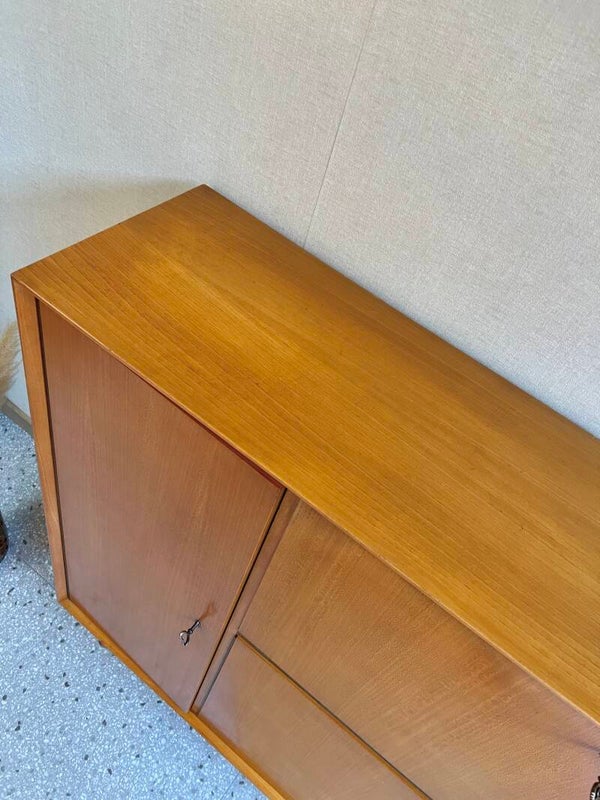 Super tof veelzijdig jaren 60 Highboard met secretaire uitgevoerd in beukenfineer. Het meubel heeft veel opbergruimte. Links een afsluitbare deur met legplanken. Onder een afsluitbare deur met ruimte die is opgedeeld met een legplank. Rechtsboven een afsluitbare secretaire met mooie vakverdeling. Drie sleutels zijn aanwezig.