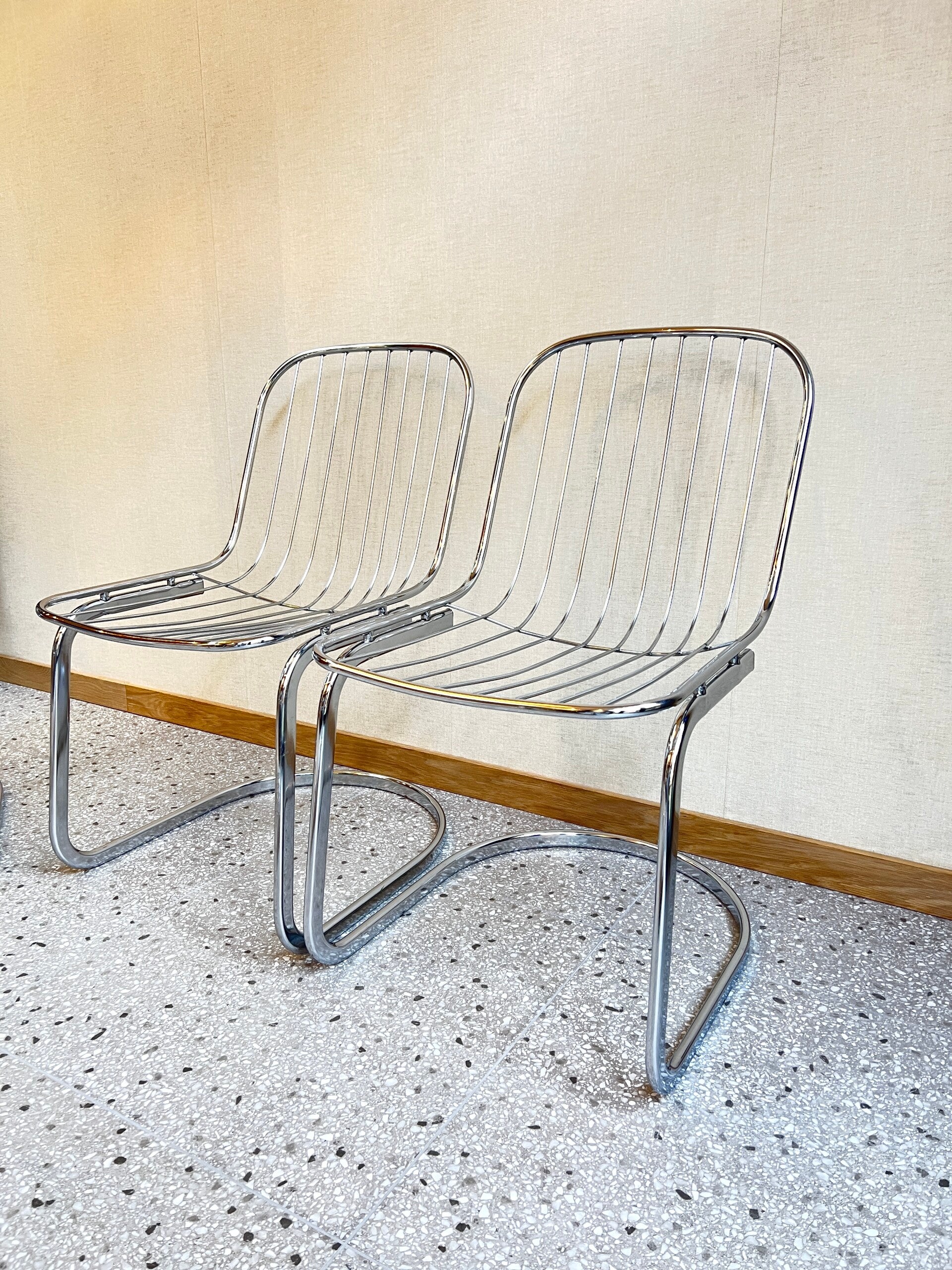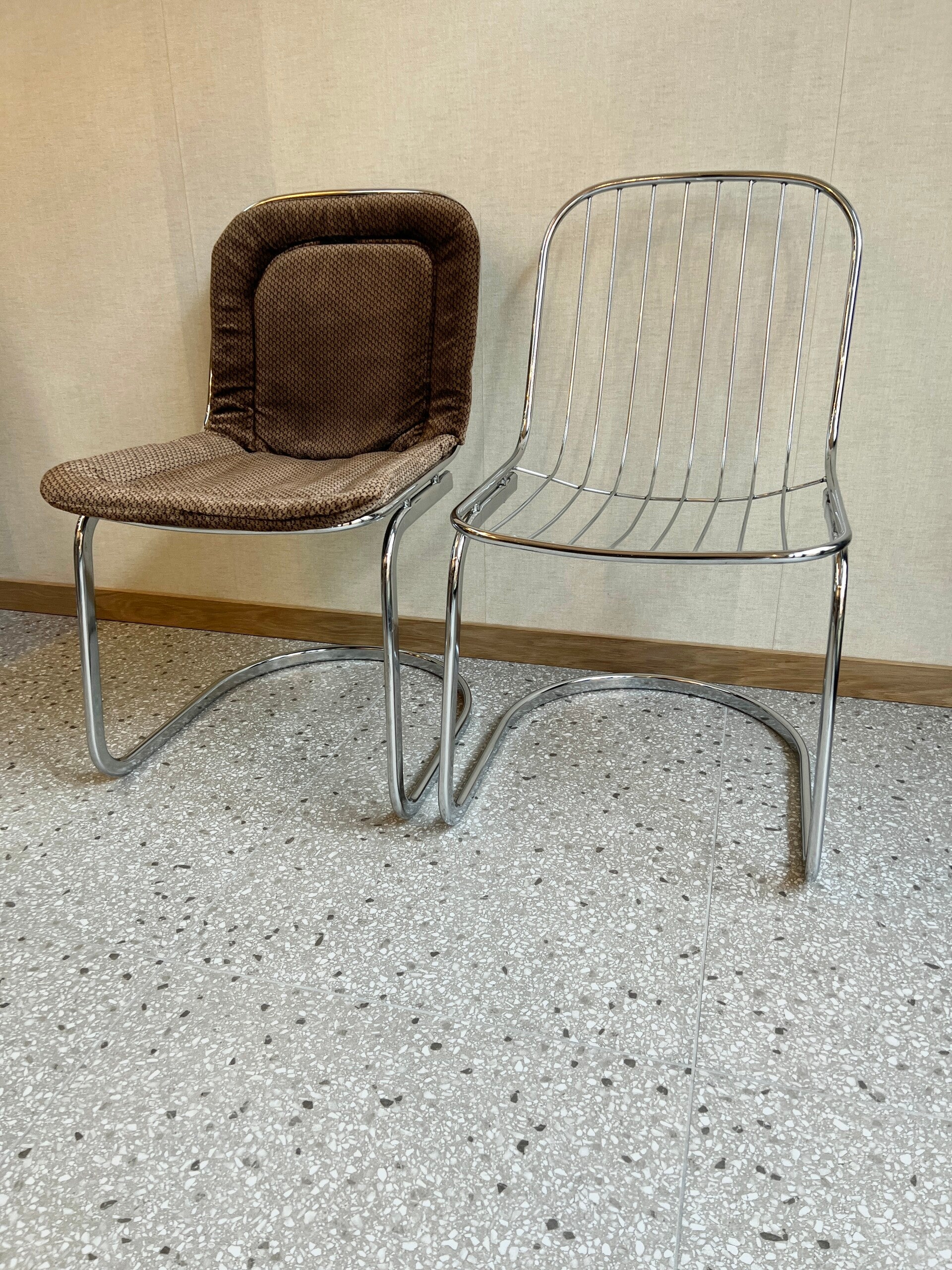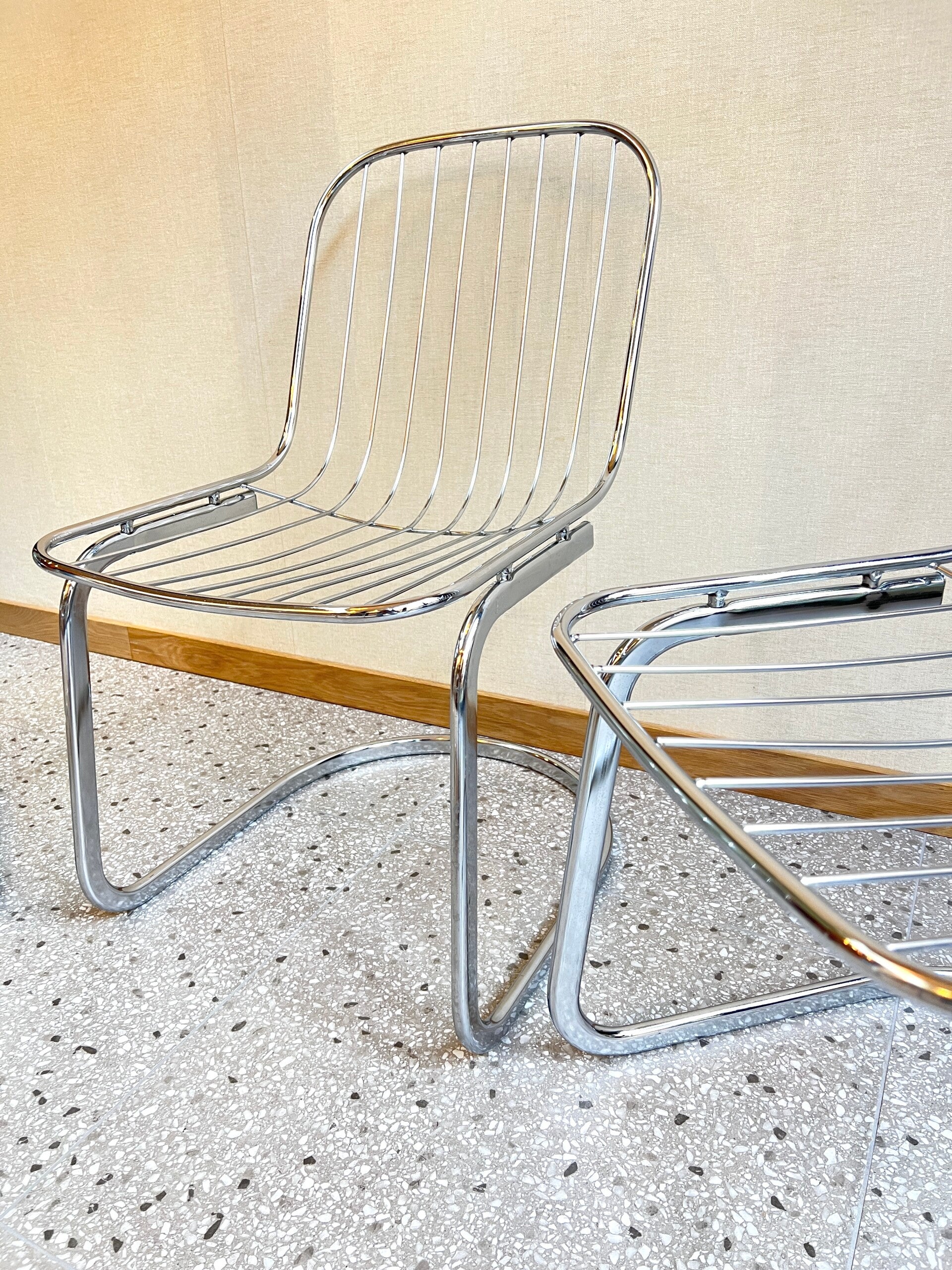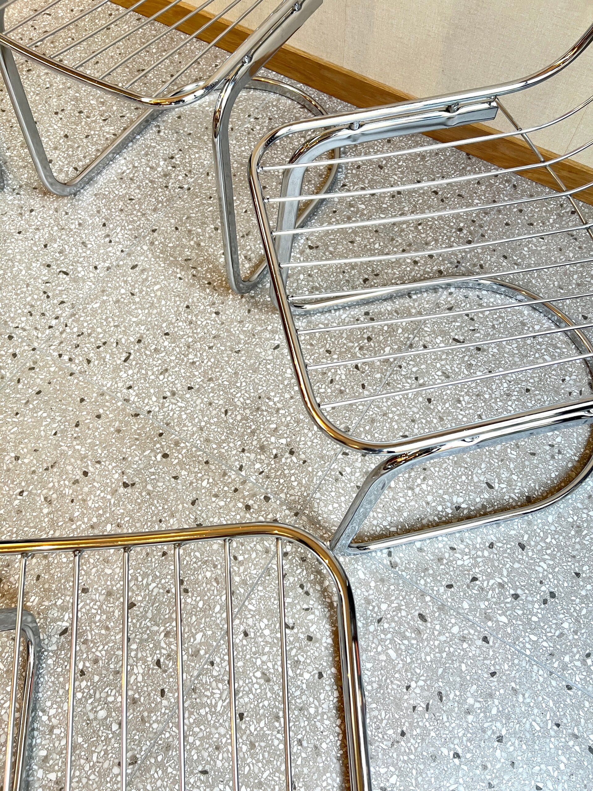 Set van 6 Italiaans design eetkamerstoelen uit de jaren 70. Het design is van Gastone Rinaldi. Gemaakt van verchroomd staal De set verkeert in goede staat. De set is voorzien van 6 textielkussens.