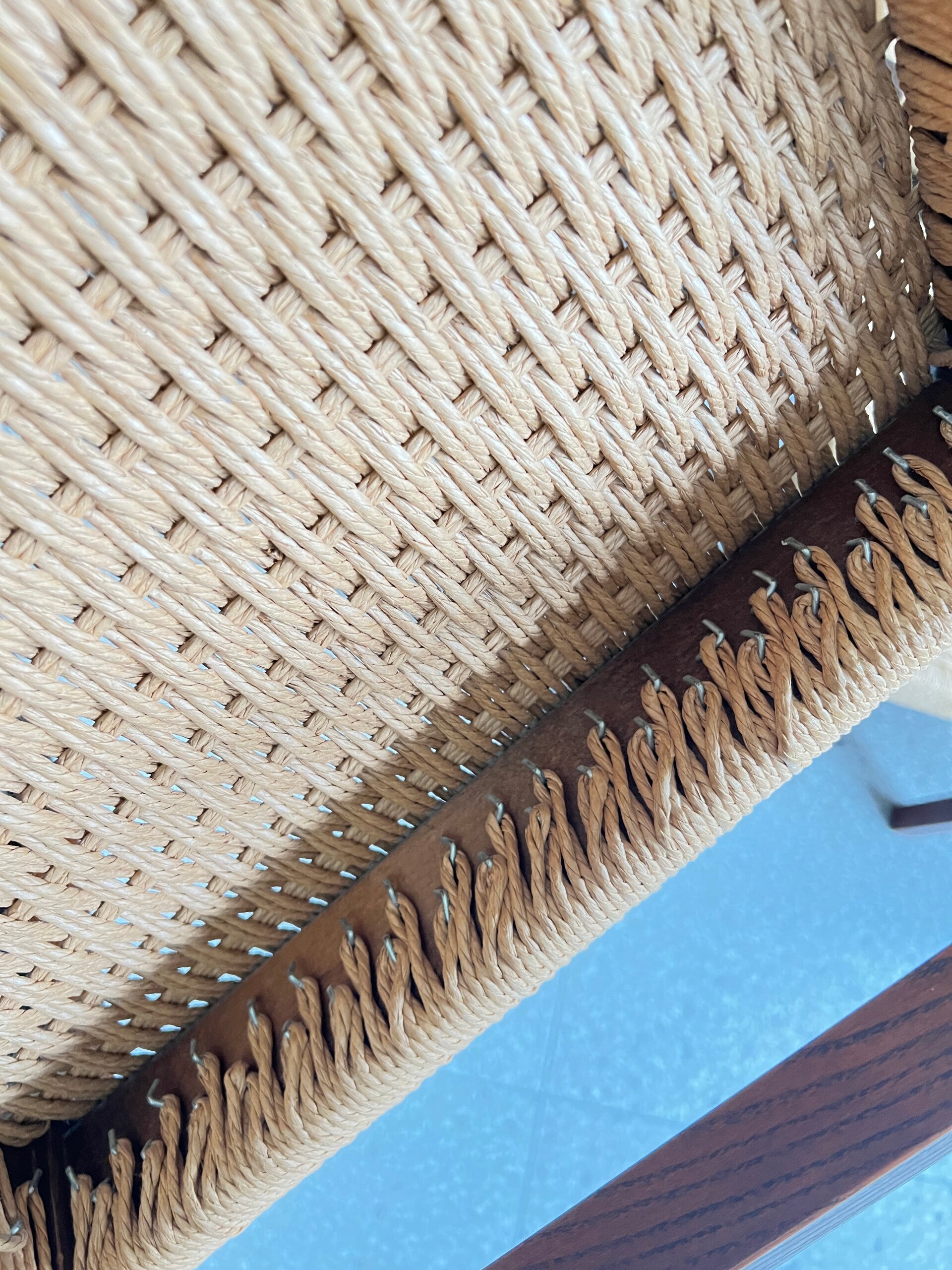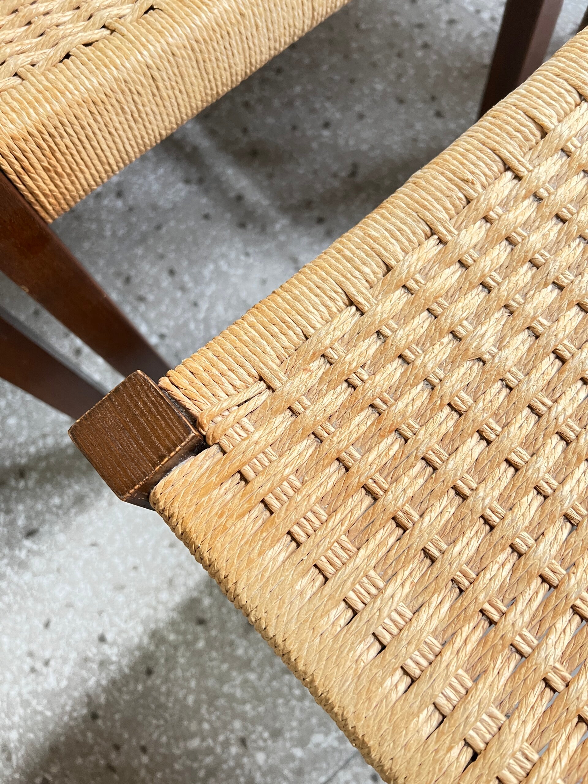 Mooie vintage Dutch design stoelen. Houten frame en zitting van papercord. Ze verkeren in goede staat.