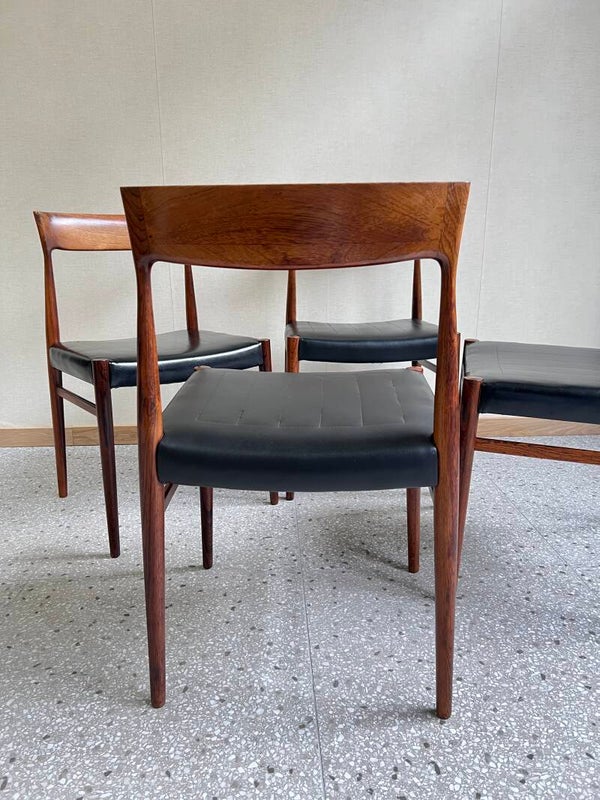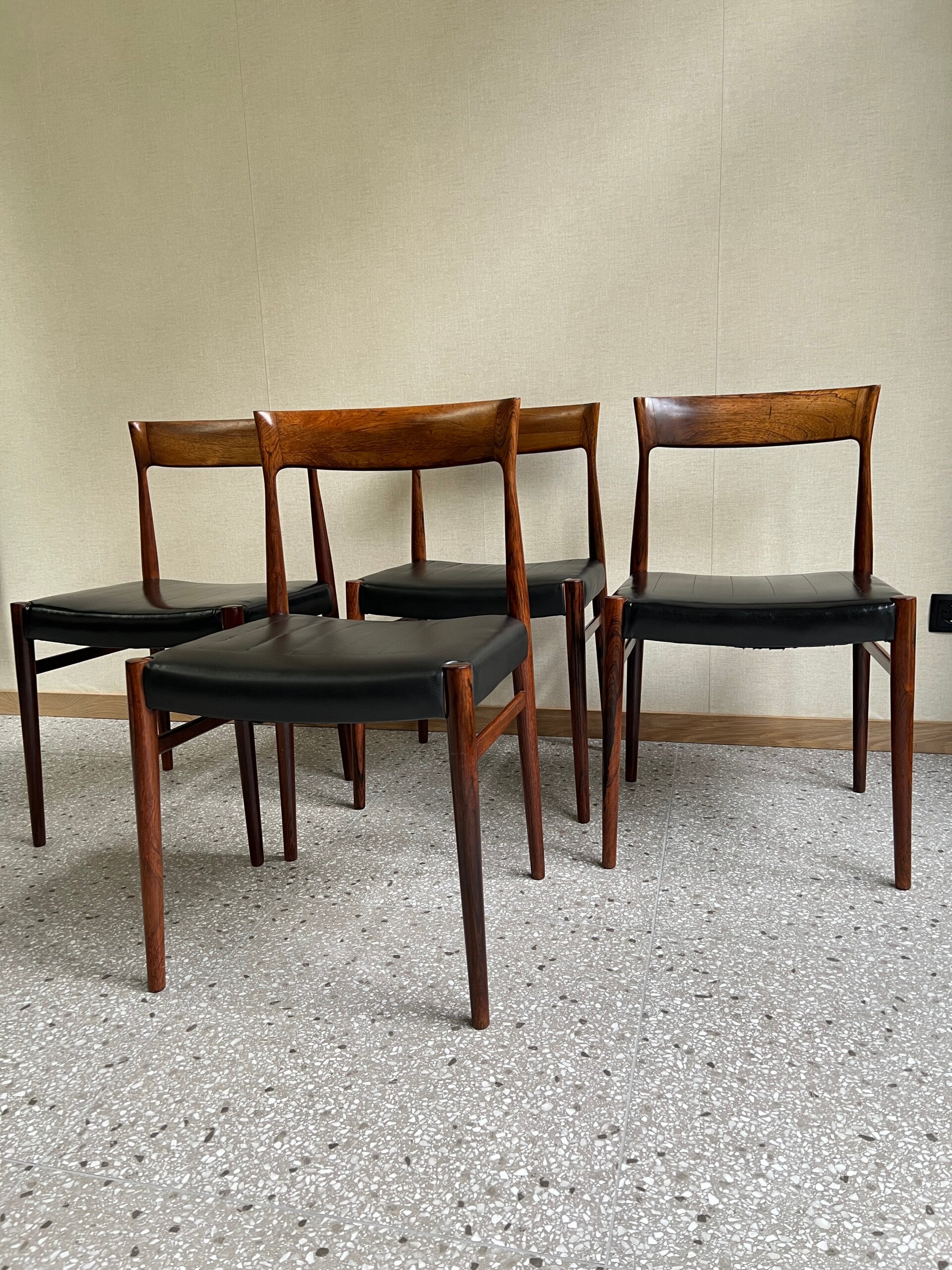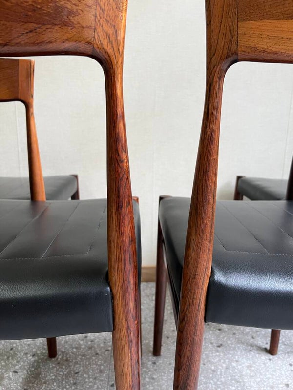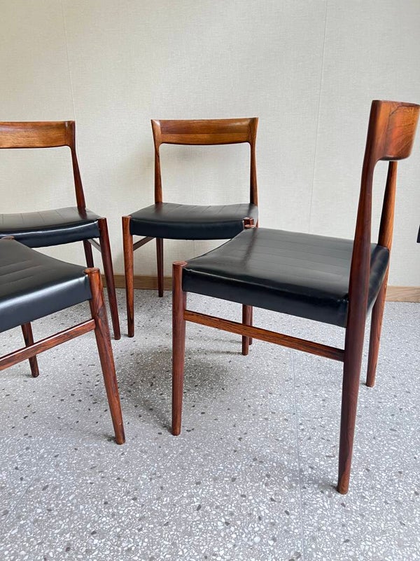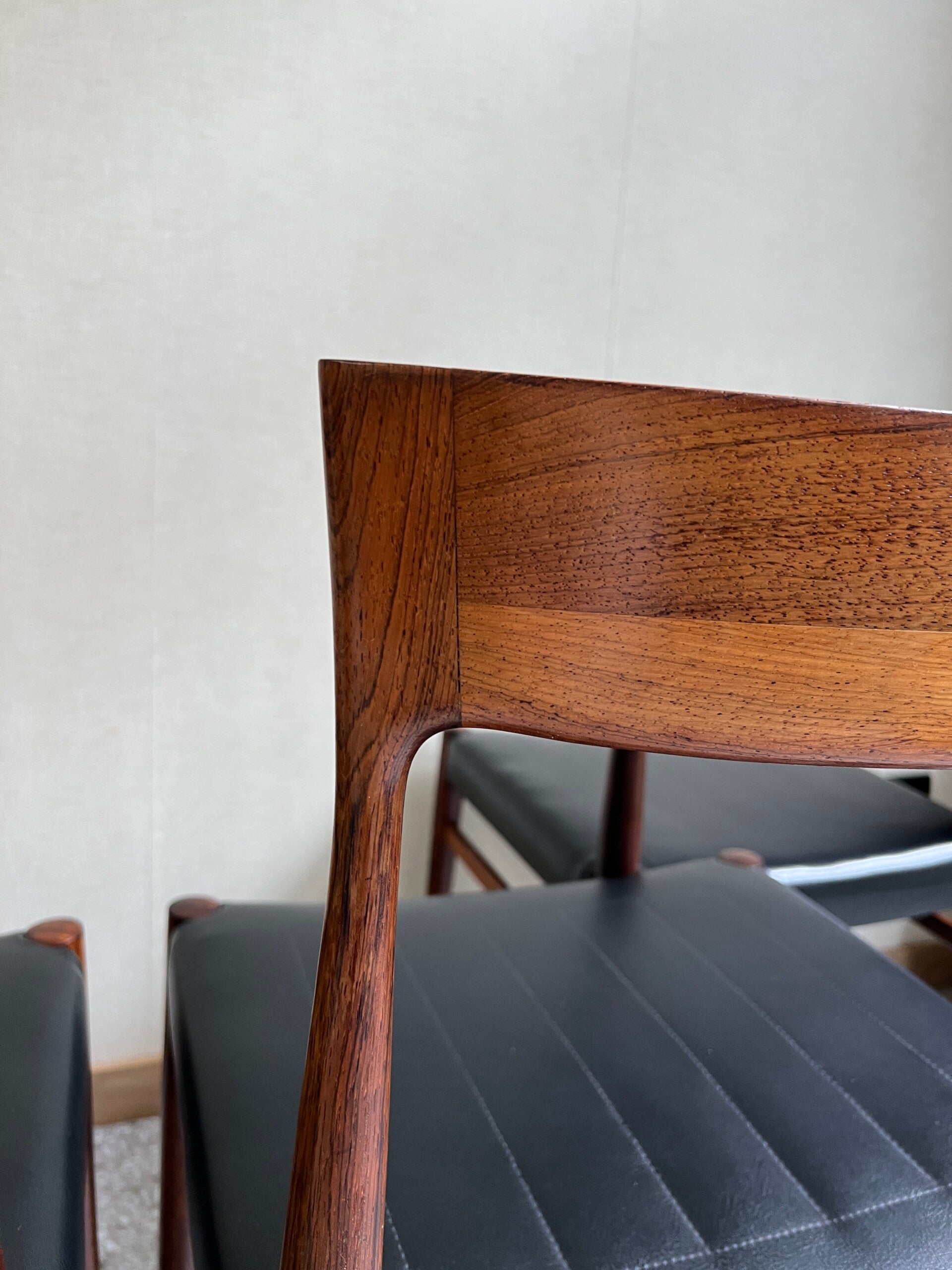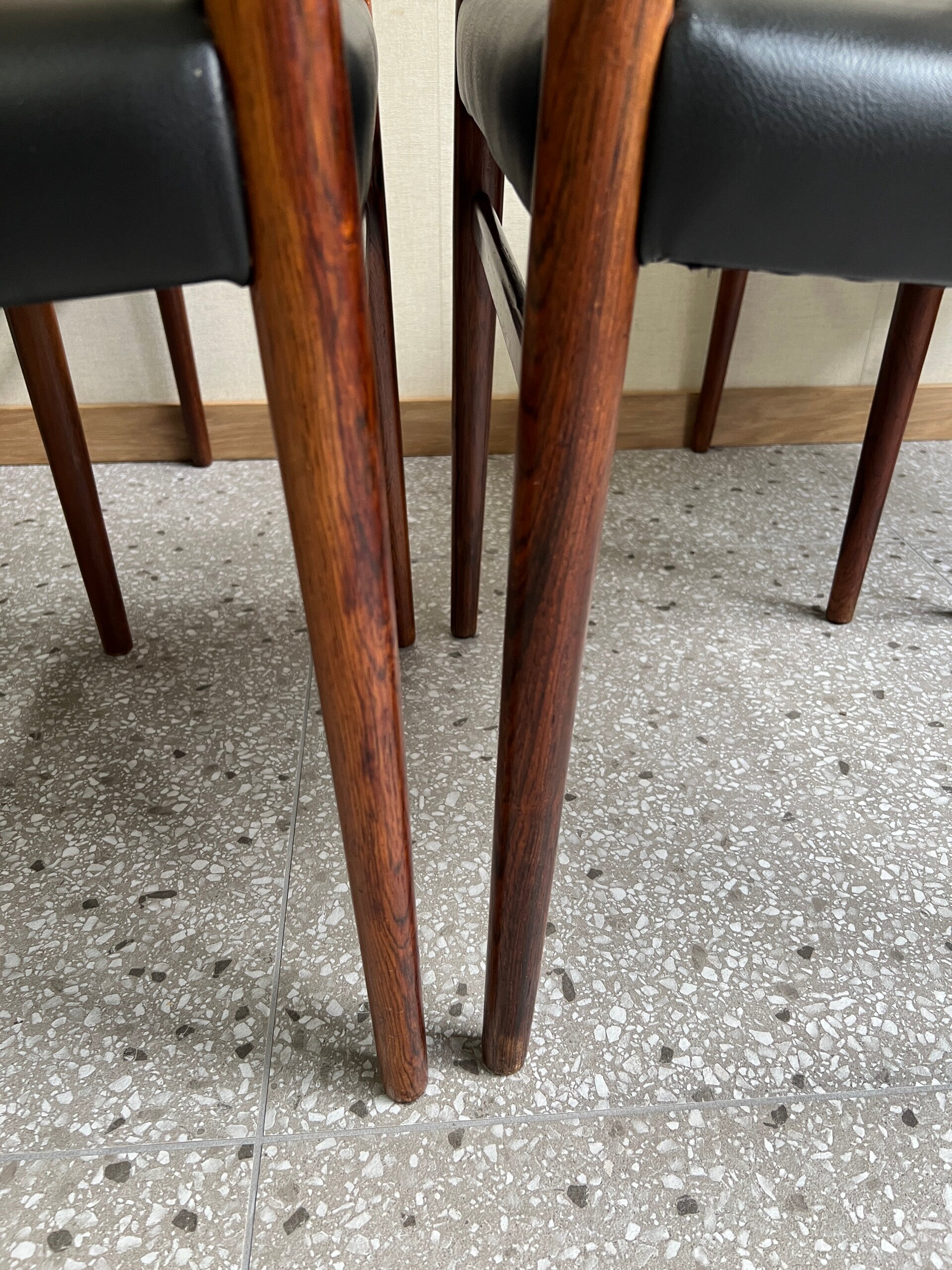 Prachtige Deens design Palissander houten eetkamerstoelen, prachtige strak vormgegeven set van 4 hoogwaardige kwaliteit, Ervaar het comfort en de kwaliteit van deze mooie eetkamerstoelen.