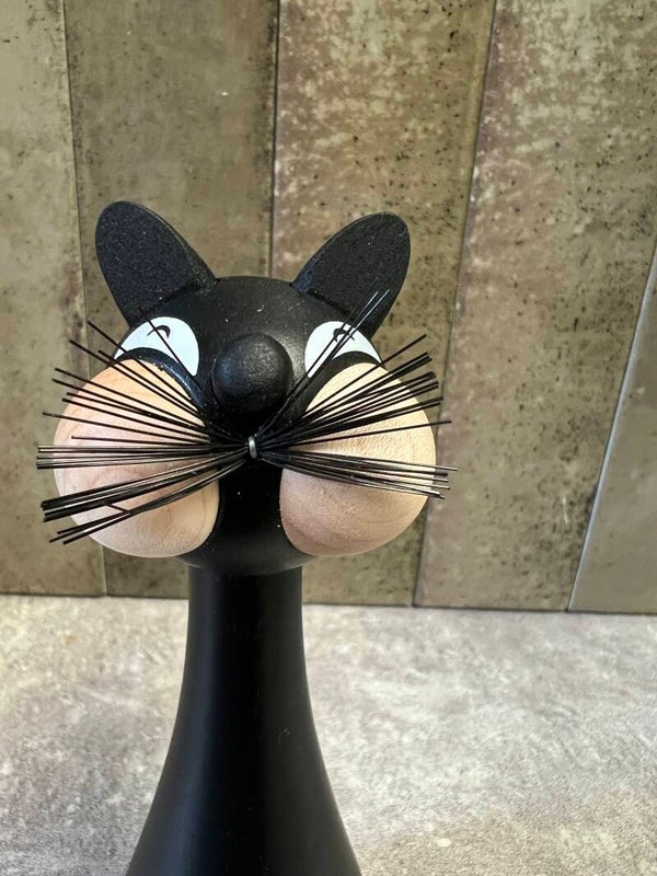 De kat is gemaakt van zwart geverfd hout met esdoornwangen en poten.