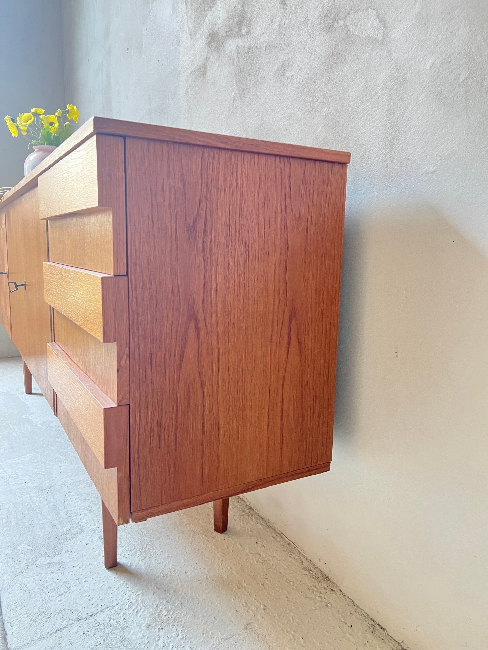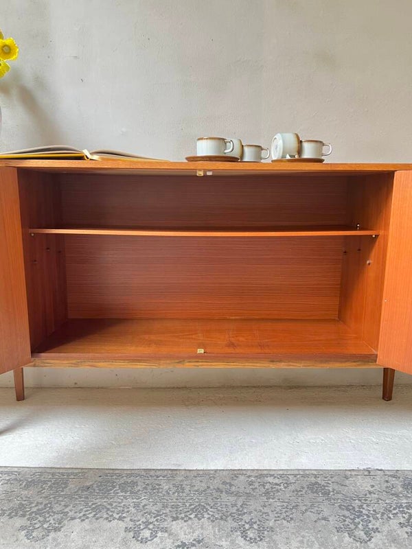 Hoe gaaf is dit fantastische teak fineer sideboard uit de jaren 60. Voorzien van 3 deurtjes en drie lades. Kijk eens wat een mooie houtstructuur het teak fineer heeft, met dit sideboard haal je een tijdloze eyecatcher in huis.