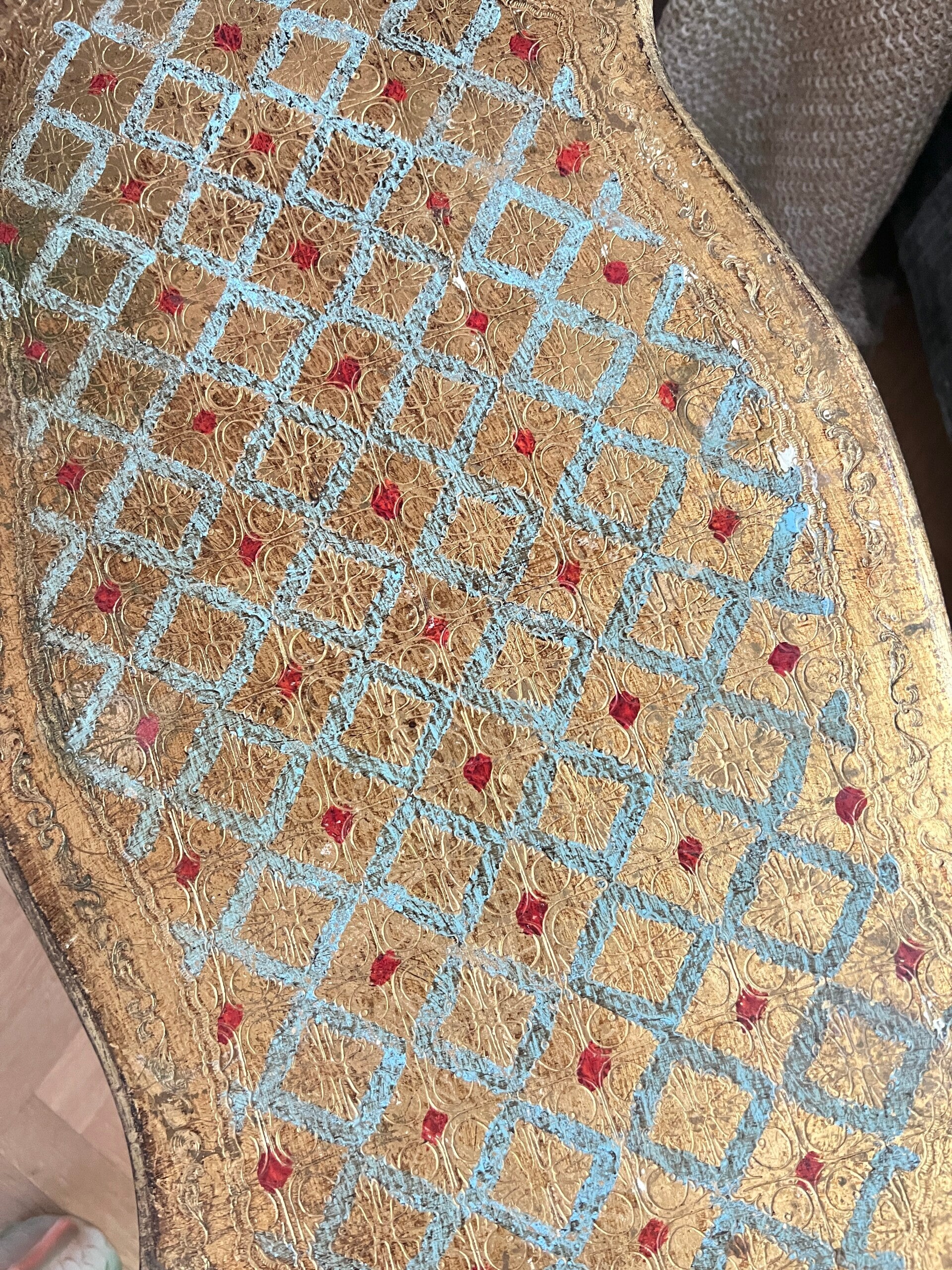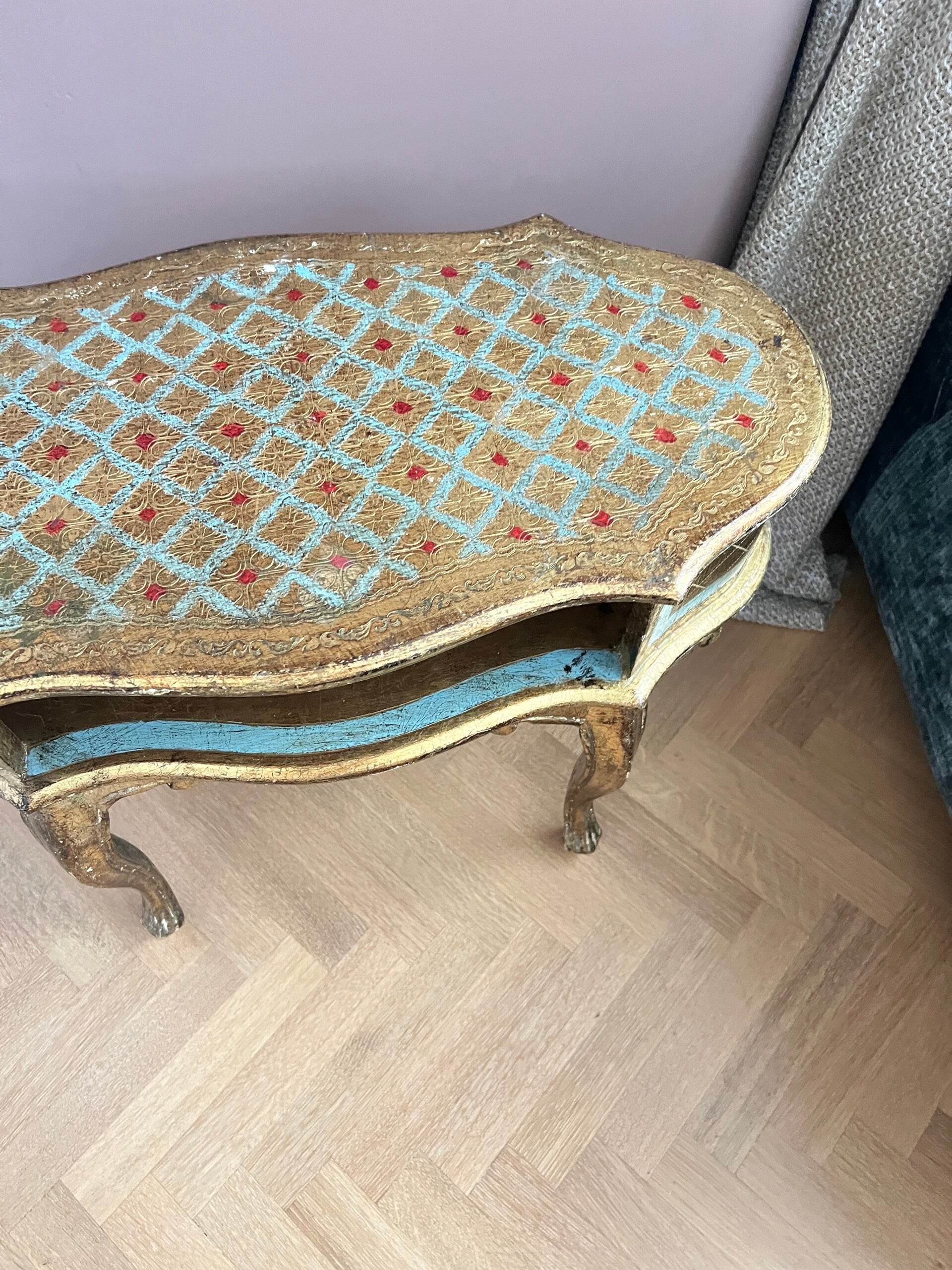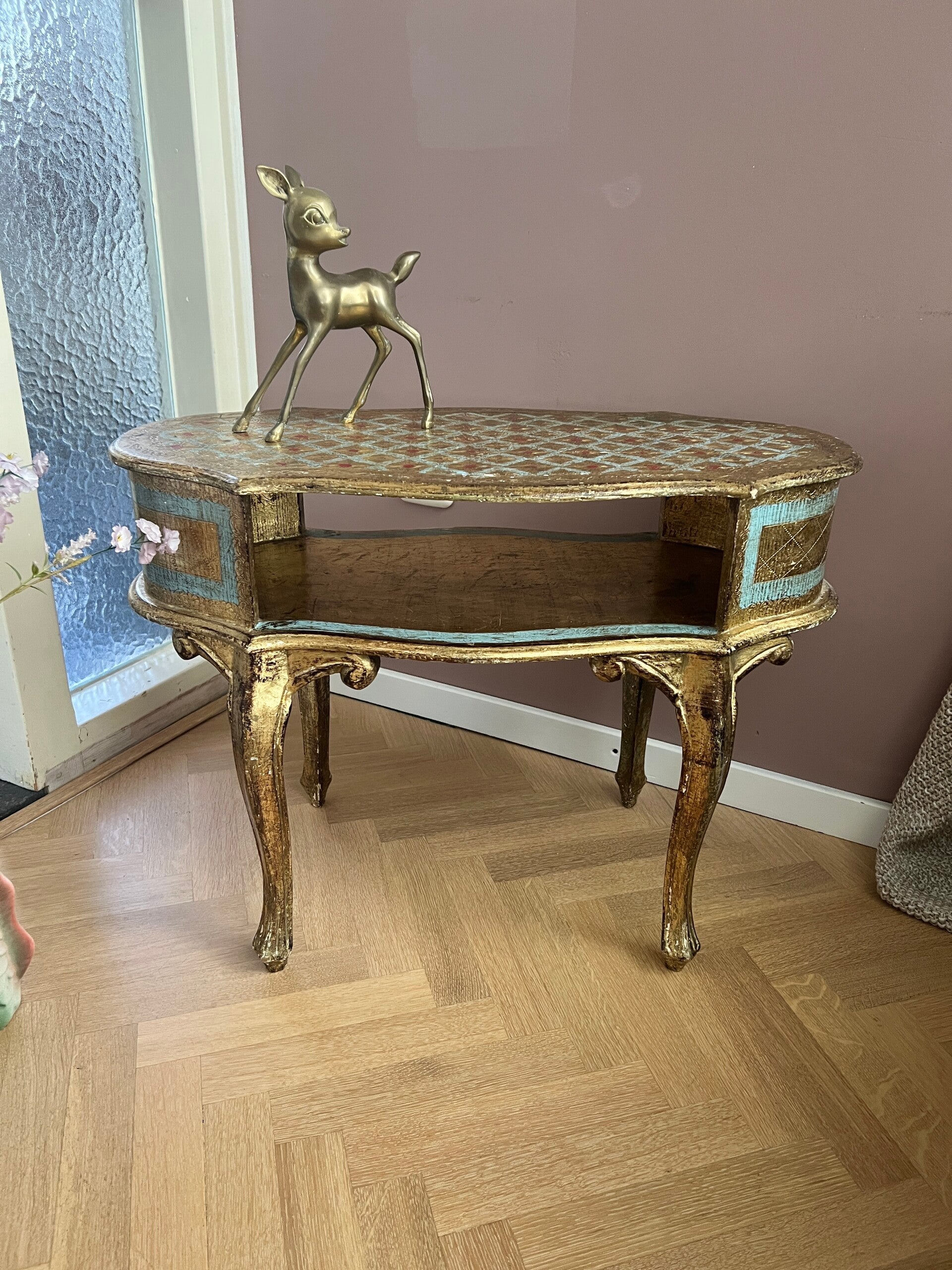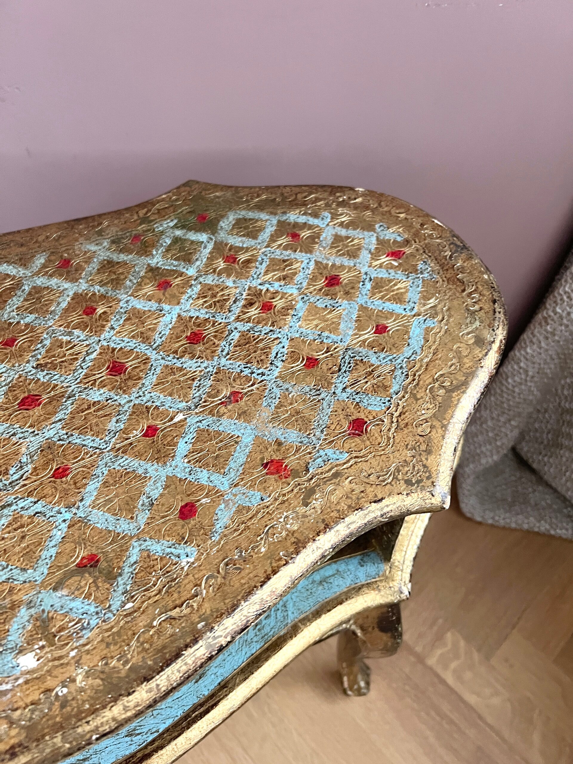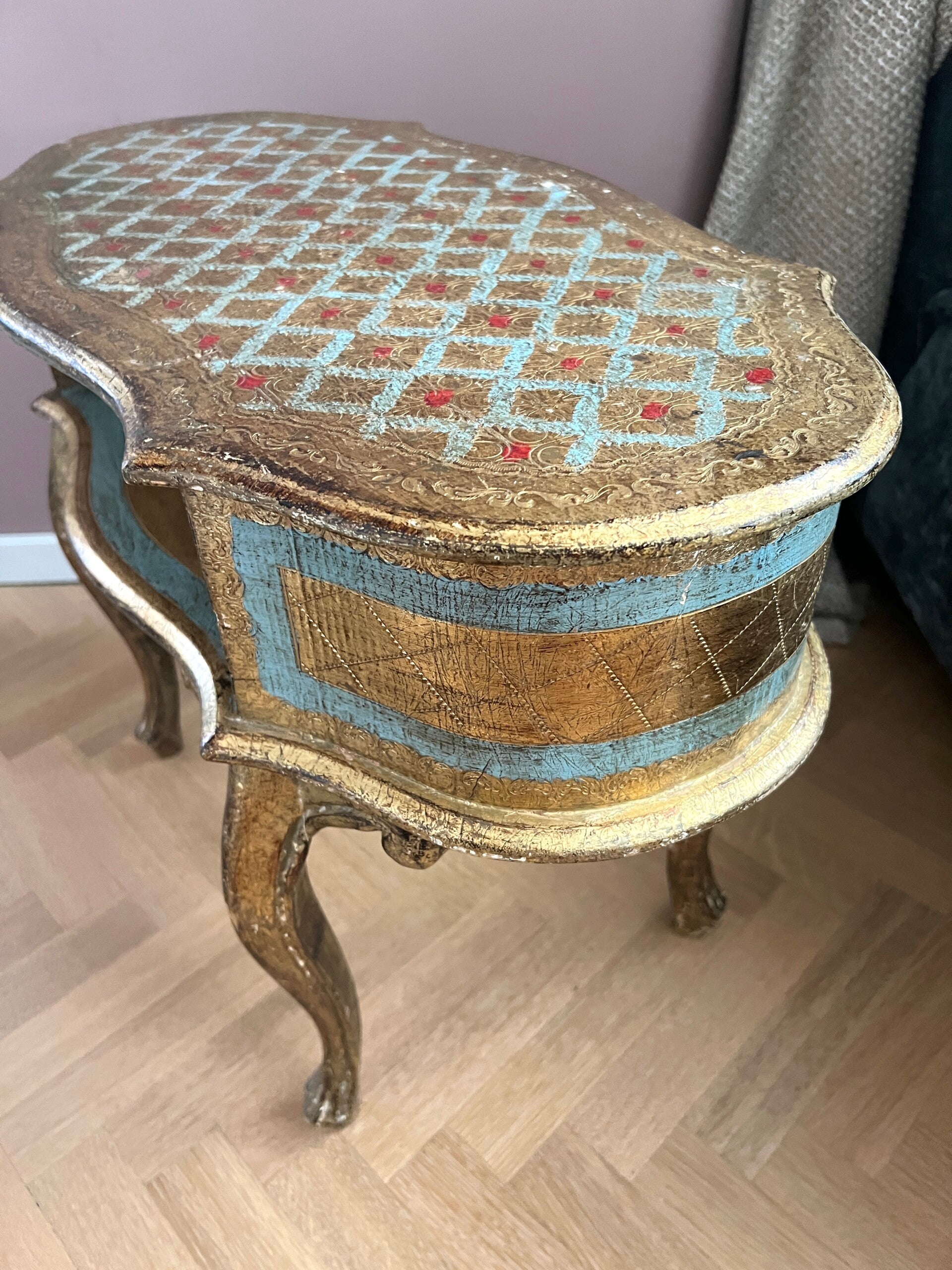 Romantisch Italiaans gouden kastje of bijzettafeltje. Stijlvol gevormd wat doet denken aan de Louis XV stijl. Bladgoud afgewisseld met blauw is het niet geweldig!