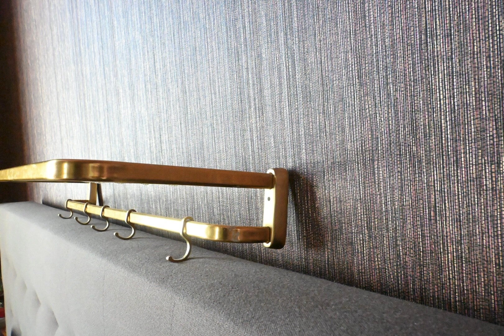 Deze unieke trein garderobe, gemaakt van goudkleurig geanodiseerd aluminium straalt pure retro charme uit. Het lichte, duurzame materiaal gecombineerd met het iconische design maakt dit stuk niet alleen praktisch, maar ook een echte eyecatcher aan de muur. Ideaal bv. voor in je hal. Stoer en stijlvol item met een knipoog naar het verleden.