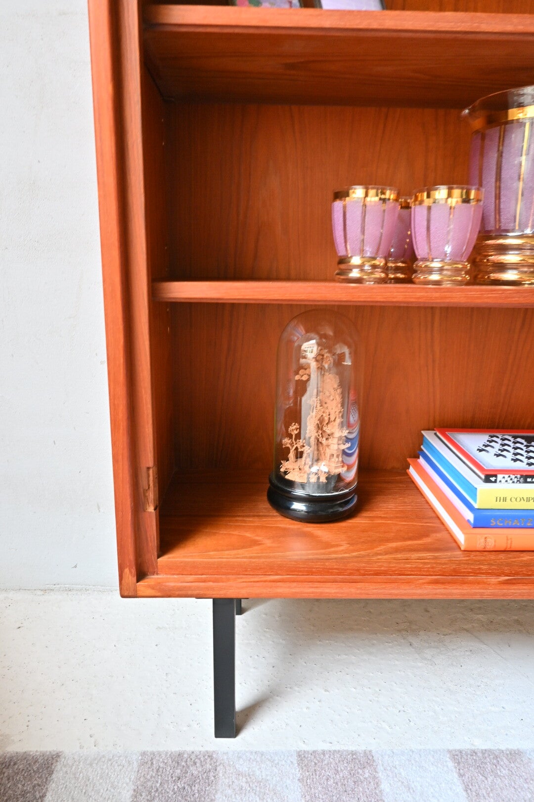 Deze kast komt uit een groter wandsysteem. Origineel hebben er deuren ingezeten deze zijn verwijderd waardoor het nu een stijlvol open boekenkast is. De kast heeft lichte gebruikssporen passend bij de leeftijd