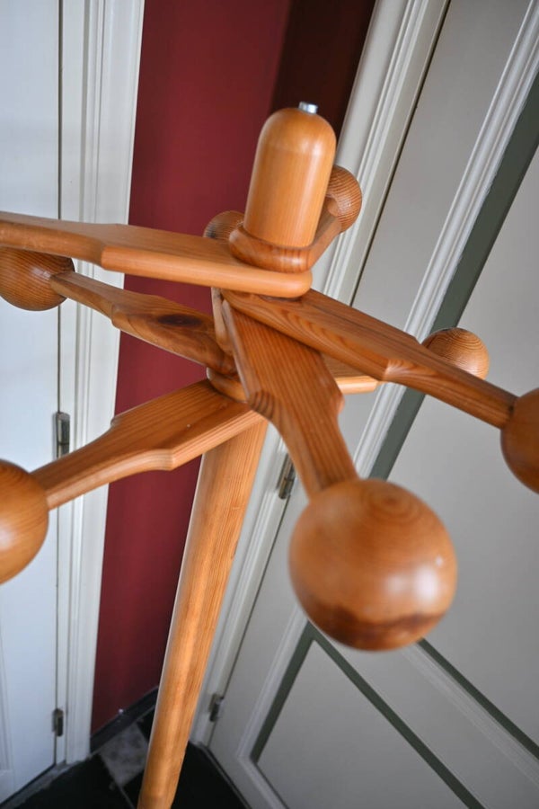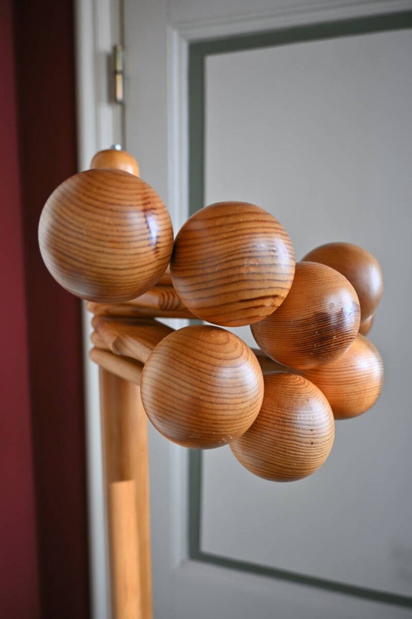 Jaren '70 kaptstok ontworpen door Reiner Daumiller in Zweden. Deze vintage kapstok is gemaakt van massief grenen hout. De acht haken met bollen zijn verstelbaar. Een speels midcentury design met ronde vormen, dat doet denken aan Borsani / Sputnik.