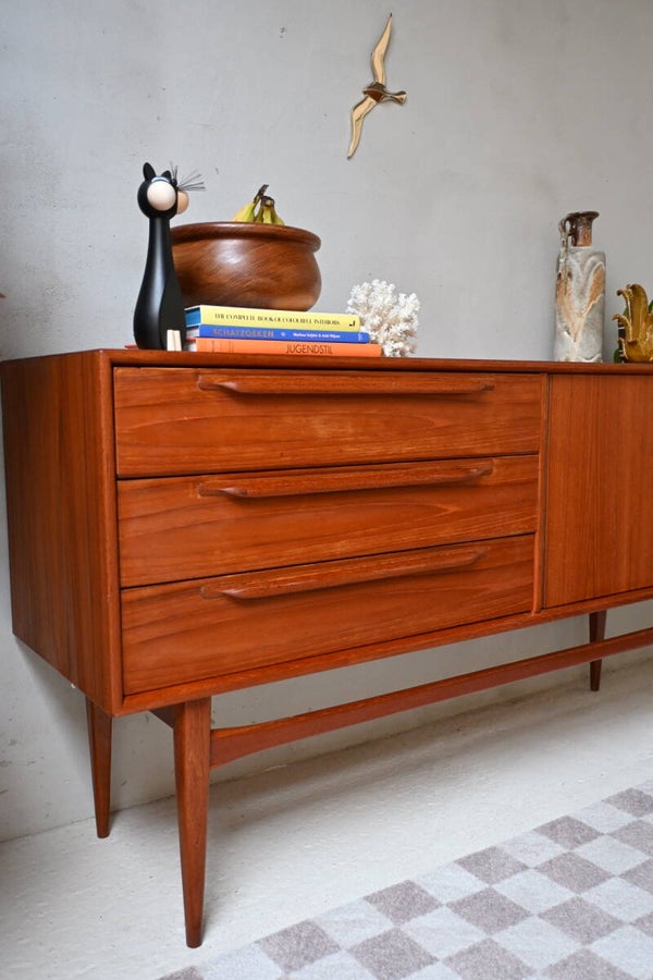 Dit stijlvolle vintage lowboard van de Duitse ontwerper Heinrich Riestenpatt is een prachtig voorbeeld van mid-century modern design uit de jaren 60. De kast is vervaardigd uit massief hout met prachtig teakfineer, wat zorgt voor een warme, natuurlijke uitstraling. Het verfijnde vakmanschap is zichtbaar in elk detail, van de strakke belijning tot het zorgvuldig afgewerkte oppervlak.