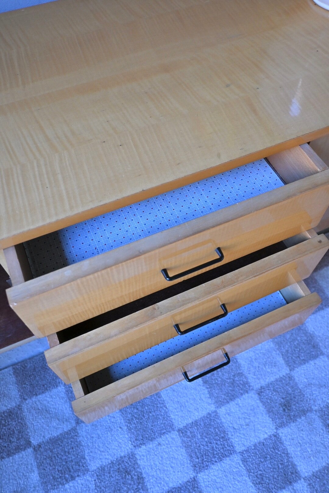 Indeling: midden 3 lades en rechts en links een klepdeurtje.