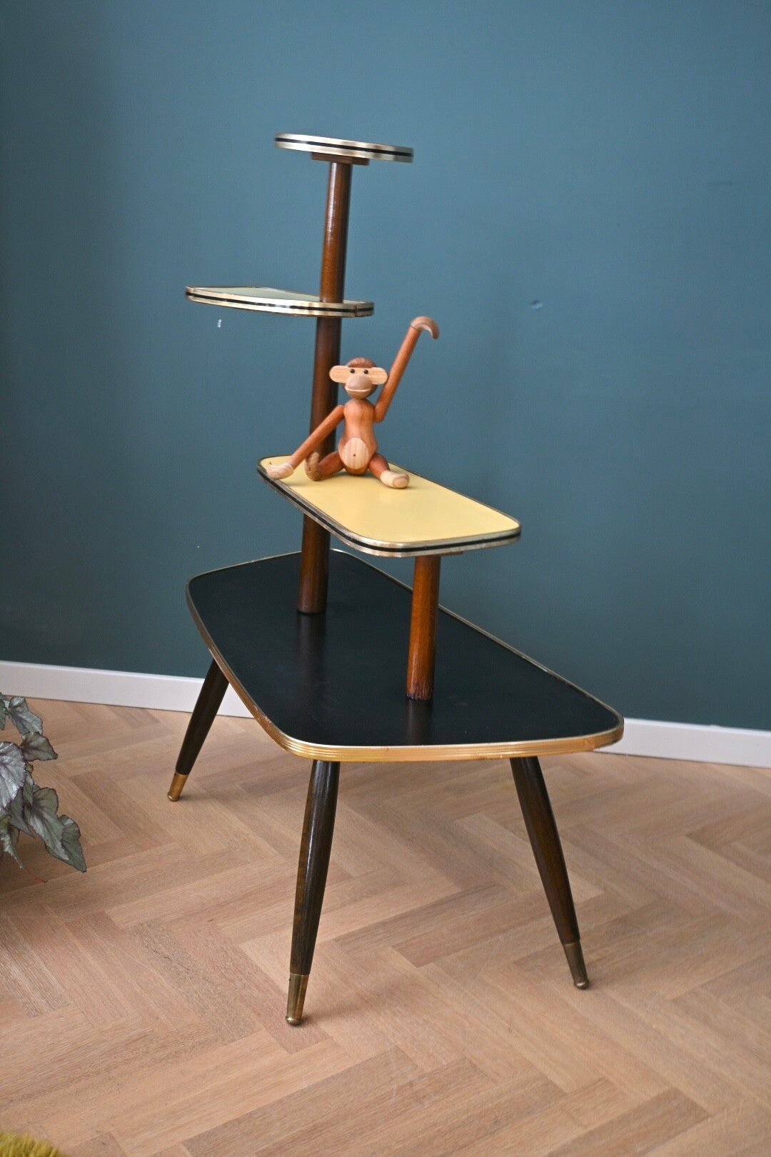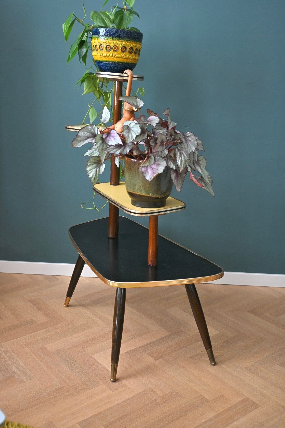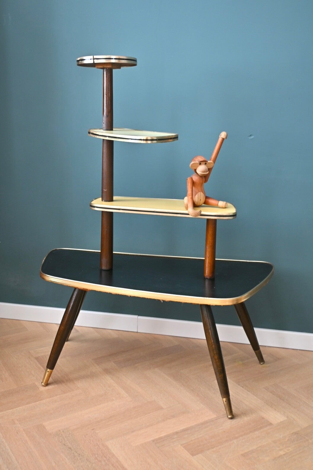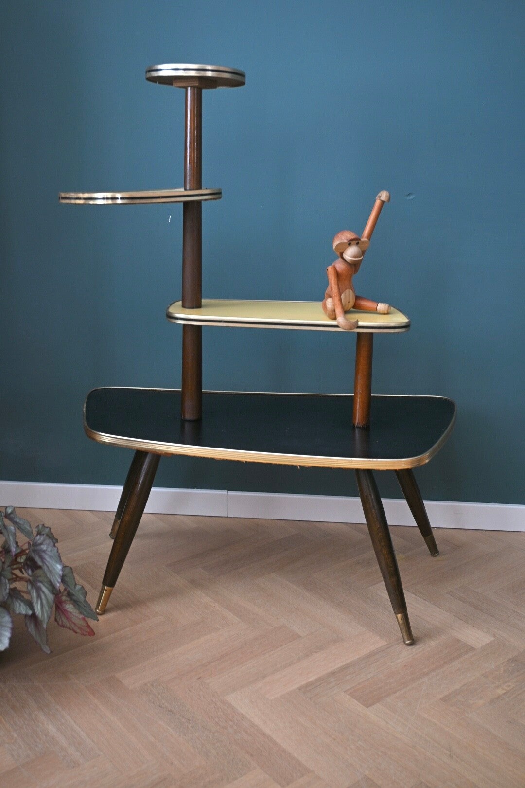 Onwijs toffe mid-century planten-étagère, de bladen zijn van zwart en crème kleurig formica. Deze etagere komt uit de 60’s, en heeft 3 etages. Super leuk om mee te stylen👌🏻