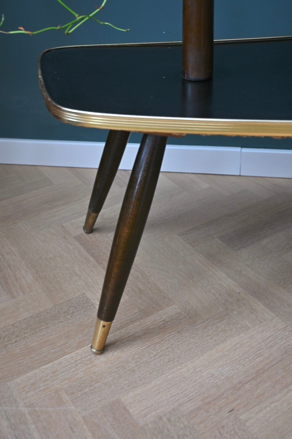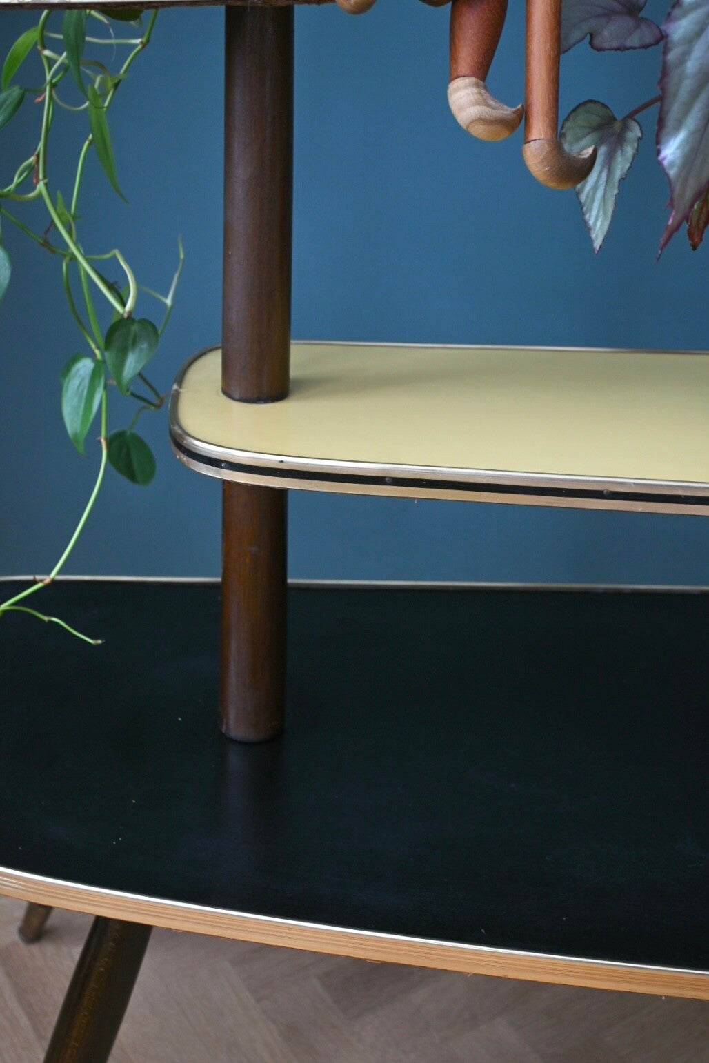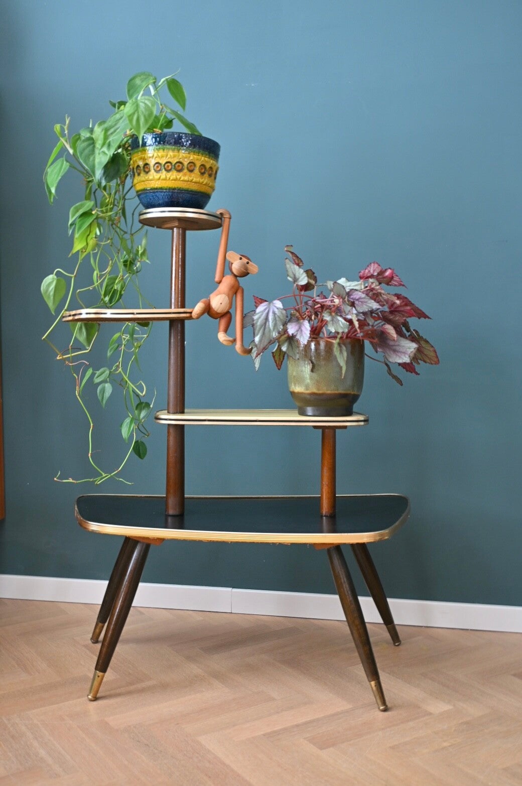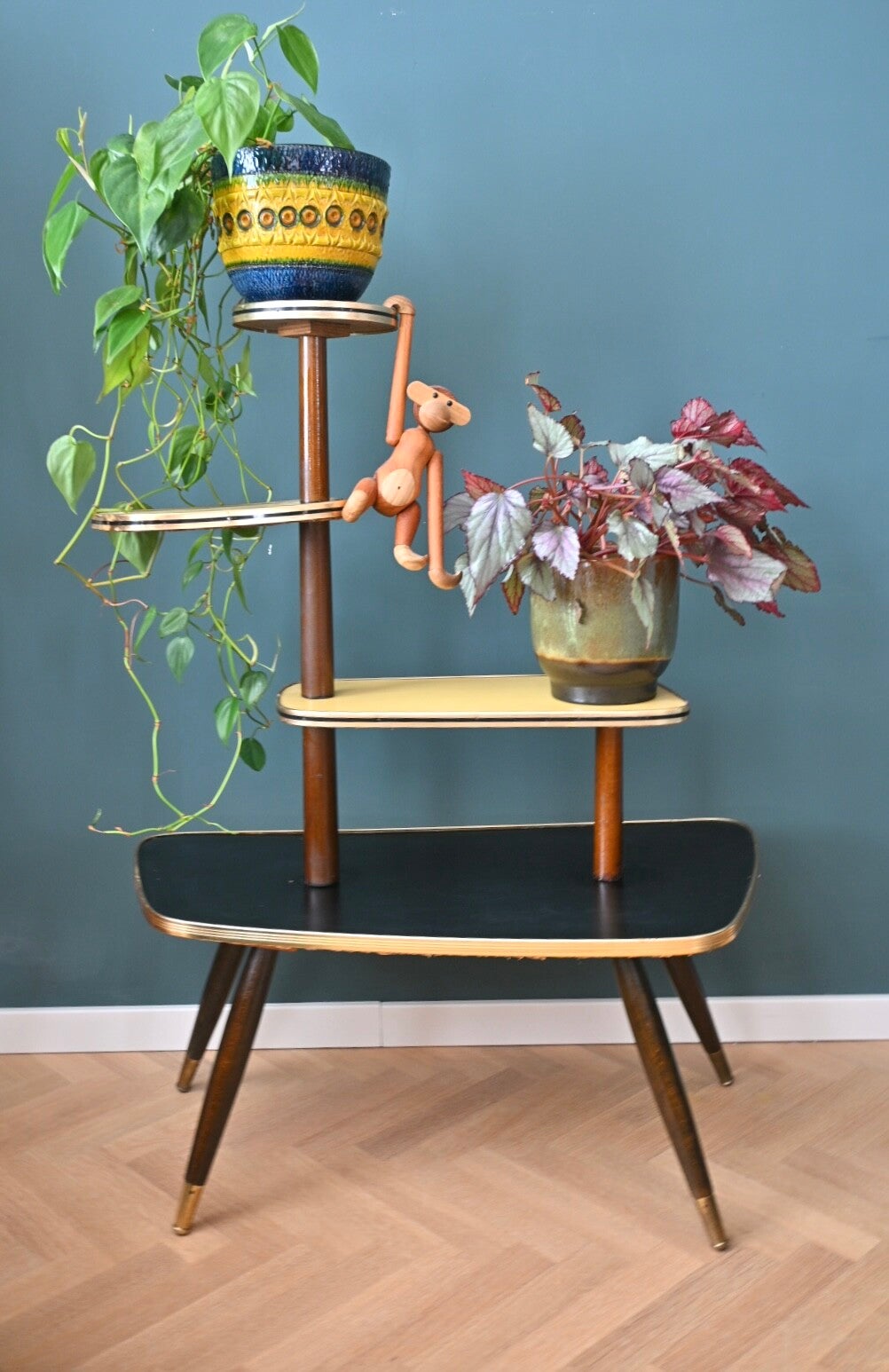Onwijs toffe mid-century planten-étagère, de bladen zijn van zwart en crème kleurig formica. Deze etagere komt uit de 60’s, en heeft 3 etages. Super leuk om mee te stylen👌🏻