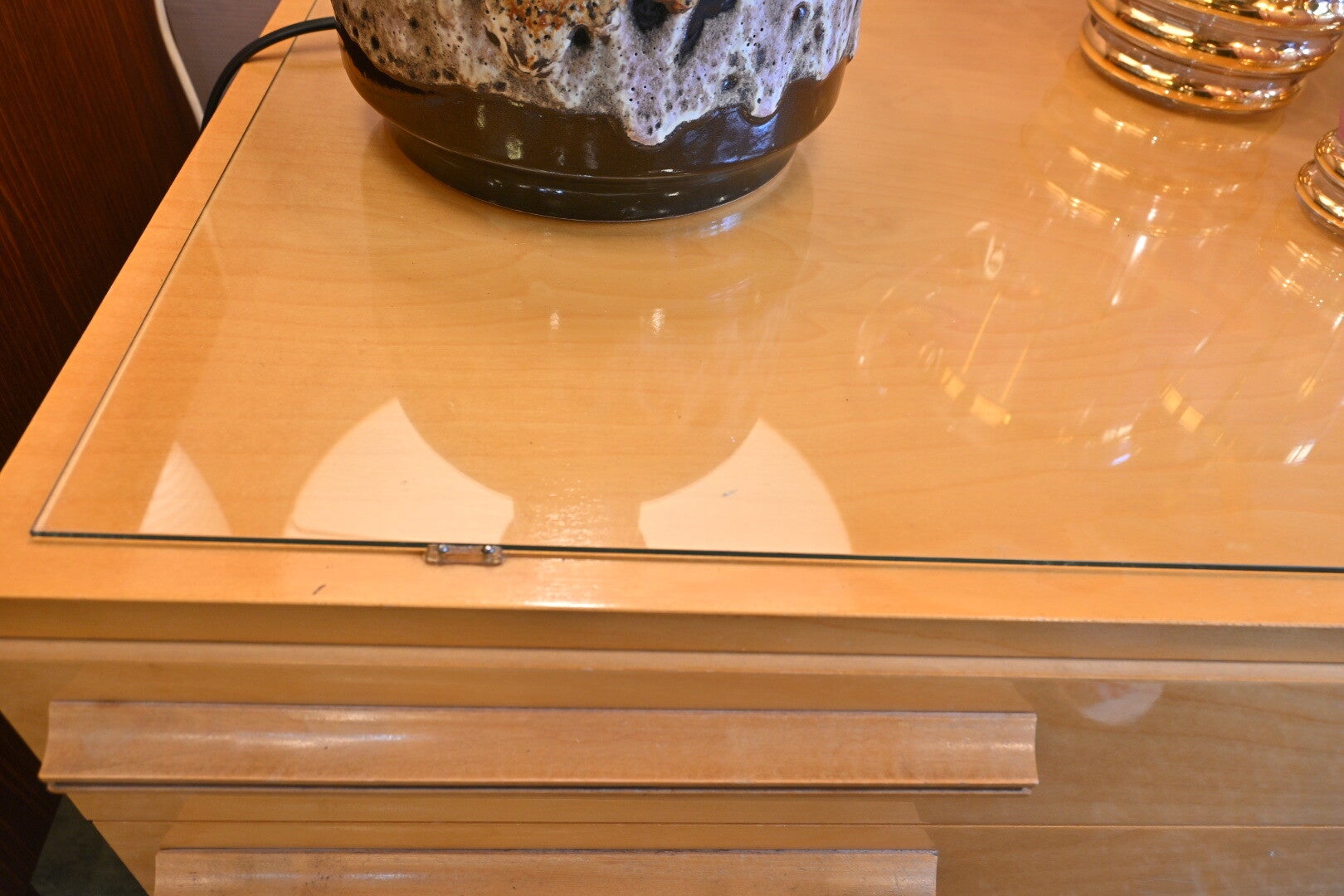 Leuk lowboard, perfect als tv meubel of handig als platenspeler. Superleuk model met genoeg opberg mogelijkheden, een klep deurtje en drie lades. Nog voorzien van de originele glasplaat bovenop. Deurtje is aan de binnenzijde gerepareerd, zit niet helemaal recht.