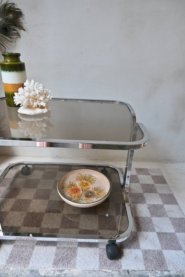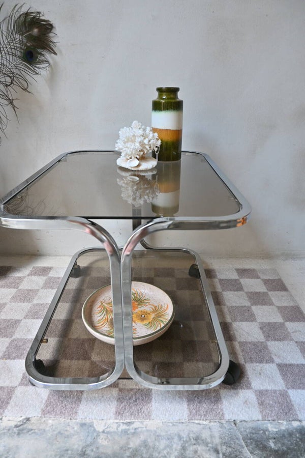 Strak vormgegeven vintage space age trolley van chroom met rookglas uit de jaren 70. De trolley is te gebruiken als salontafel of barcart voor je favoriete flessen drank. De trolley is in goede vintage staat.