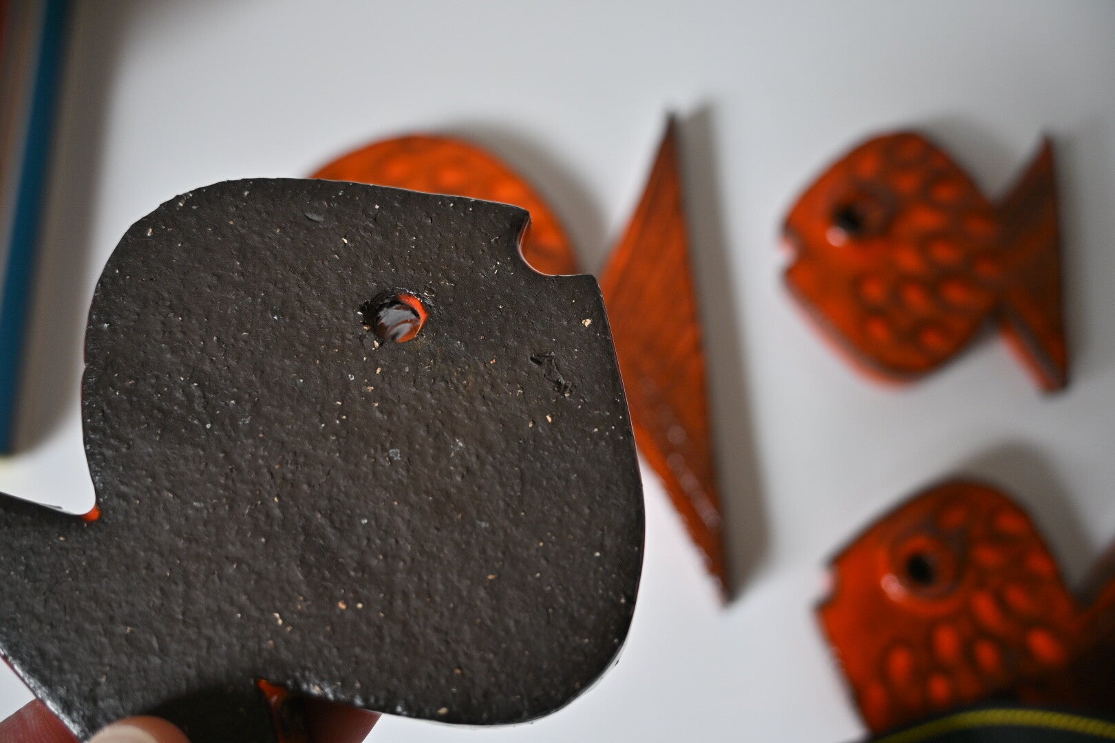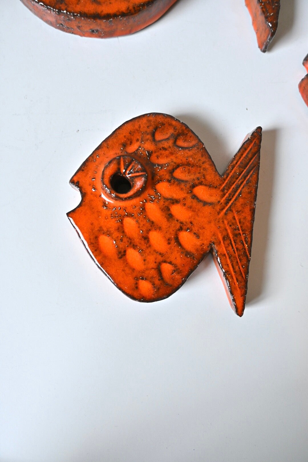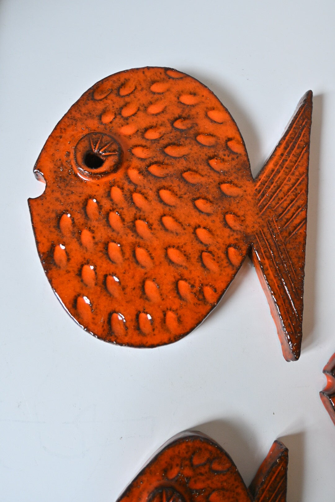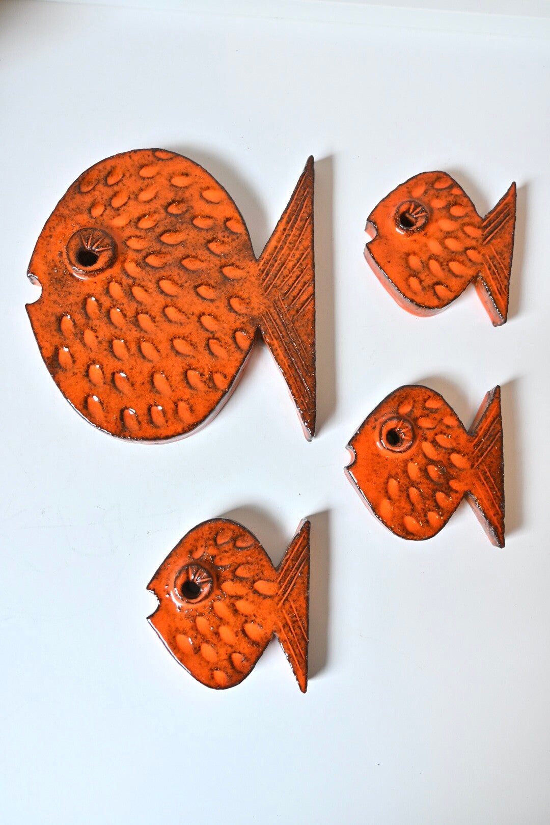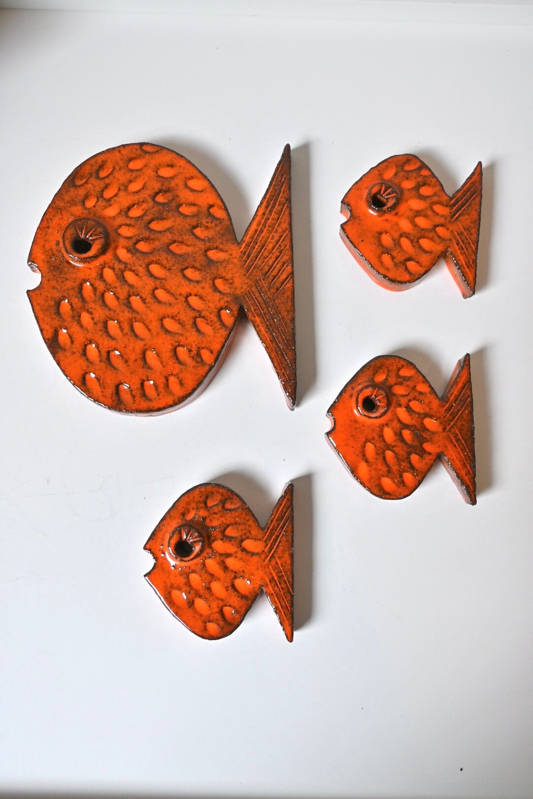 Set van 4 keramieken vissen uit de jaren 70, super leuk item aan de muur. Ophangen zou met een paar spijkertjes kunnen 1 door het oogje en een onder de staart. Of met een plakoogje