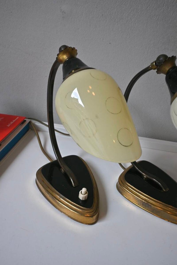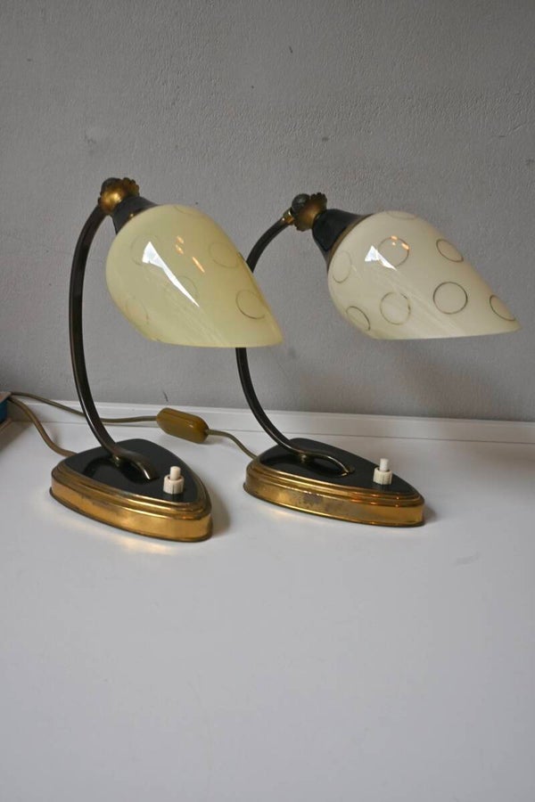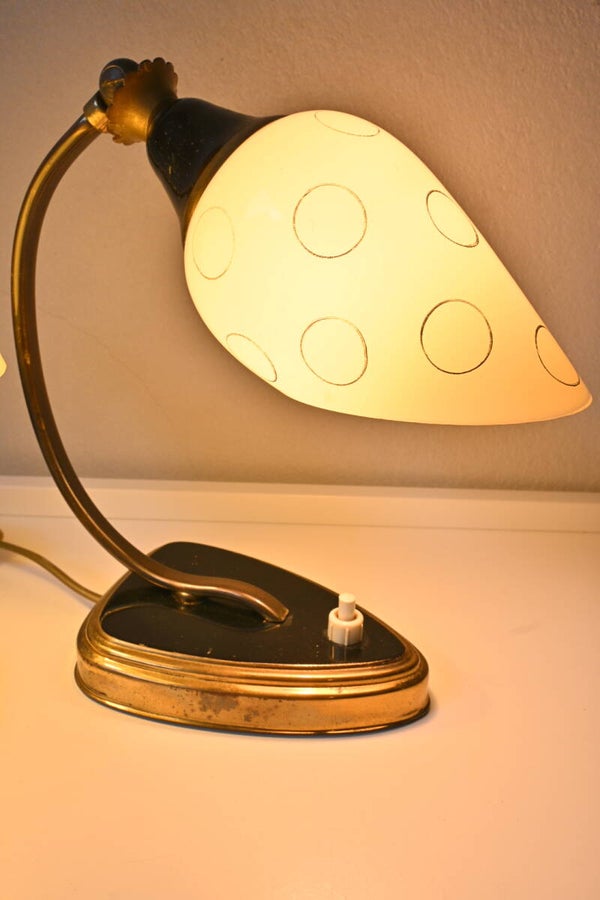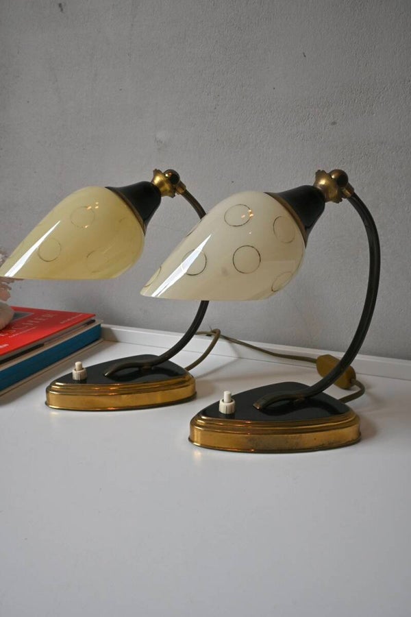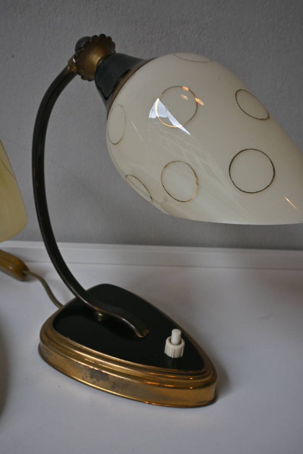 Toffe Tafellampjes van Stilnovo, welke afkomstig zijn uit Italië. De glazen kapjes zijn gedecoreerd met goudkleurige cirkels. Van een lampje zijn de cirkels door de jaren heen wat vervaagd.