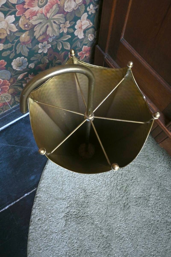 Een messing paraplubak in de vorm van een paraplustandaard, vermoedelijk in de jaren '50, gemaakt in Duitsland. Een bijzonder pronkstuk voor in huis!Lichte plekjes van oxidatie aan de onderzijde achterkant, zie laatste foto!