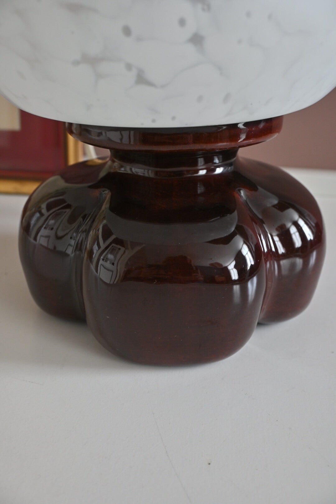 De tafellamp heeft een keramieken gelobde bruine voet, met bijzonder gevormde gemarmerde opaline glazen kap.