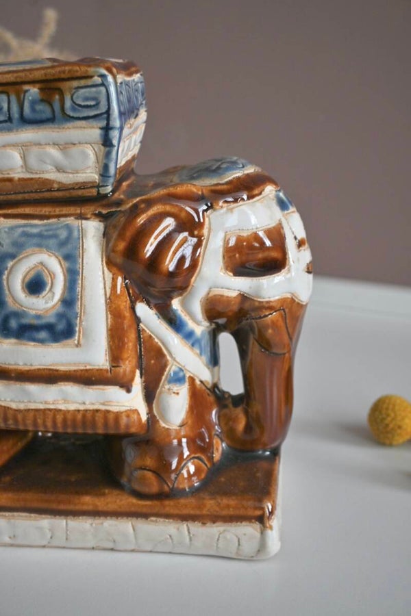 Leuke Oosterse olifant van keramiek in mooie bruin met blauwe kleuren. Ook leuk om een mini plantje op te zetten.