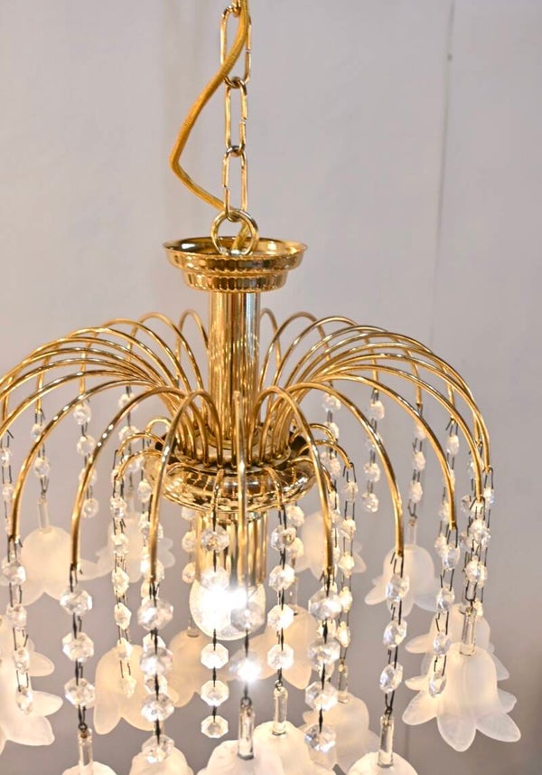 Mooi Paolo Venini hanglamp, Jaren 70 Italiaanse hanglamp. Messing frame met 18 witte glazen bloemen, en kristallen pegeltjes. Geeft prachtig licht.