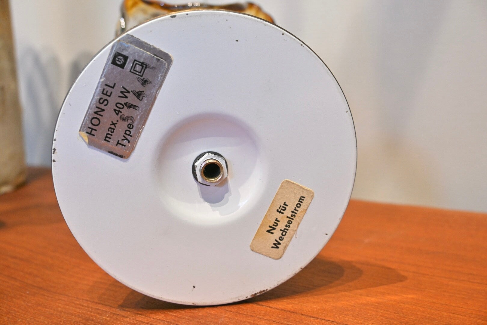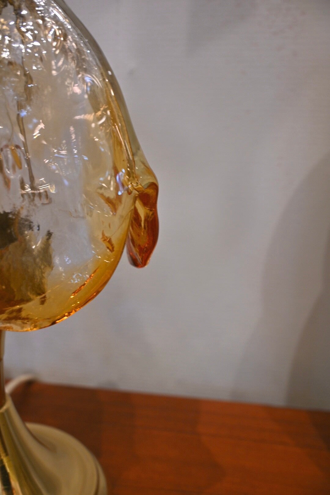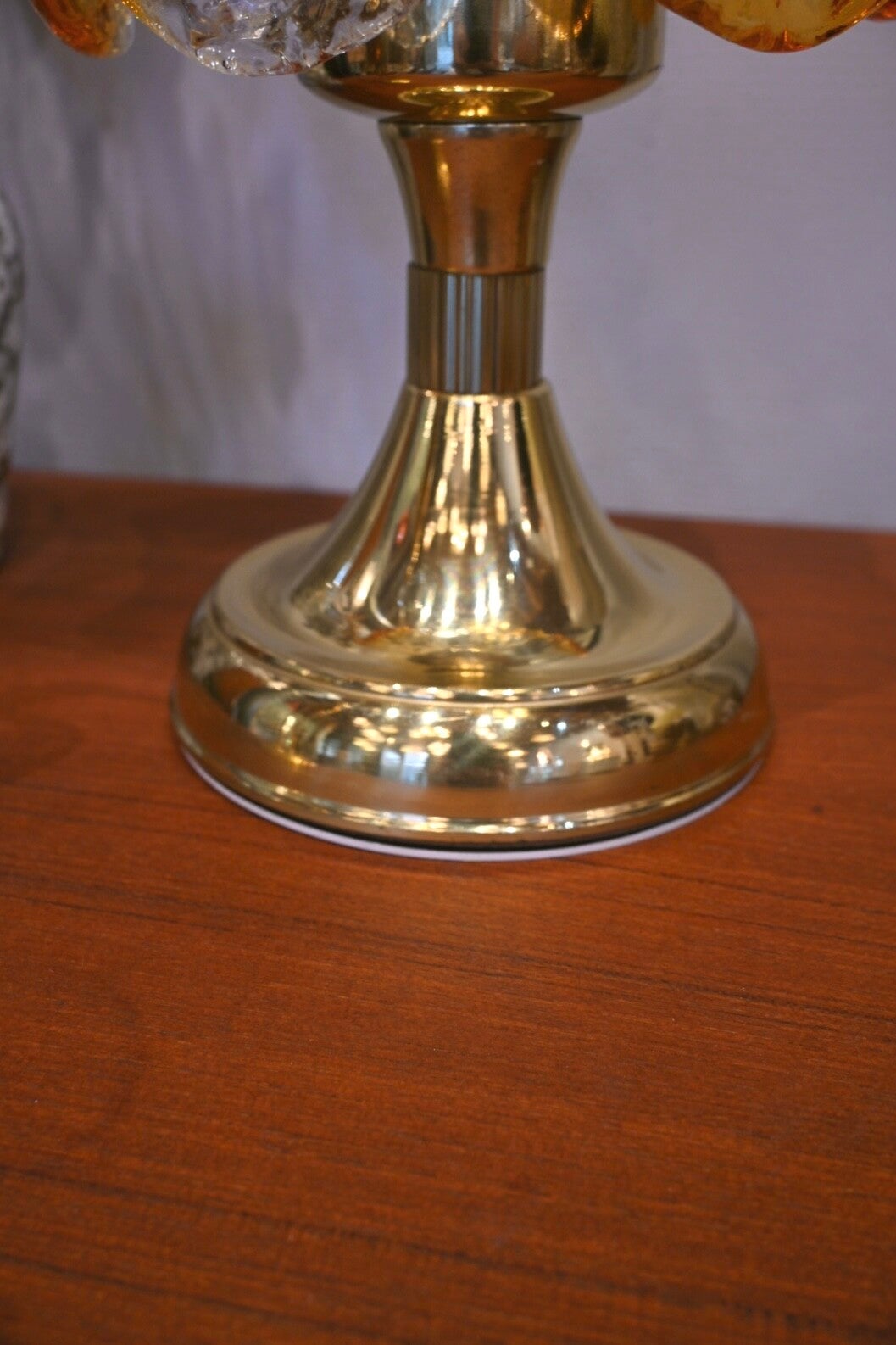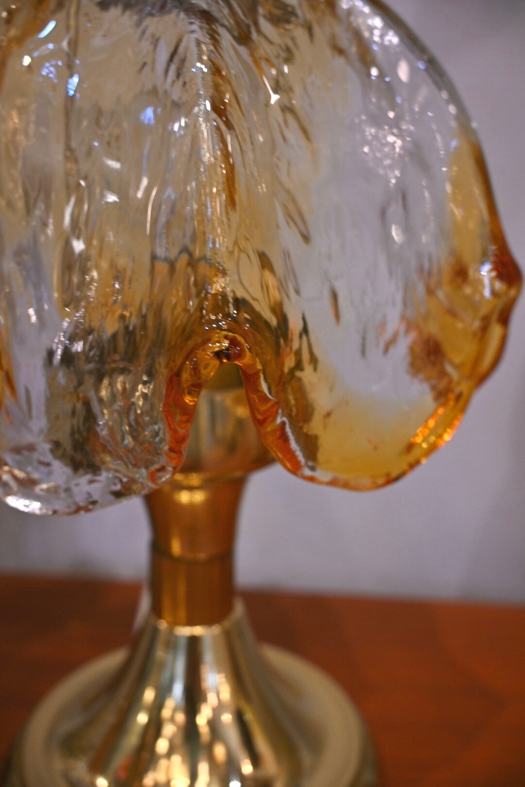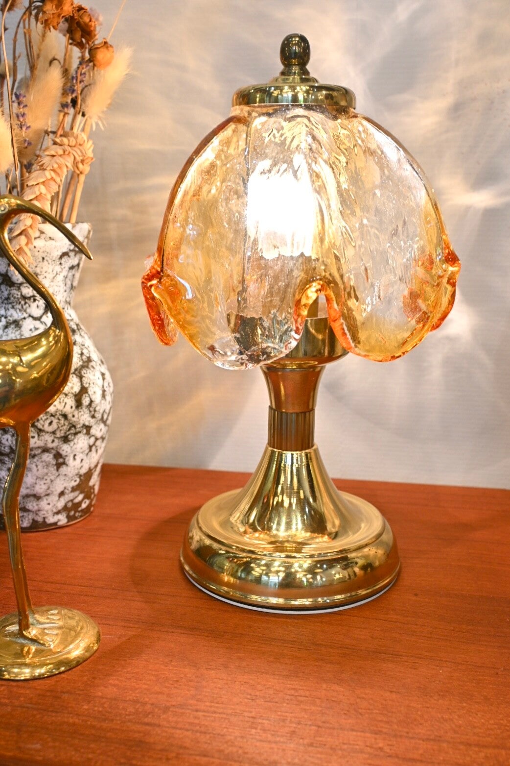Materiaal: De lamp heeft een messing voet en een amberkleurige glazen kap.