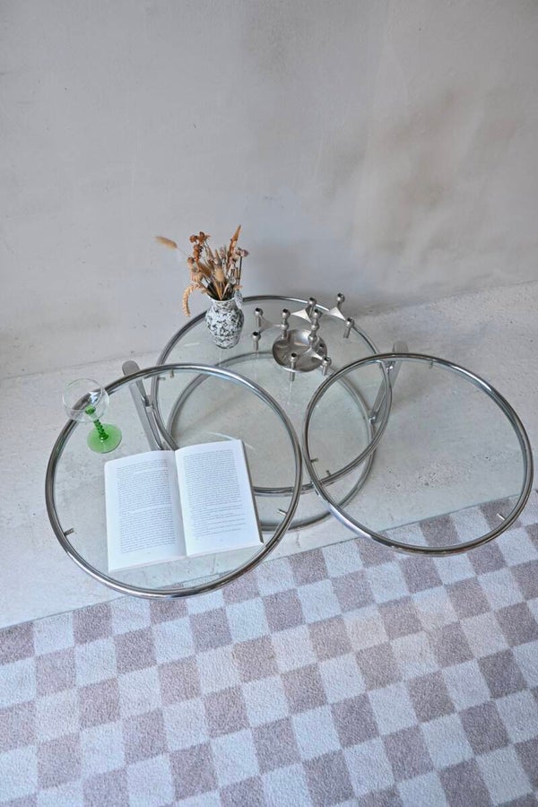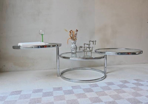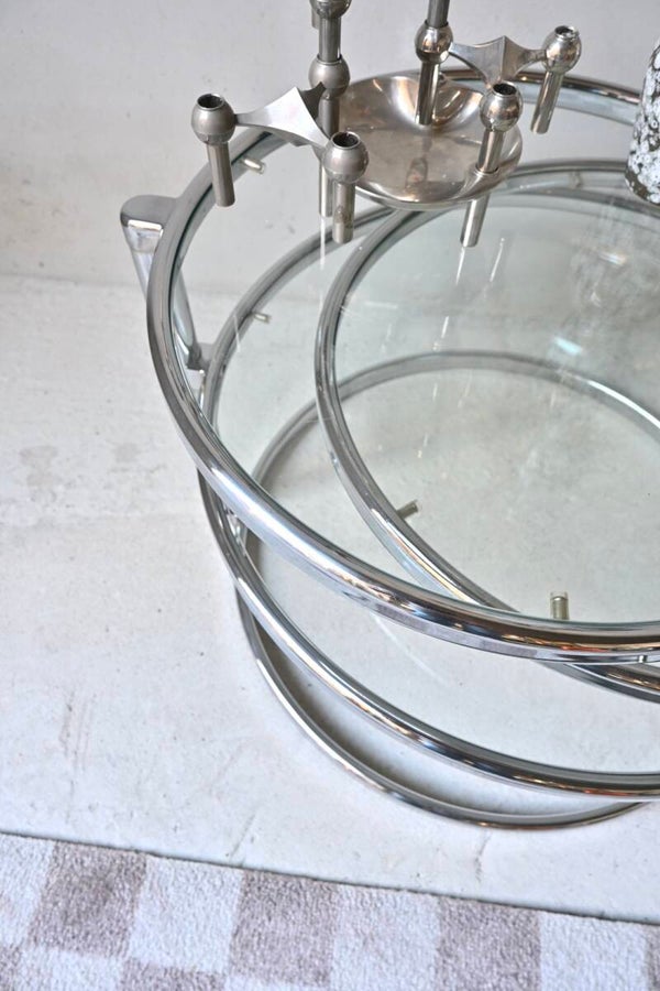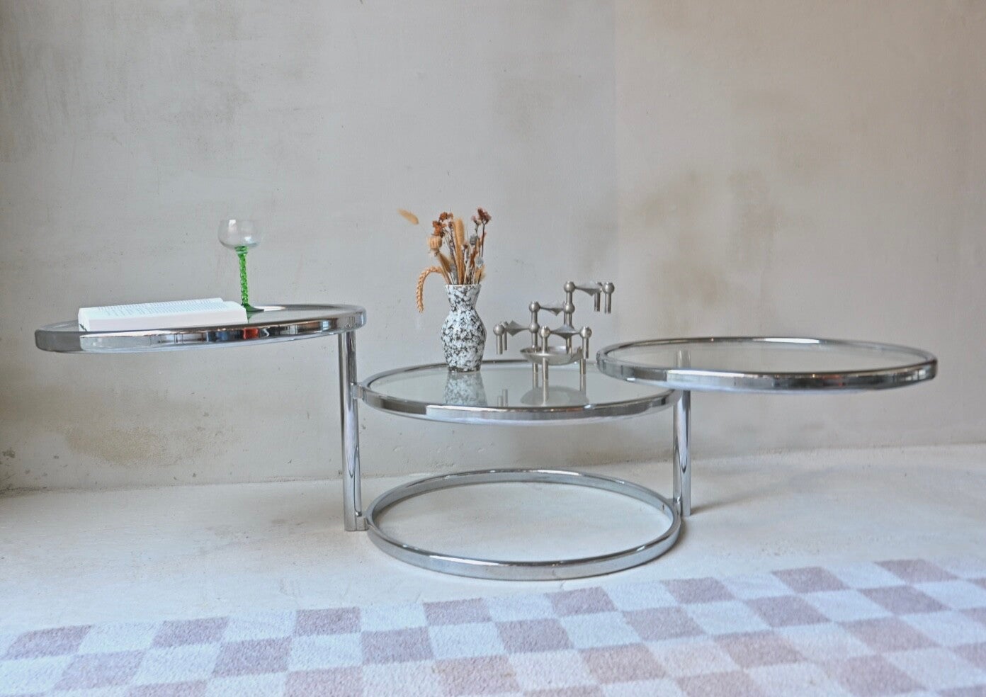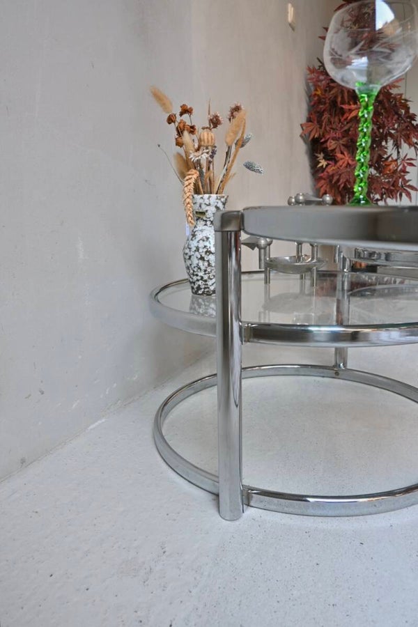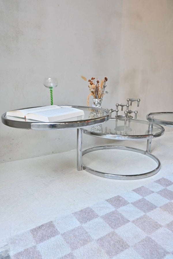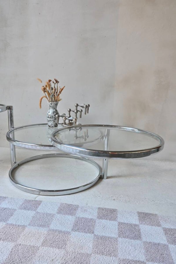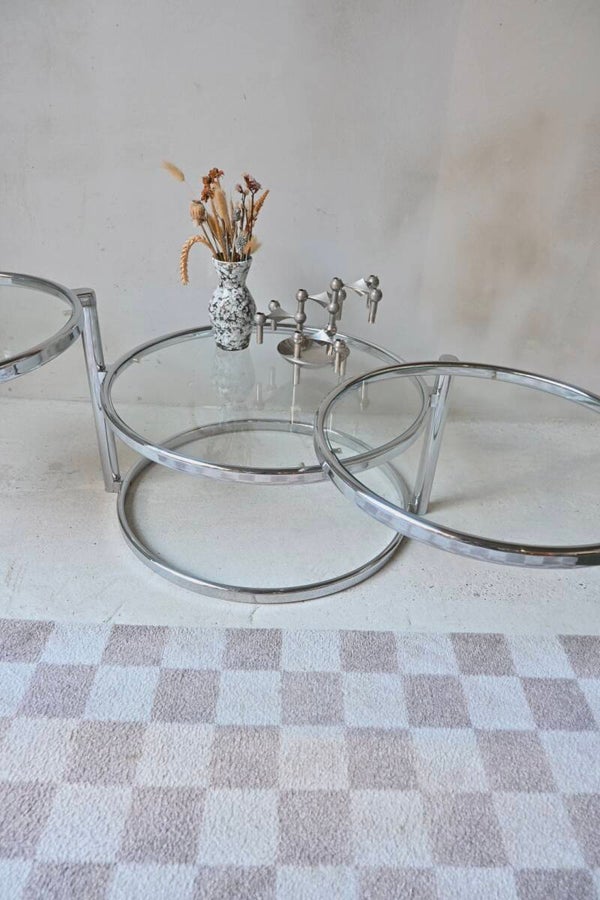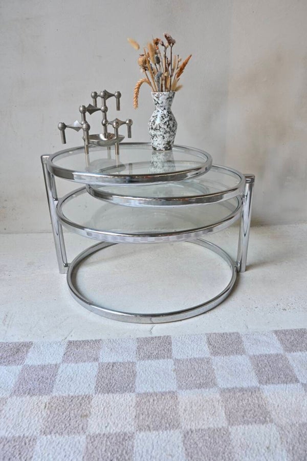 Mooie jaren 70 Swiveltafel Jaren 70 in chroom met transparant glas uitgevoerd. De bovenste bladen kunnen speels rondgedraaid worden waardoor ze heel praktisch de ruimte kunnen vullen.