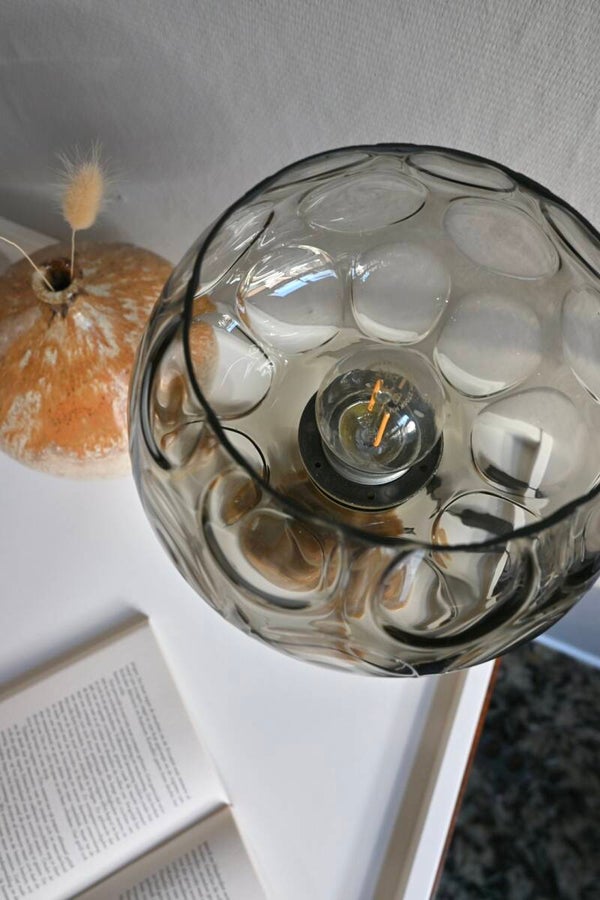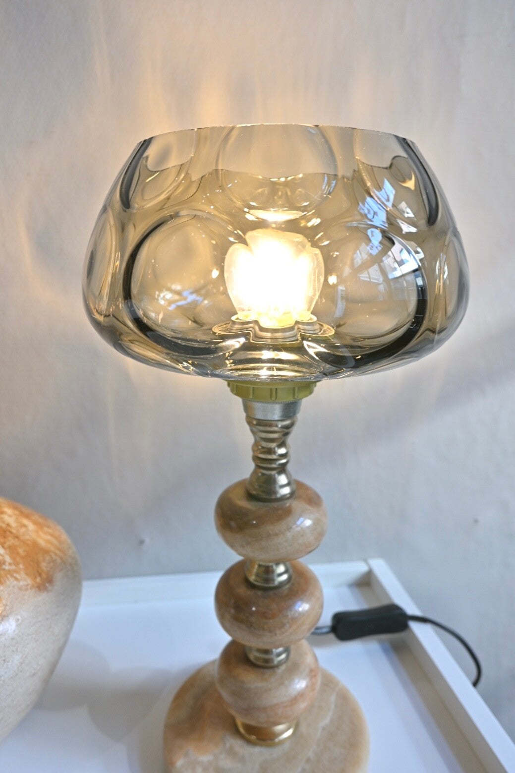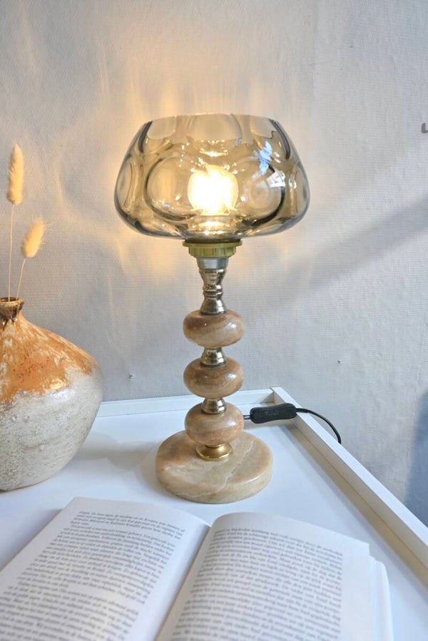 Mooie tijdloze tafellamp met rookglazen Murano kap, voet met afgewisseld onyx en metaal.