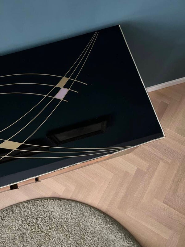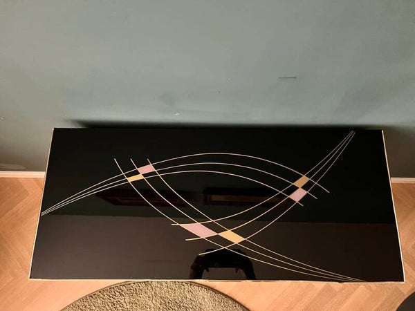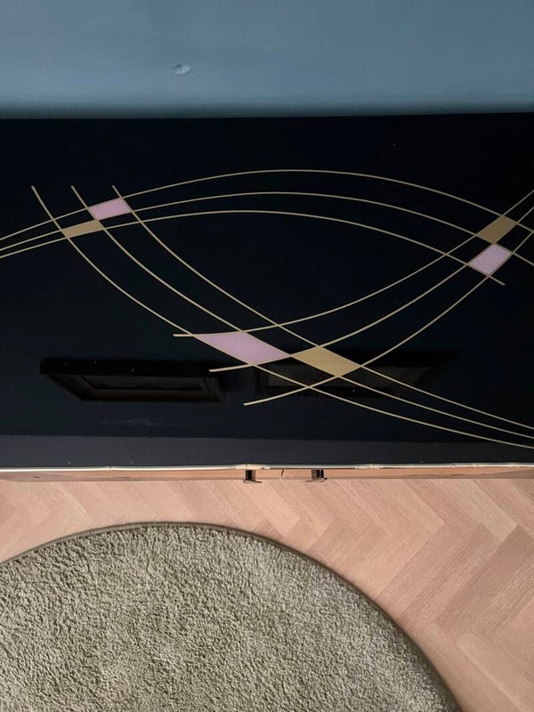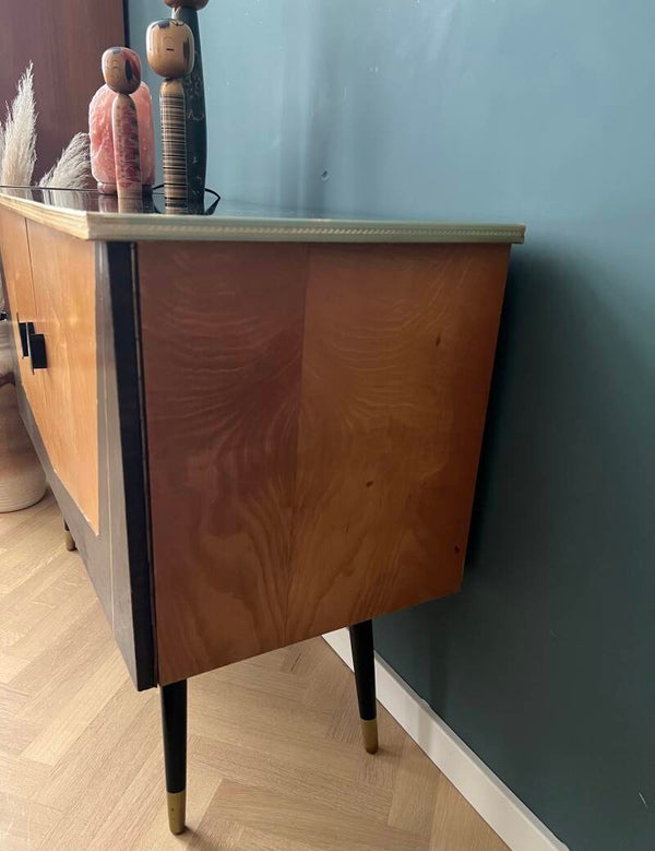Heel gaaf vintage dressoir in rockabilly-stijl, mooi glazen blad met geometrisch patroon in het glas. Gecombineerd met mooi blond hout en zwarte details.