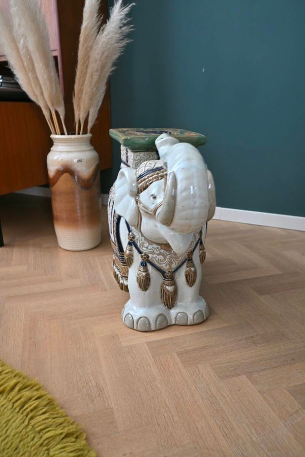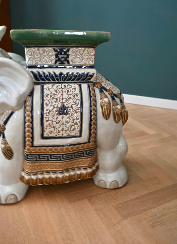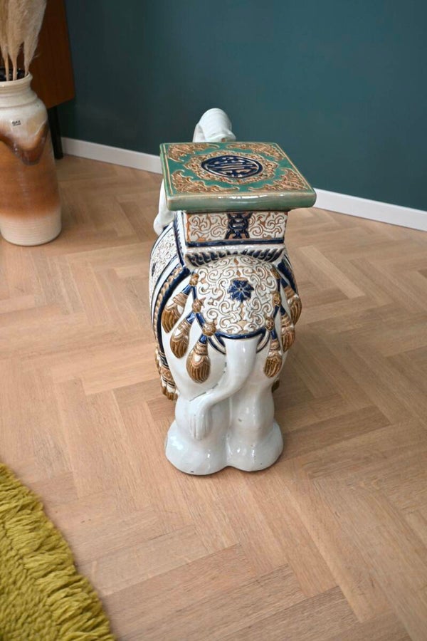 Prachtige vintage keramieken olifant in Oostere stijl.In topstaat zonder beschadigingen!Te gebruiken als plantenstandaard of bijzettafel.