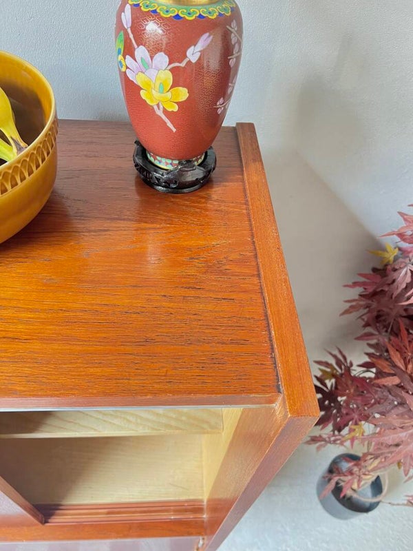 Vintage highboard gemaakt van teakfineer fineer afkomstig uit de jaren 60. De kast bestaat uit twee grote schuifdeuren met daarachter een grote legplank. Onder de grote schuifdeuren bevinden zich twee kleine deurtjes. Super veel opruimmogelijkheden dus. Vergeet niet naar de prachtige pootjes te kijken. Maak je vintage interieur helemaal af met deze waanzinnige kast.