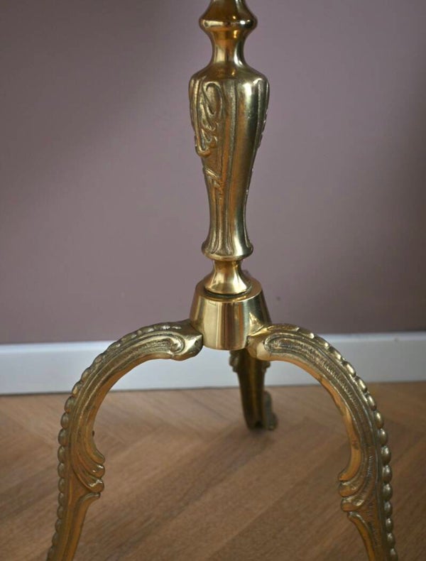 Mooi bijzettafeltje met narmer blad en messing onderstel. Voorzien van drie elegante pootjes en een sierlijke messing rand.