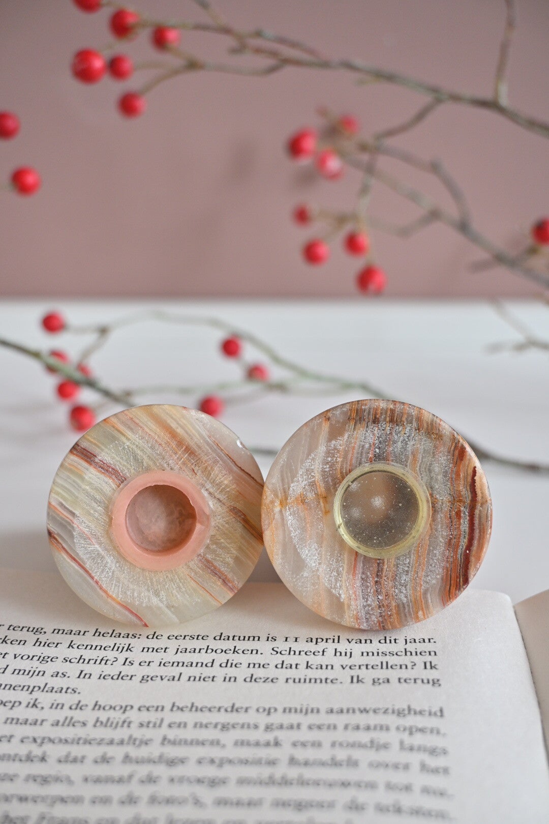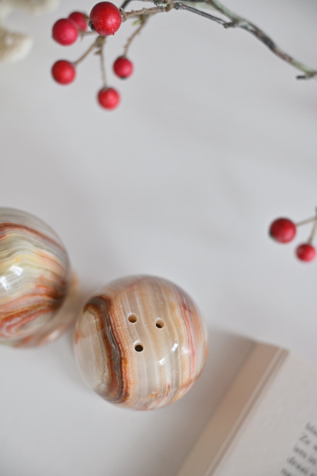 Hele leuk marmer peper en zout stel, decoratieve items voor in je keuken. De set verkeert nog in een mooie staat, alleen een heel klein chipje op de onderkant van de peper houder, zie lastste foto.