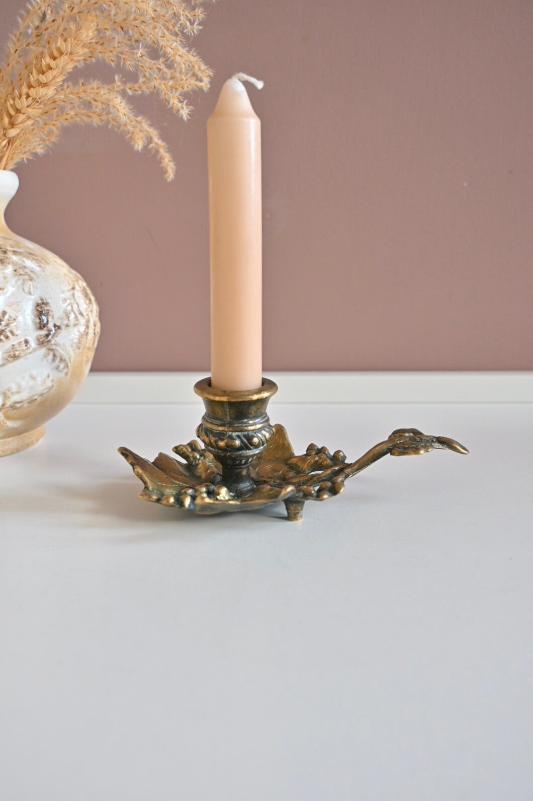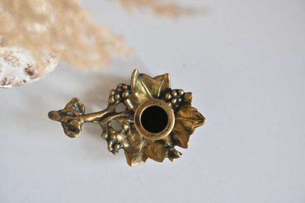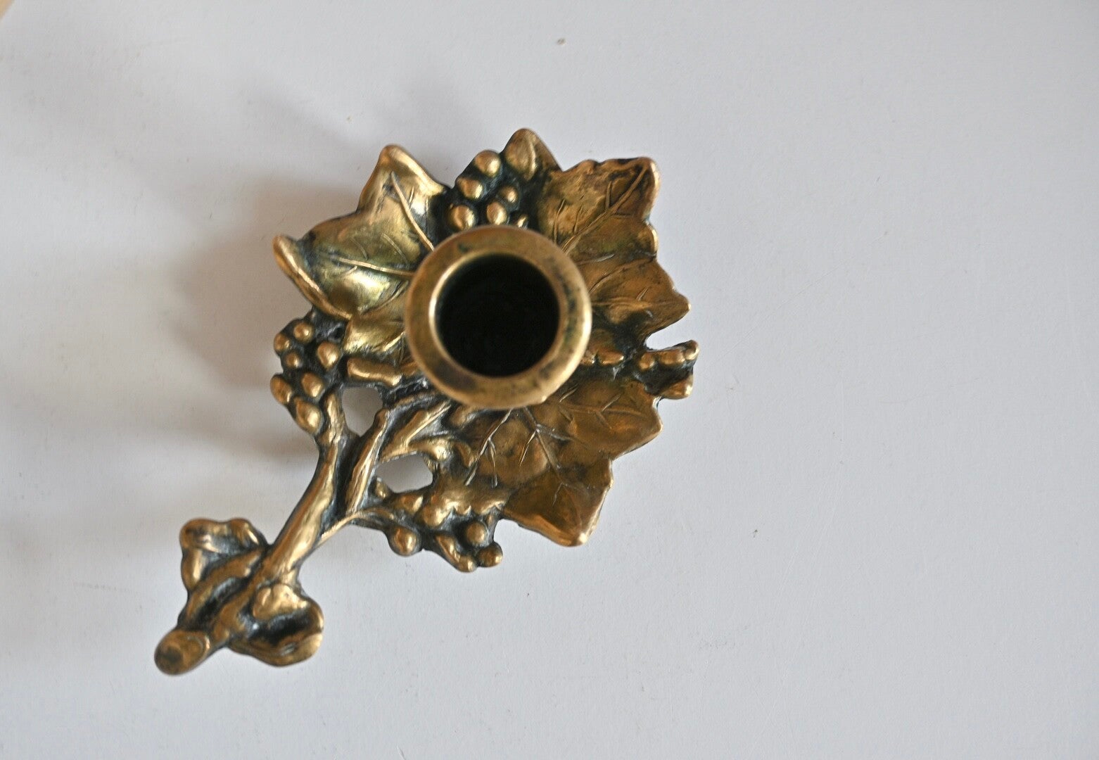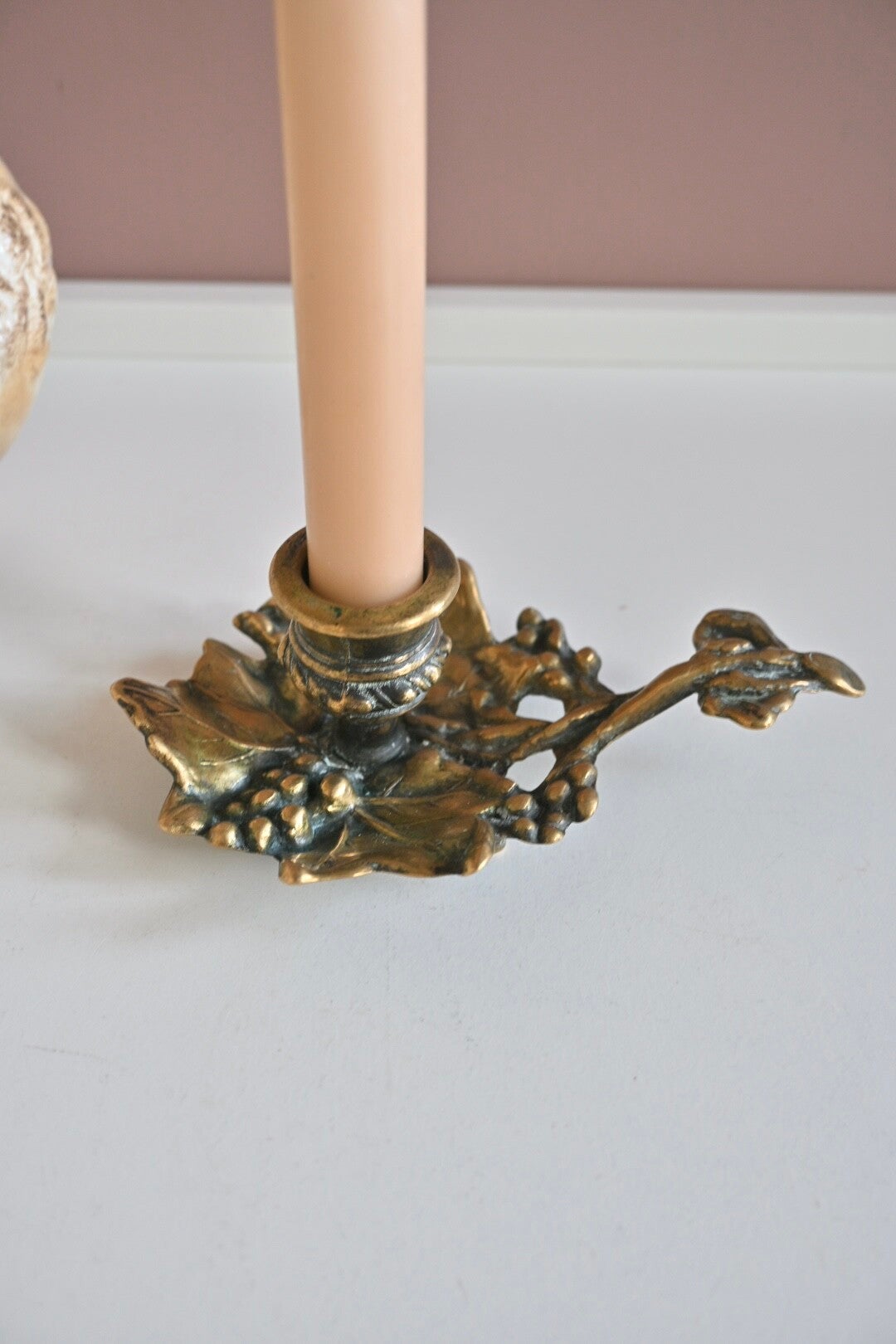 Mooie antieke messing kandelaar met een natuurlijke patina Deze kandelaar heeft een decoratief ontwerp met bladeren en druiven.L: 15cm B:9cm H:5cm