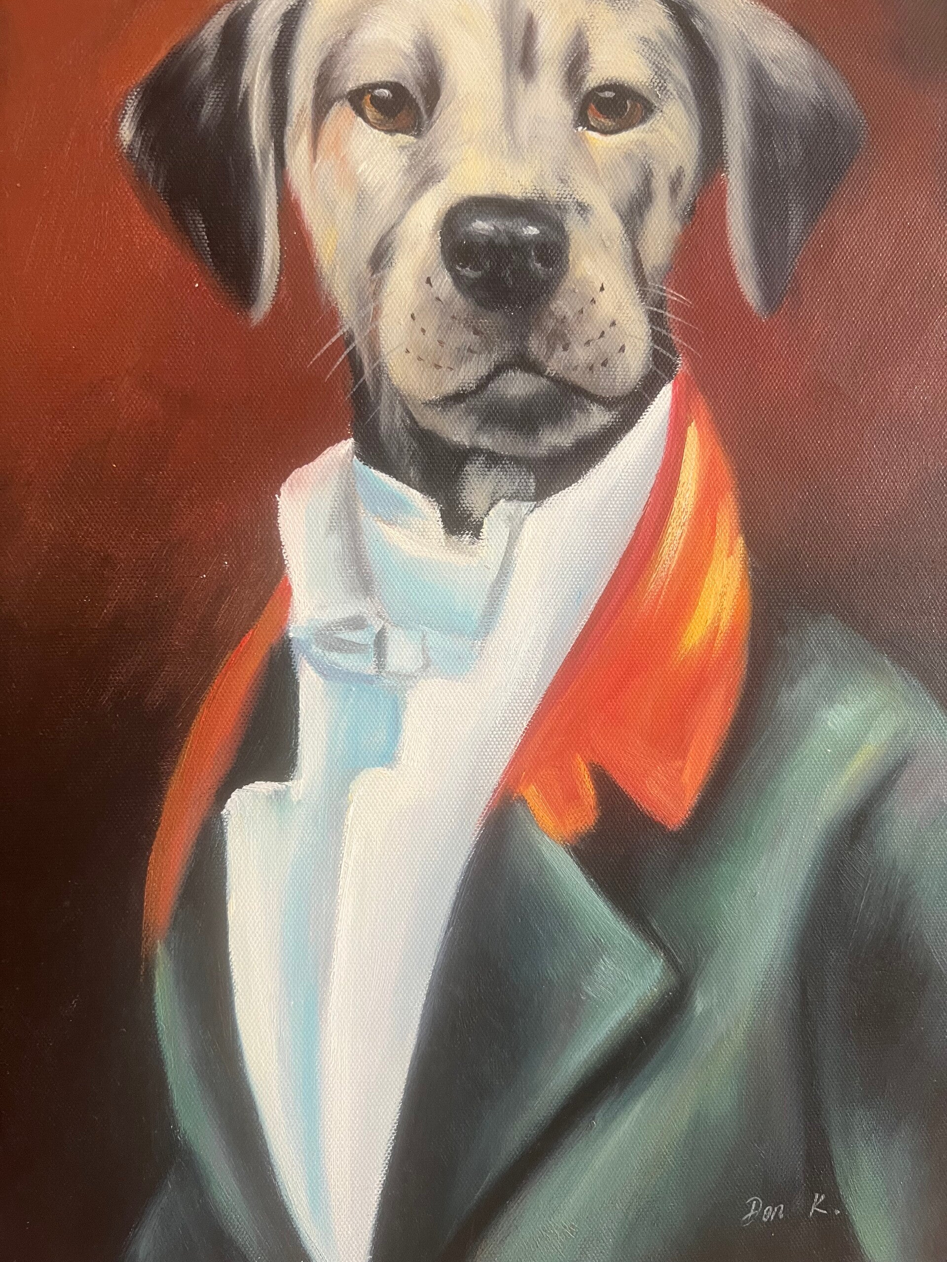 Heel mooi olieverf schilderij van een hond in 19e eeuws kostuum. Het schilderij is in een stijl die doet denken aan klassieke portretten. Gesigneerd met Don K, rechts onder in de hoek.