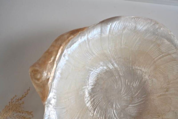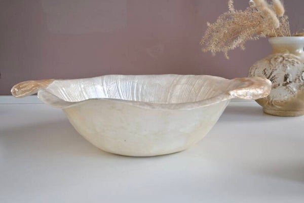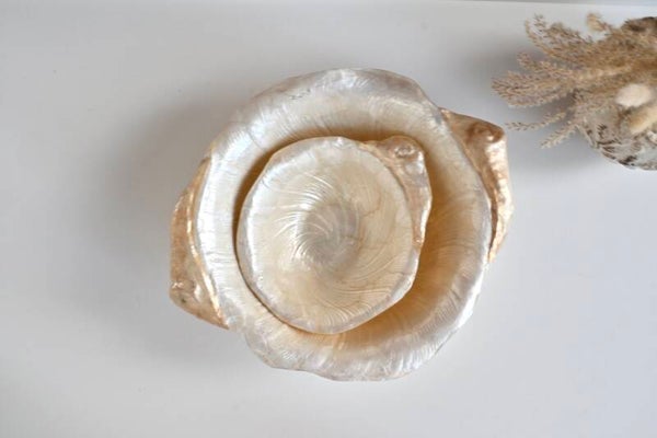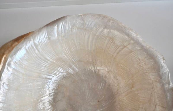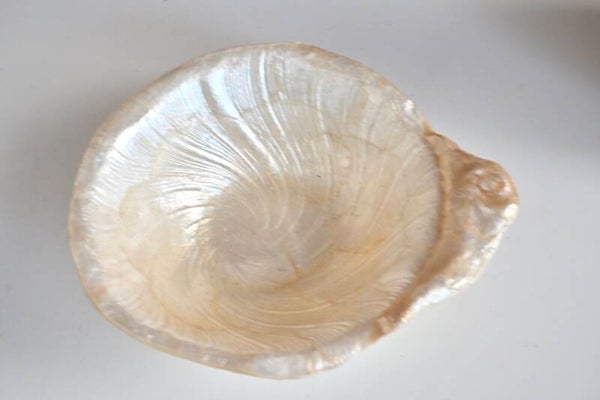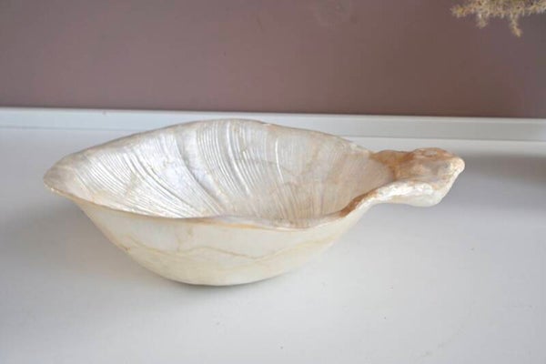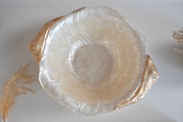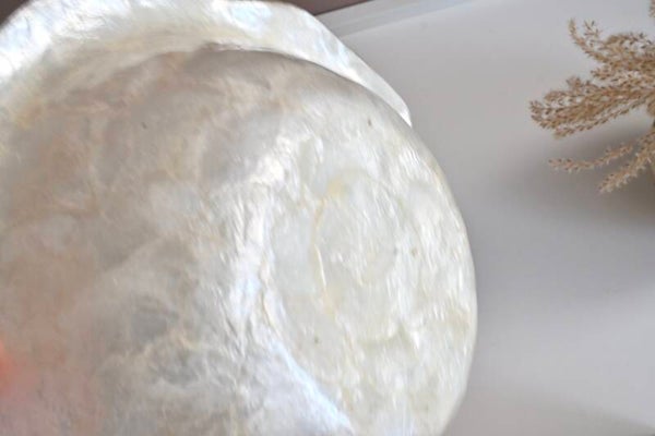 Twee decoratieve capiz schelpenschalen, mooi ter decoratie of als opbergers voor diverse spulletjes.Groot H:8cm B:34cm D:29Klein H:5cm B:21cm D:18cm