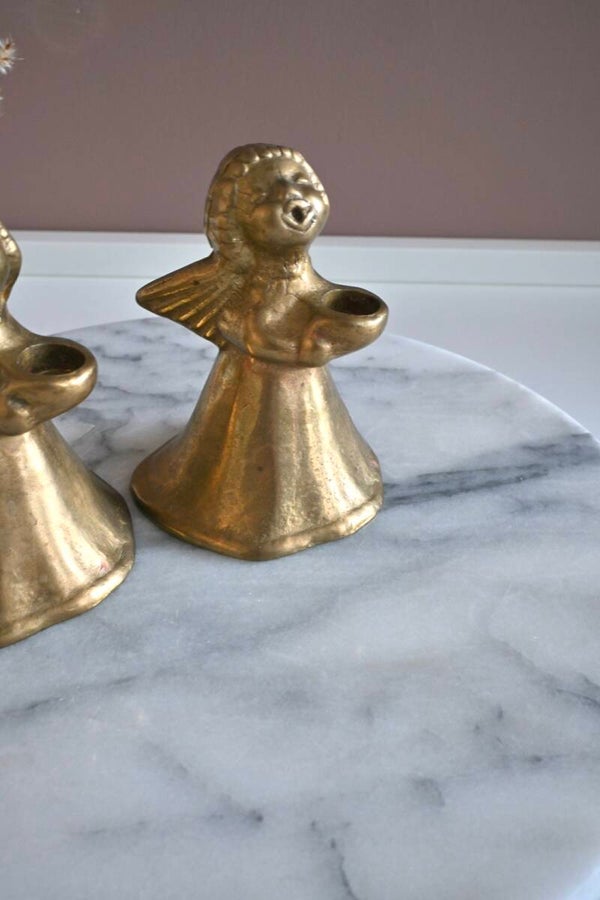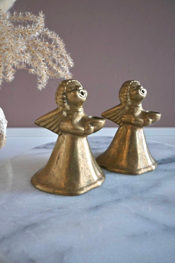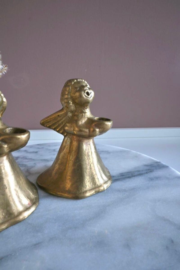 Twee zingende massief (zware kwaliteit) messing engeltjes uit de jaren 60, je kunt er een kleine kaars in doen. Mooi voor tijdens de feestdagen of voor de verzamelaar. H: 9,5cm B: 7cm D: 6,5cm Plek voor kaarsje Dia: 1,2cm
