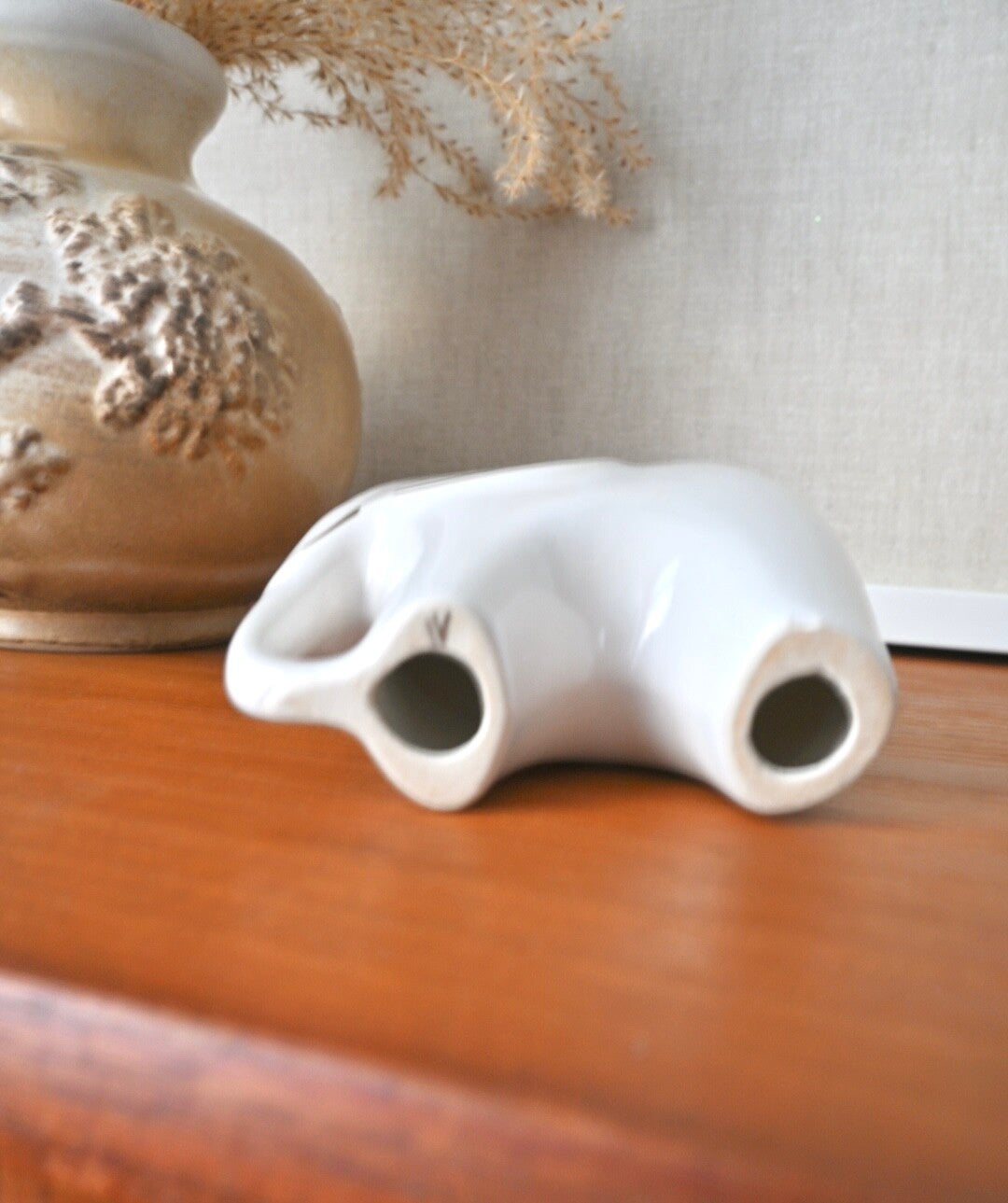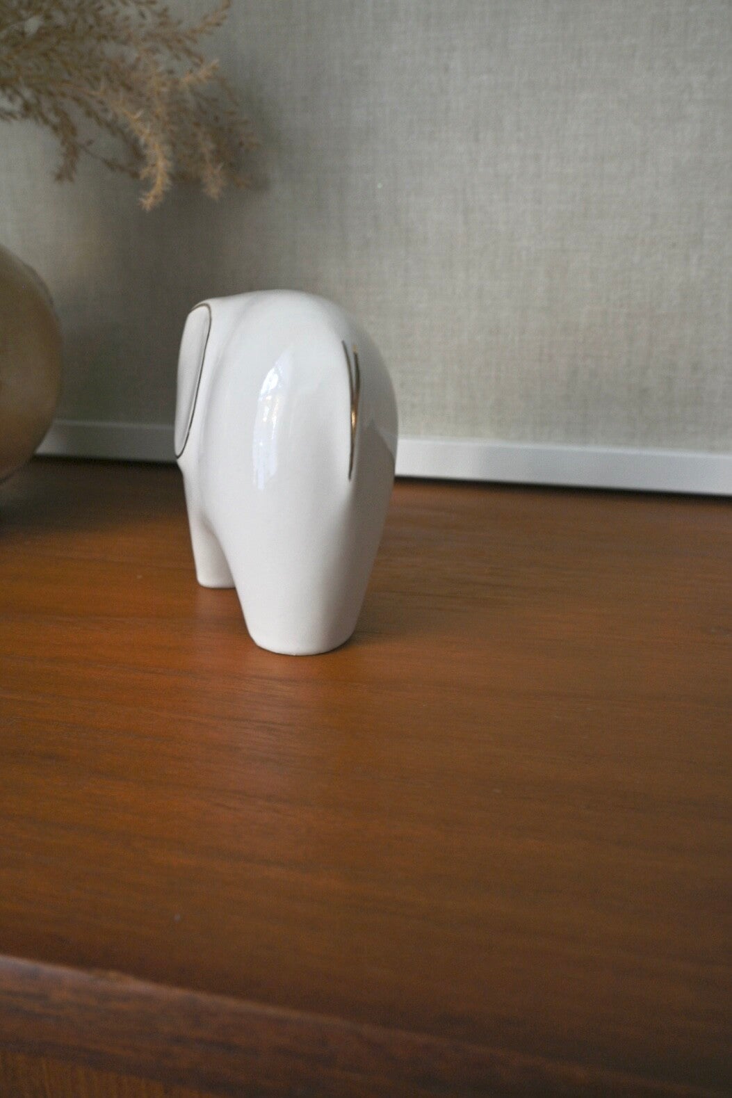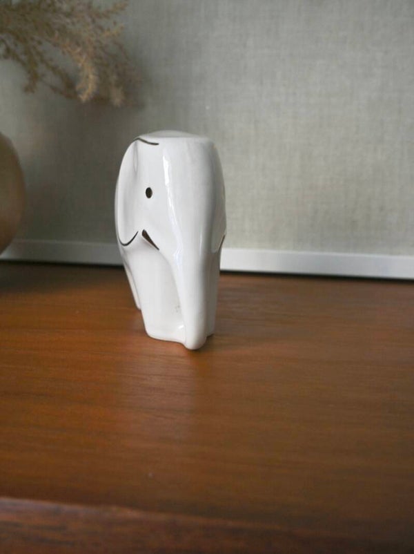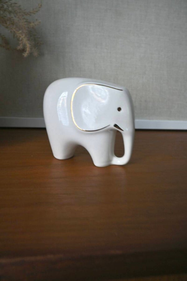 Heel mooi beeldje van een olifant. Het beeldje is gemaakt van porselein in de kleuren wit met gouden details.Dit is een vintage beeldje wat nog in een mooie staat verkeert.H:8cm B:10cm D:5cm