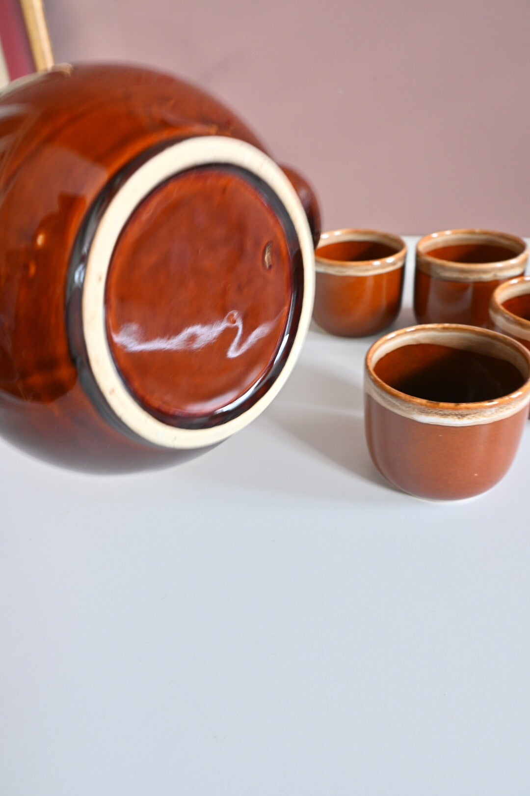 Mooi vintage theeservies van keramiek, bestaande uit een theepot met handvat van riet 850ml en 5 bijpassende thee mokjes. Alles verkeert nog in een hele goede staat, geen chipjes of iets dergelijks.