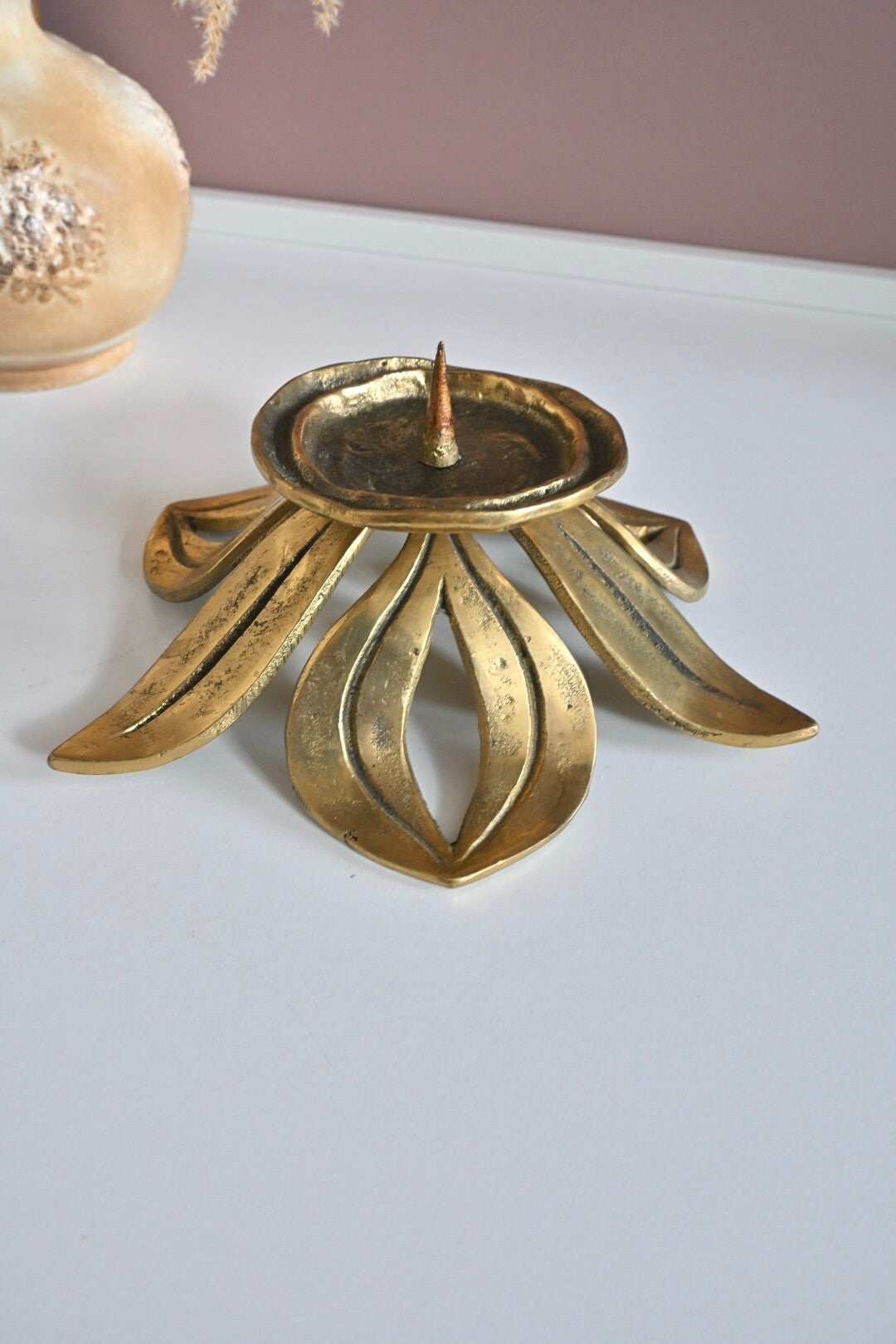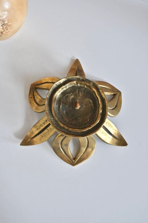 Vintage kandelaar van massief messing uit de late jaren 60/70. Een prachtige mix van brutalistische en florale elementen. Ideaal voor stompkaarsen tot circa 7 cm in diameter. Goede staat met een patina passend bij de leeftijd. H:10cm Dia:21cm