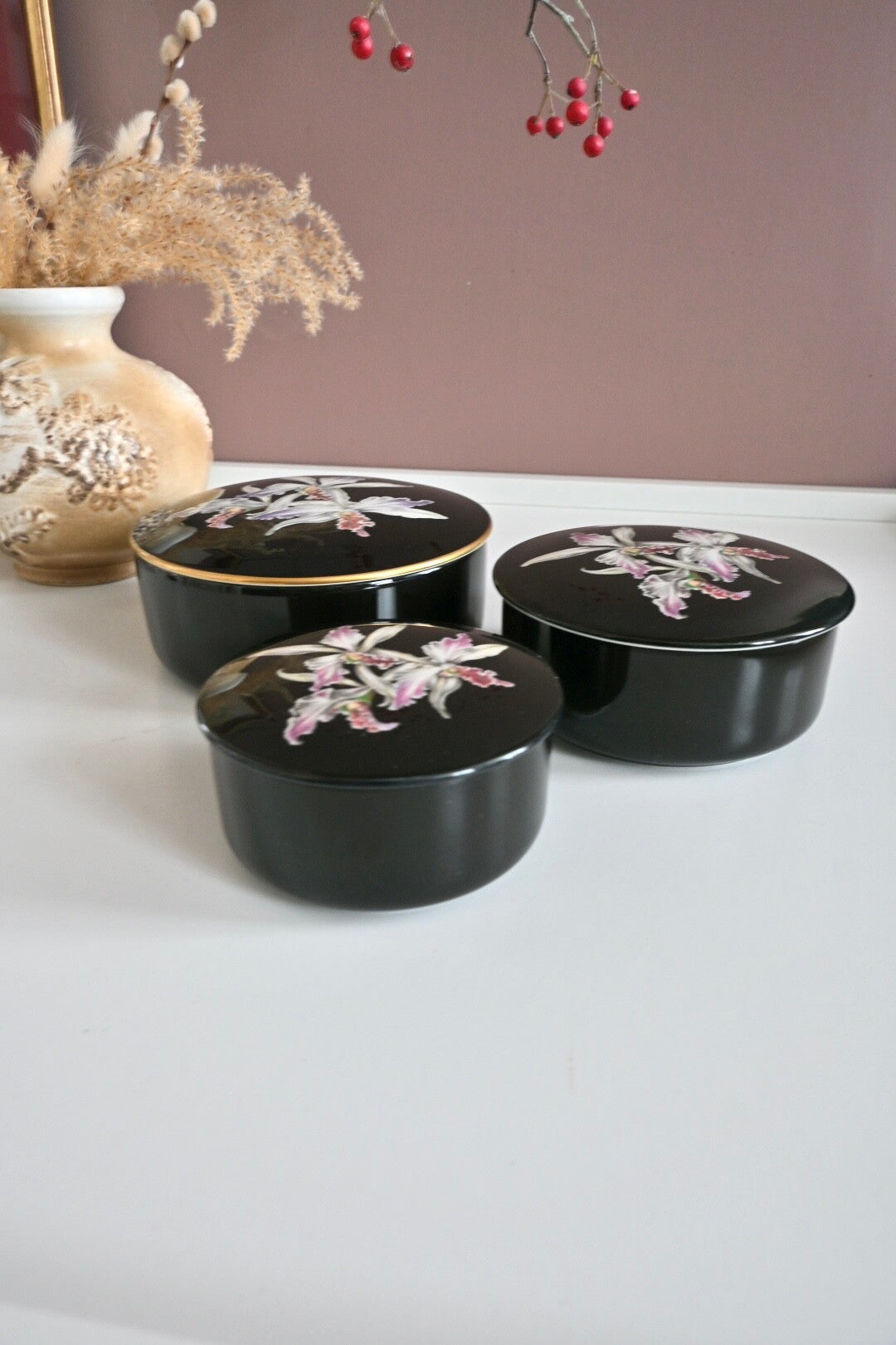 Drie Zwarte porseleinen deksel schaaltjes van Villeroy & Boch, uit het decor "Orchidee" De schaaltjes zijn versierd met wit-paarse orchideeënbloemen. Alleen de grootste heeft een goudkleurige rand om het dekseltje.