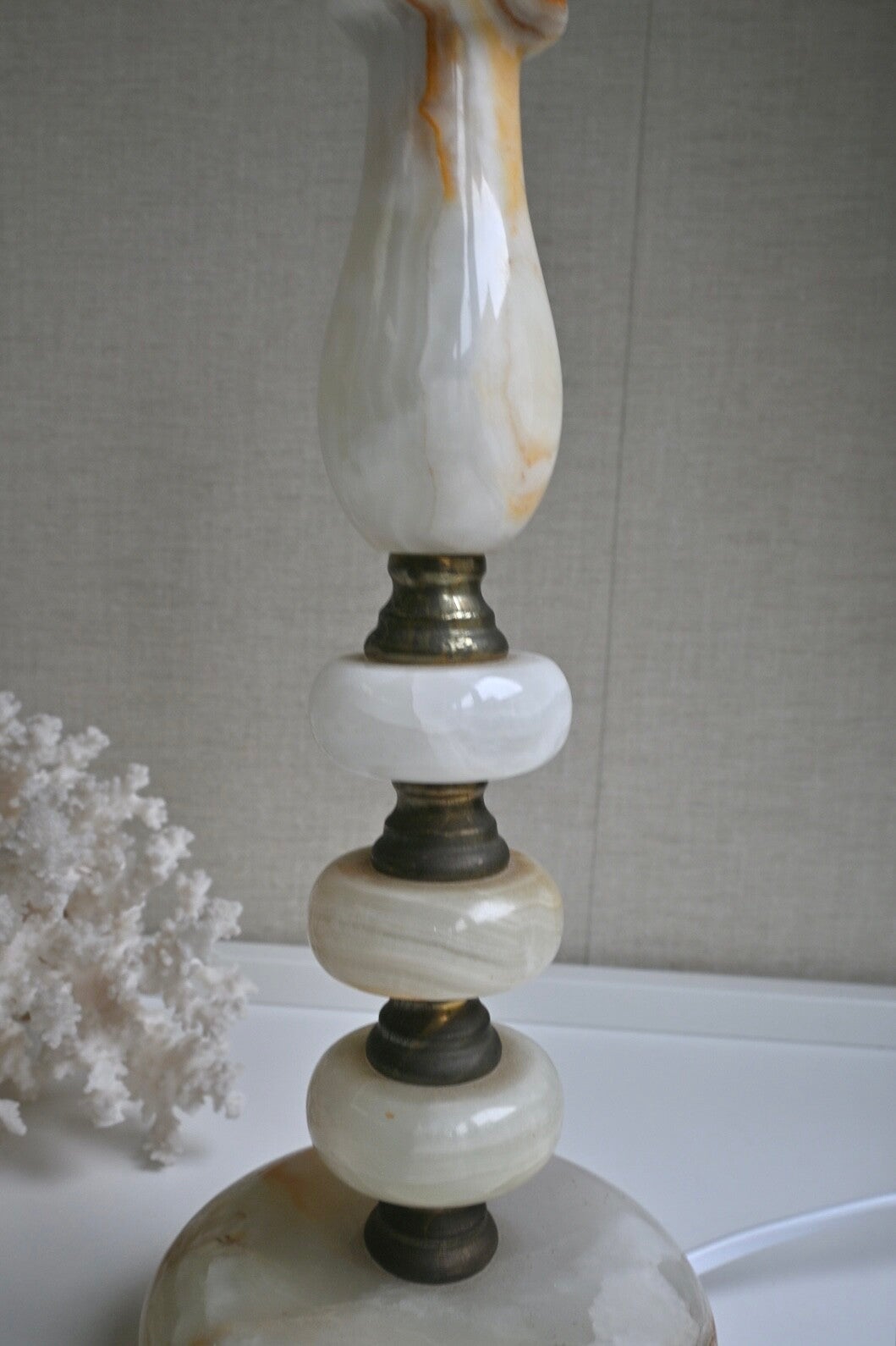 Mooie tafellamp met een voet van marmer, subtiel gecombineerd met messing details. De sierlijke vissen-pootjes geven de lamp een decoratief karakter. De lamp is opnieuw bekabeld.