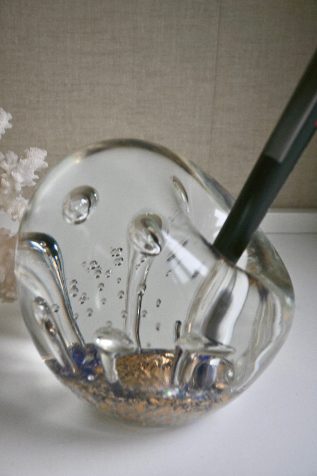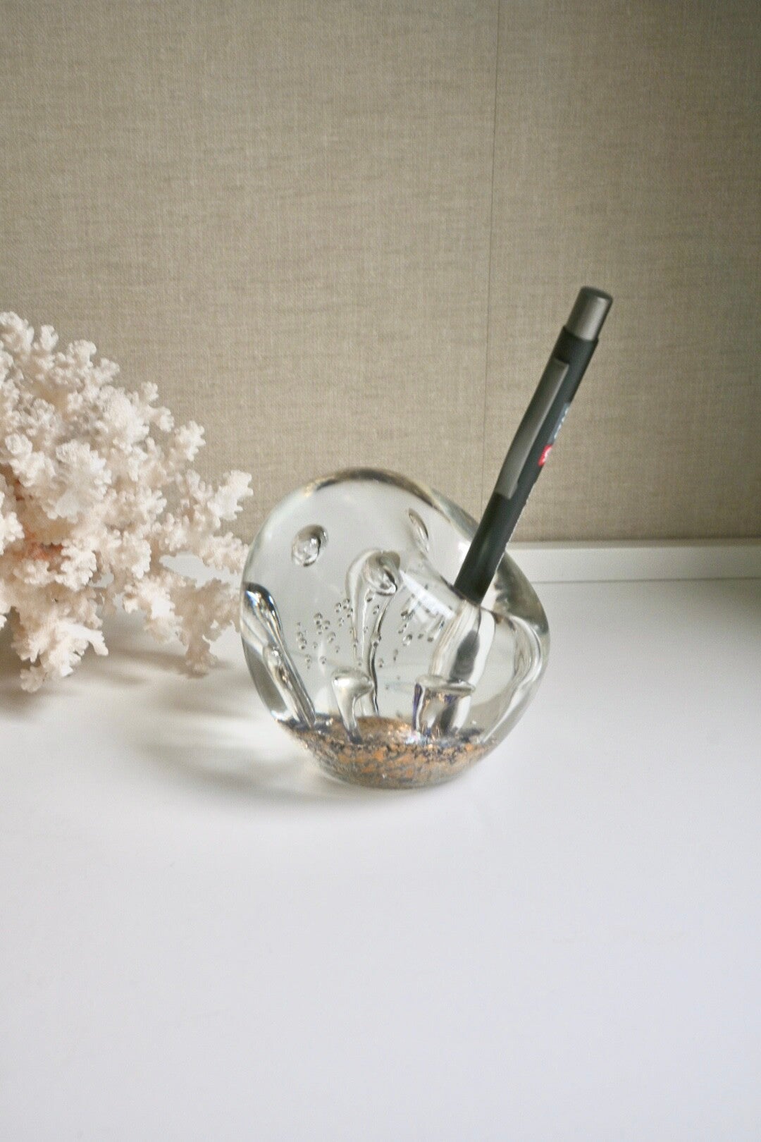 Hele mooie glazen penhouder/presse-papier. Heel bijzonder en tevens functioneel ontwerp. Mooi voor op een bureau of toonbank.