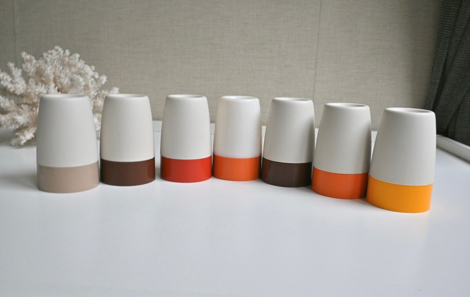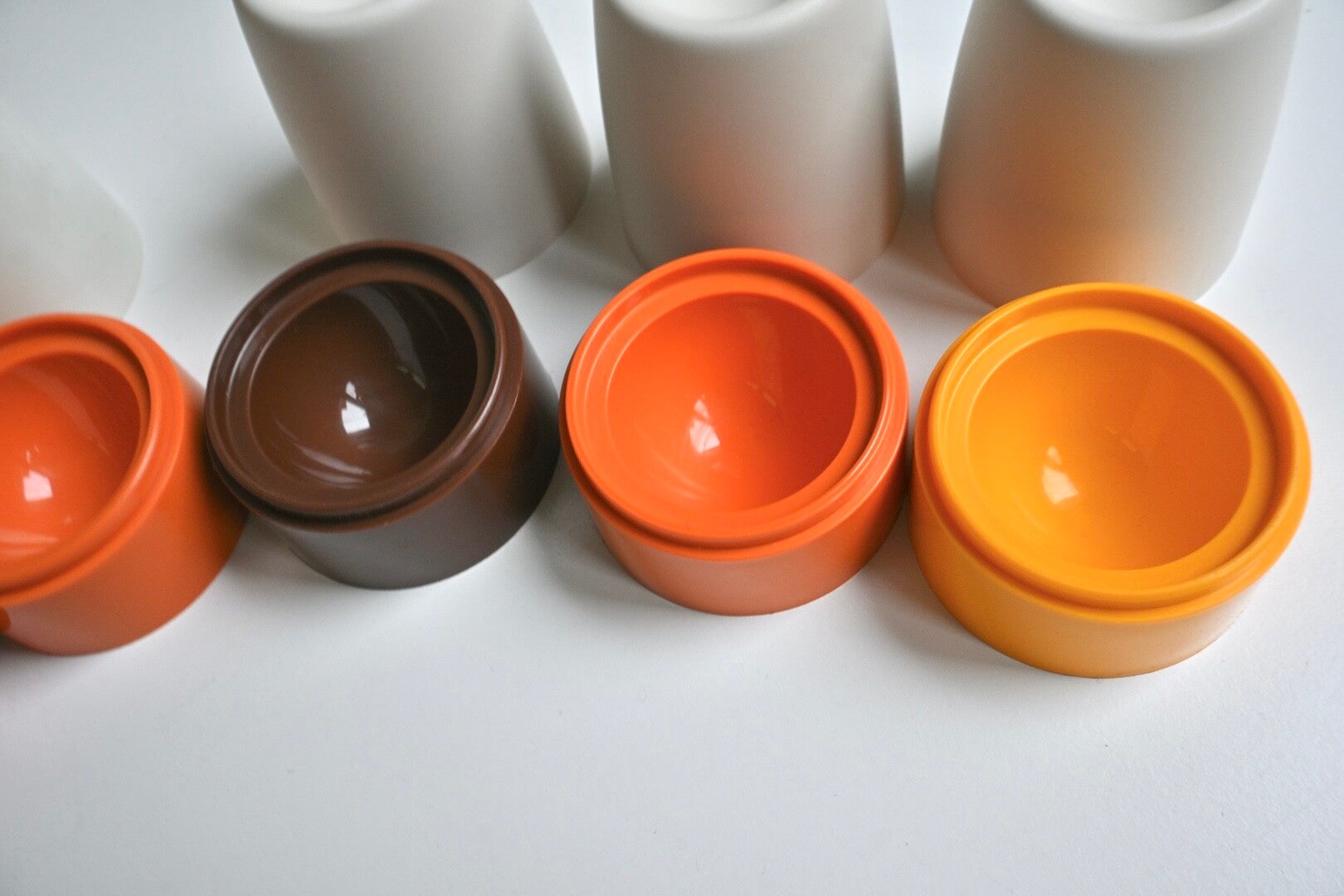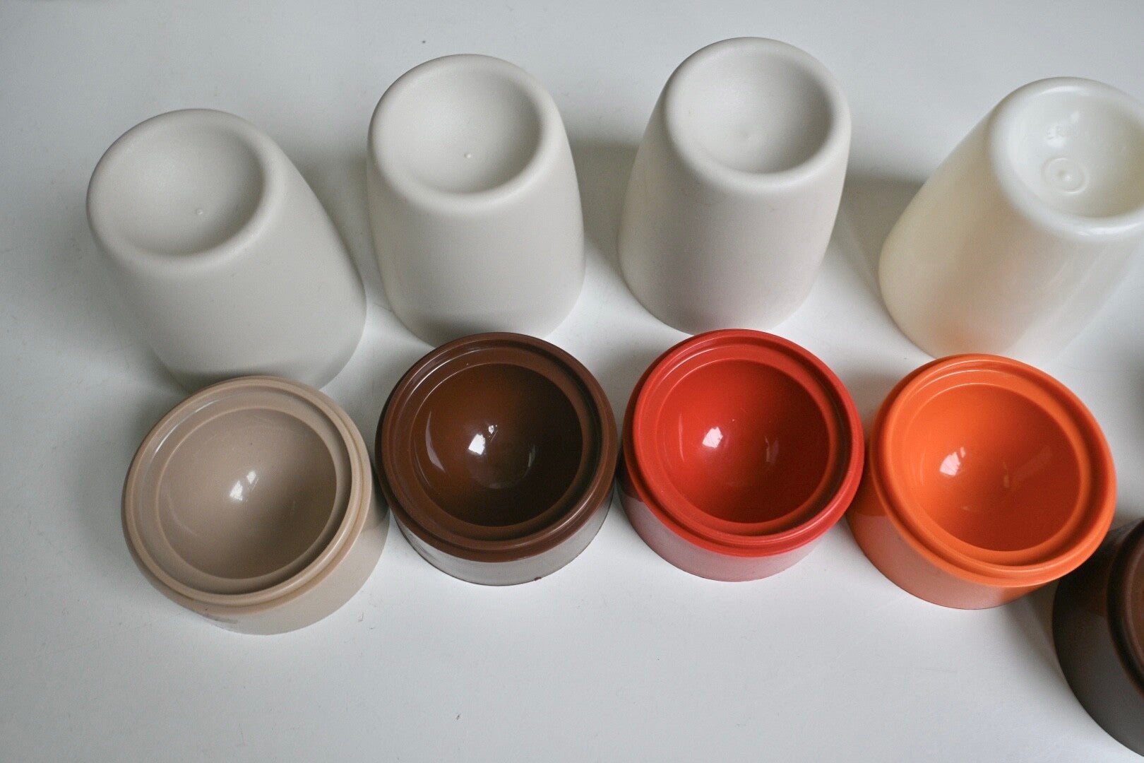 Zeven Retro eierdopjes van Tupperware, deze waren populair in de jaren '70 en '80.