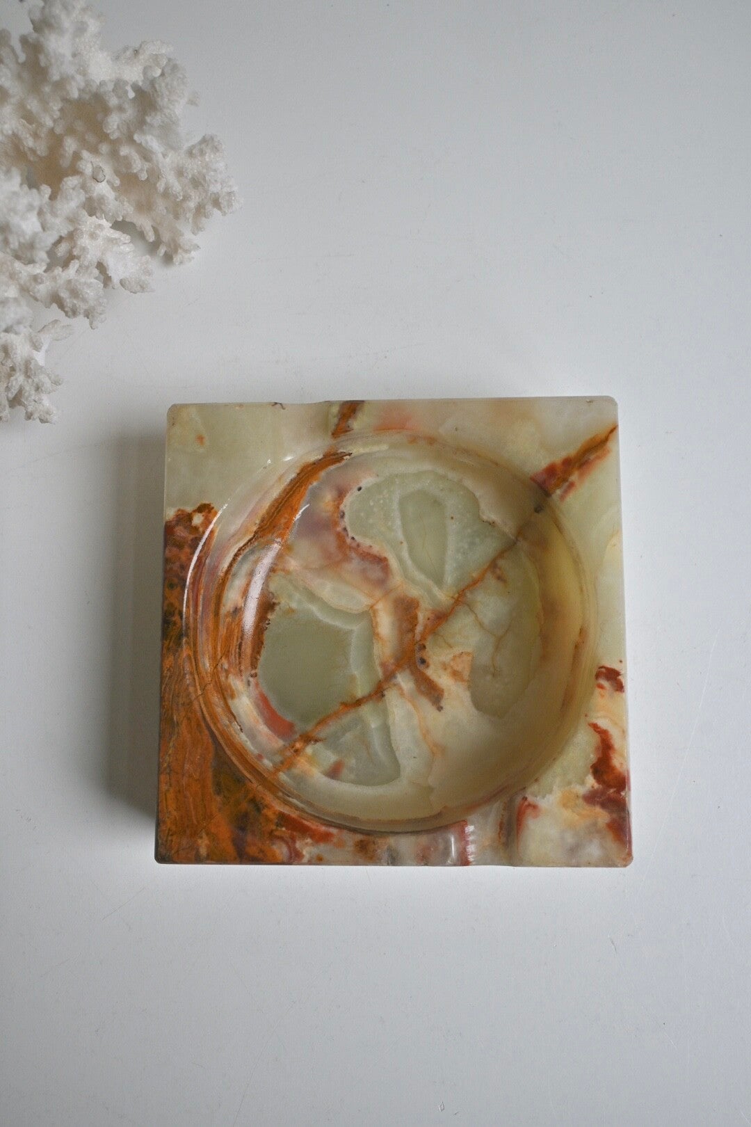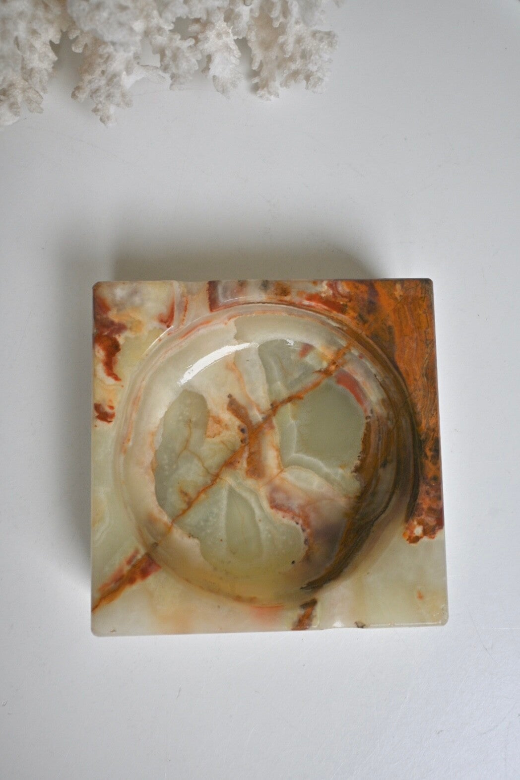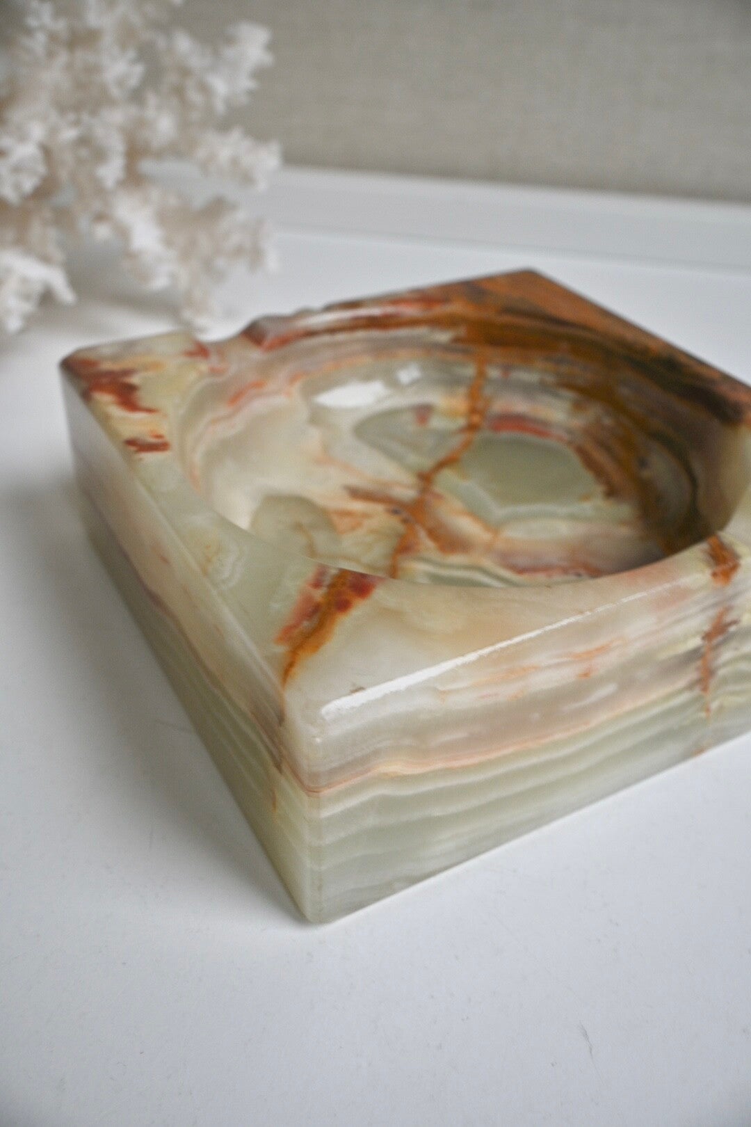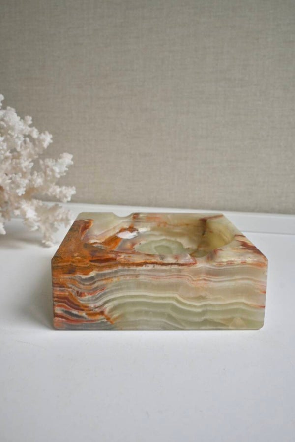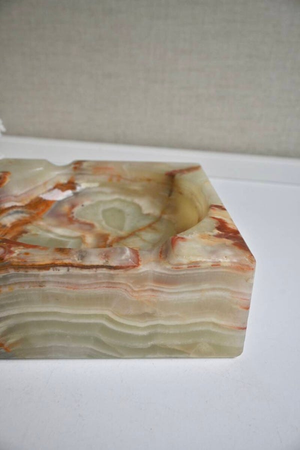 Mooie onyx marmeren asbak, ook te gebruiken als decoratief object of sleutelschaaltje.Verkeert nog in een goede staat.Dia:11cm H:3,5cm