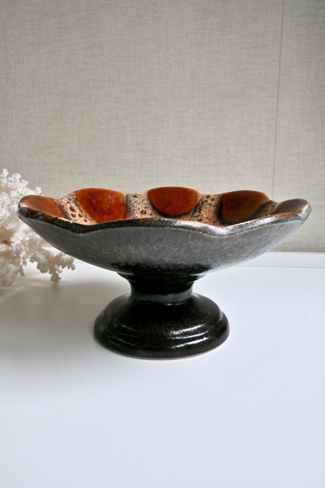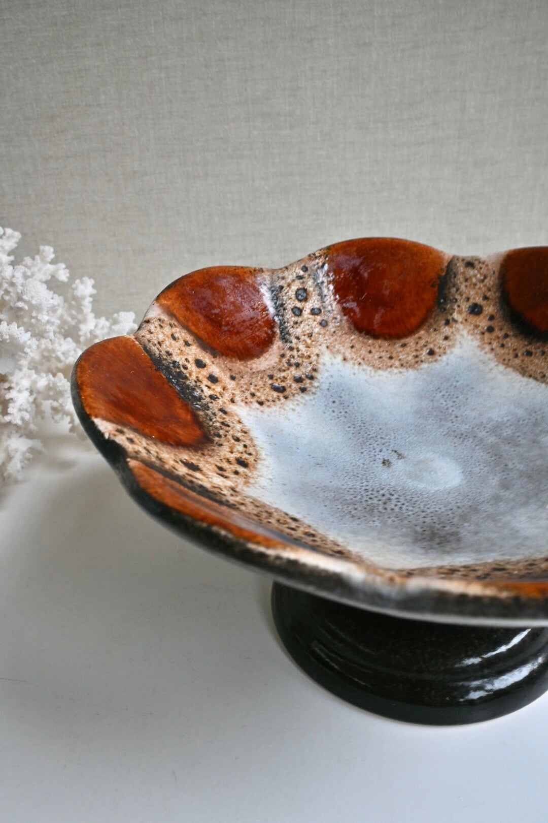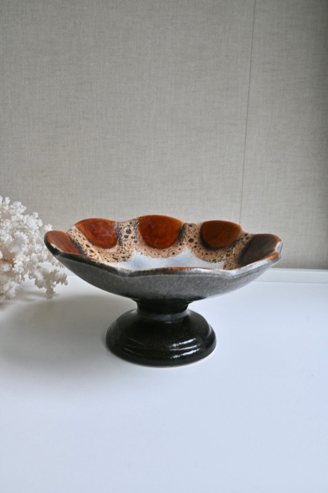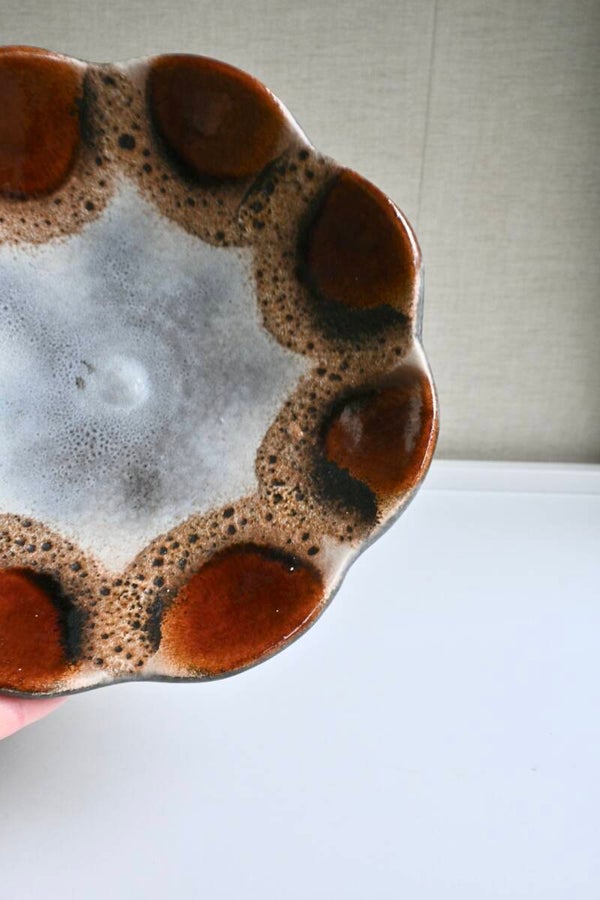 Mooie keramieken schaal bv te gebruiken als fruitschaal. De schaal staat op een hoge voet. De schaal is in de stijl van Dumler & Breiden met Fat lava glazuurH:12cm Dia:24cm