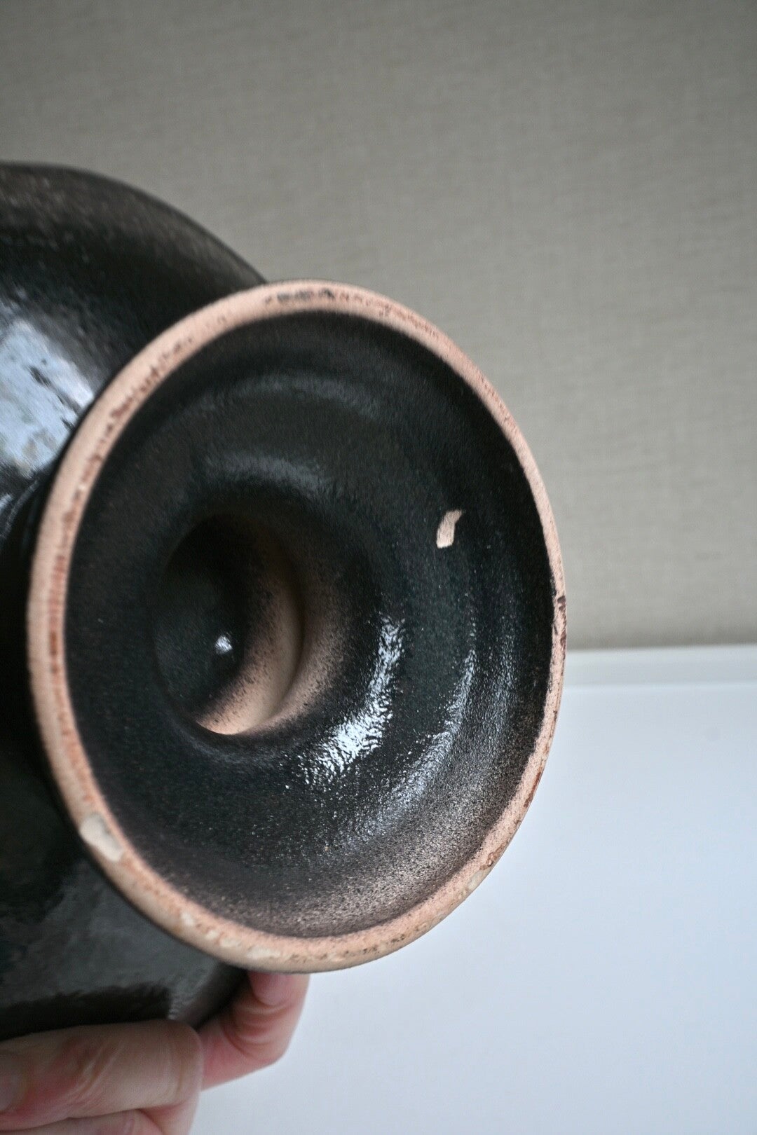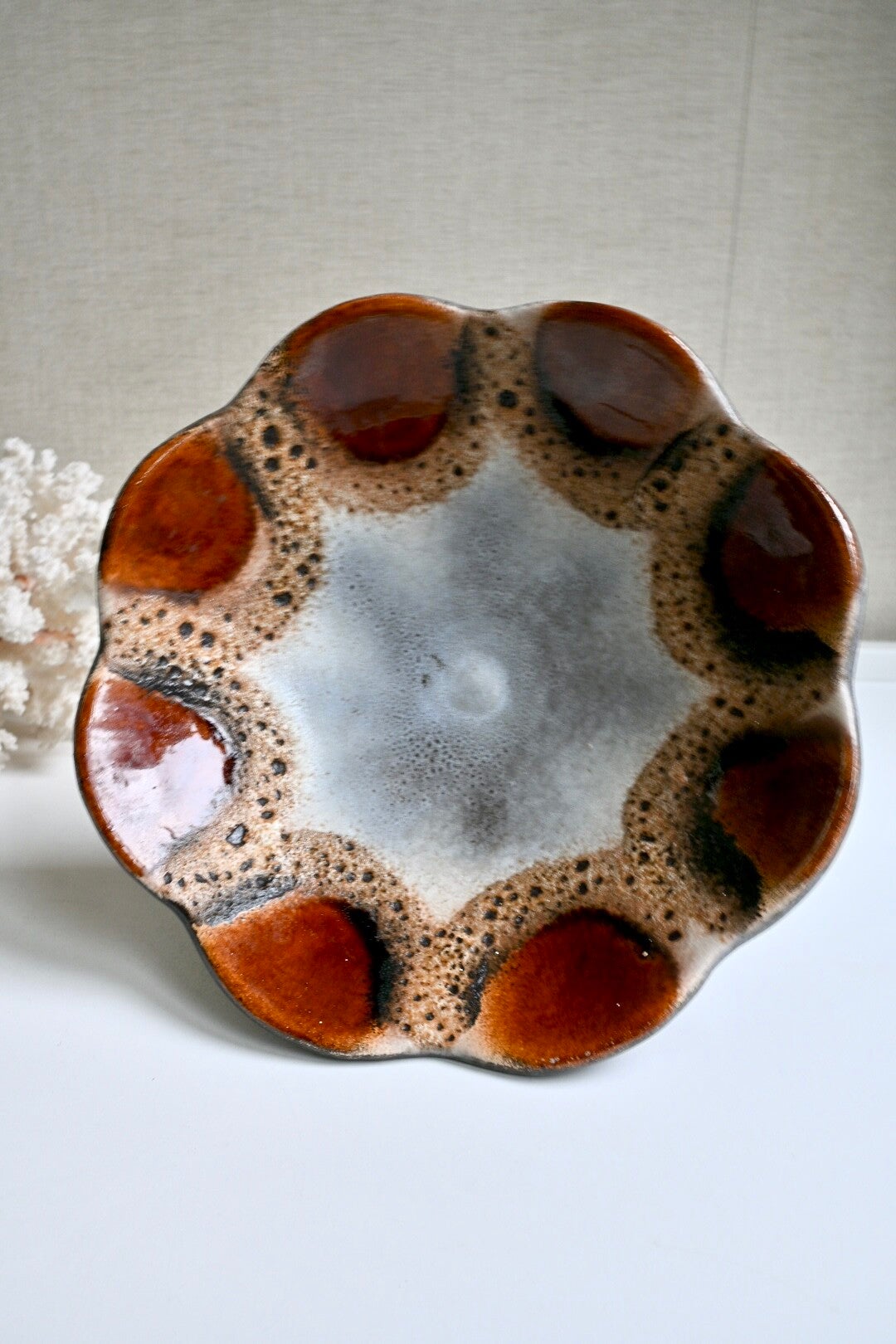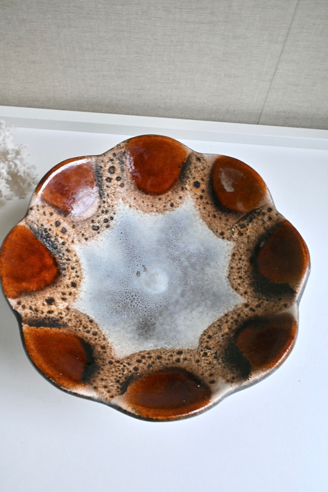 Mooie keramieken schaal bv te gebruiken als fruitschaal. De schaal staat op een hoge voet. De schaal is in de stijl van Dumler & Breiden met Fat lava glazuurH:12cm Dia:24cm