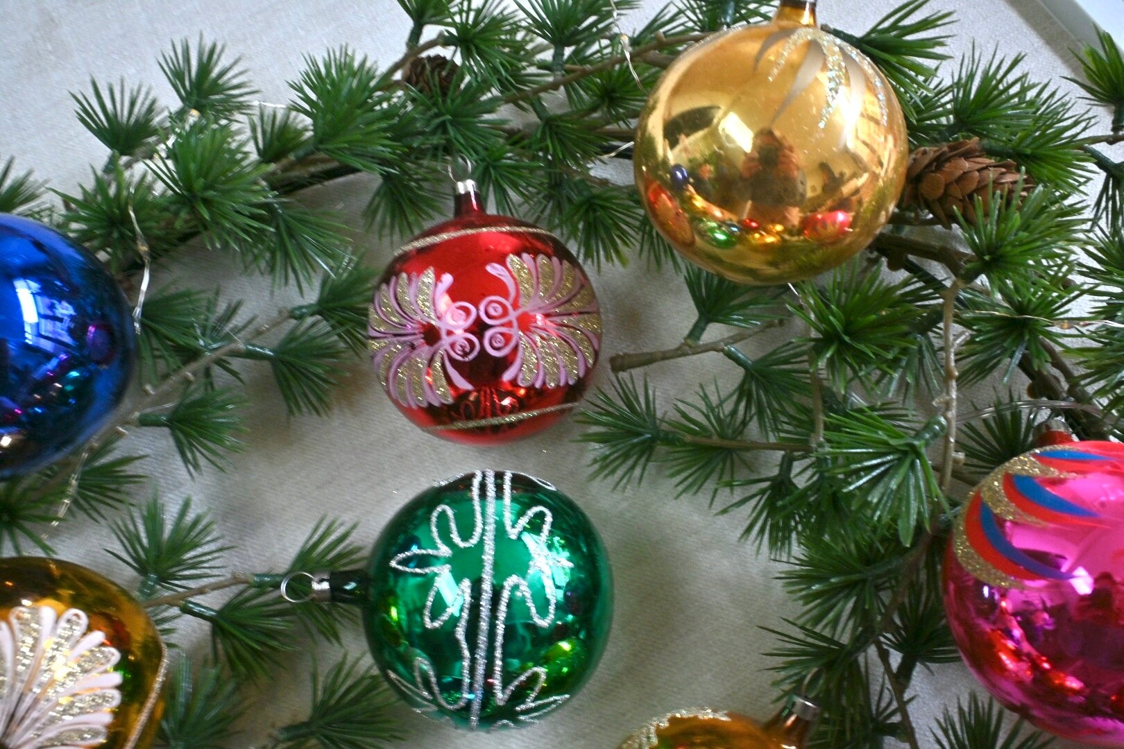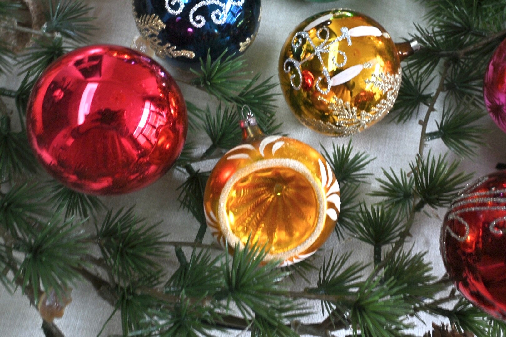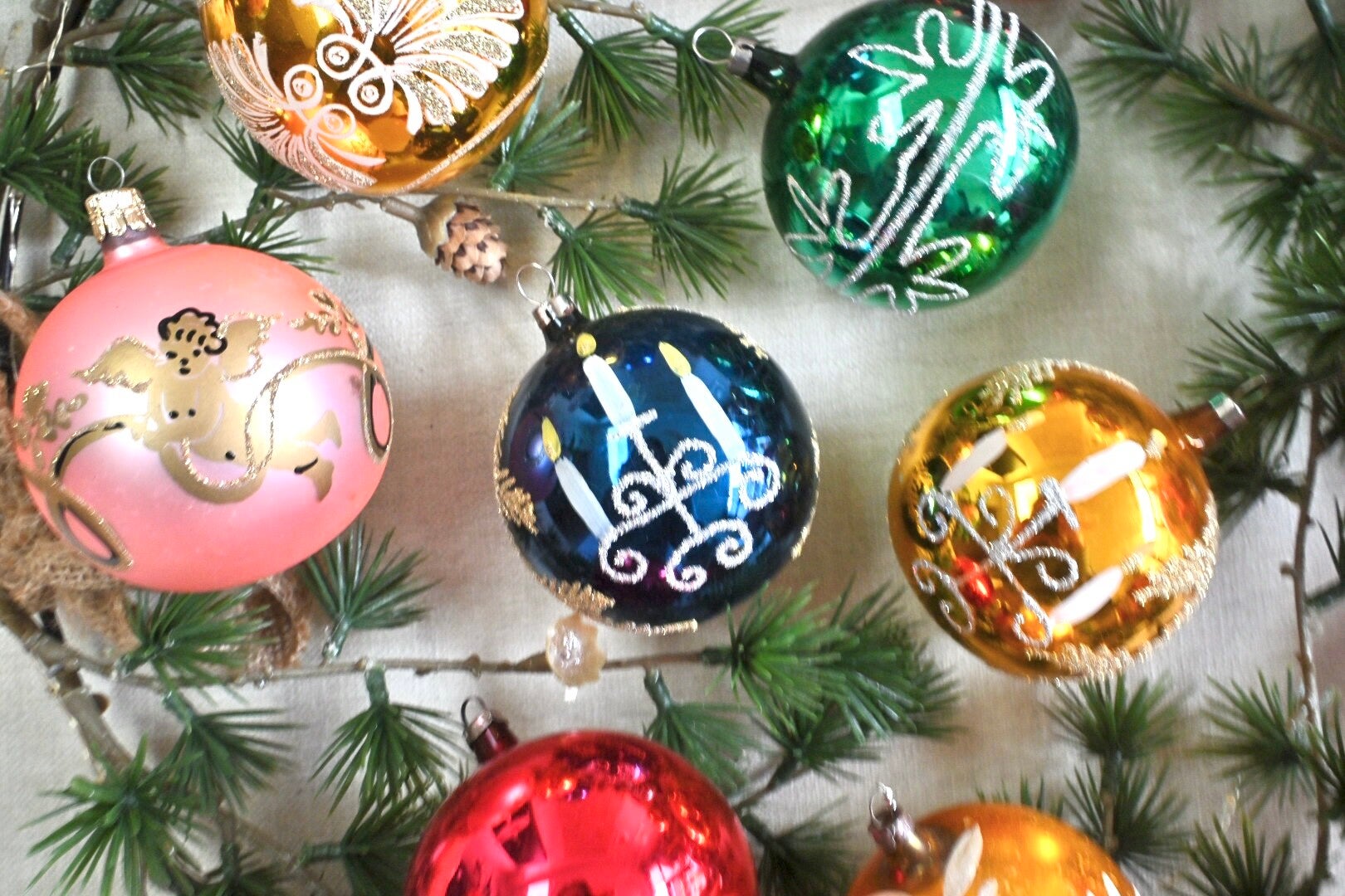 Complete doos met grote antieke gekleurde kerstballen. De kerstballen verkeren nog in een mooie staat gezien de leeftijd. In totaal zijn het 12 kerstballen incl. doos.